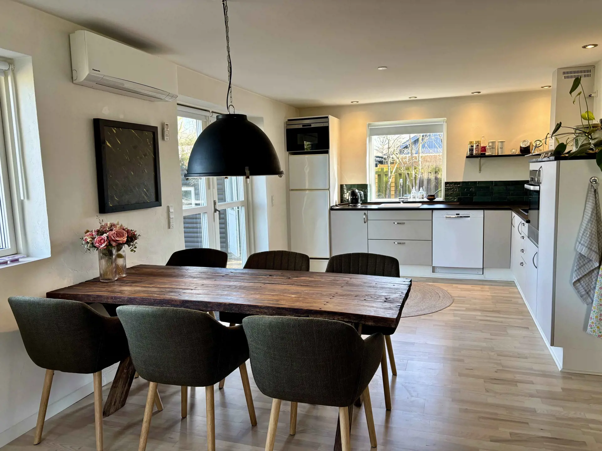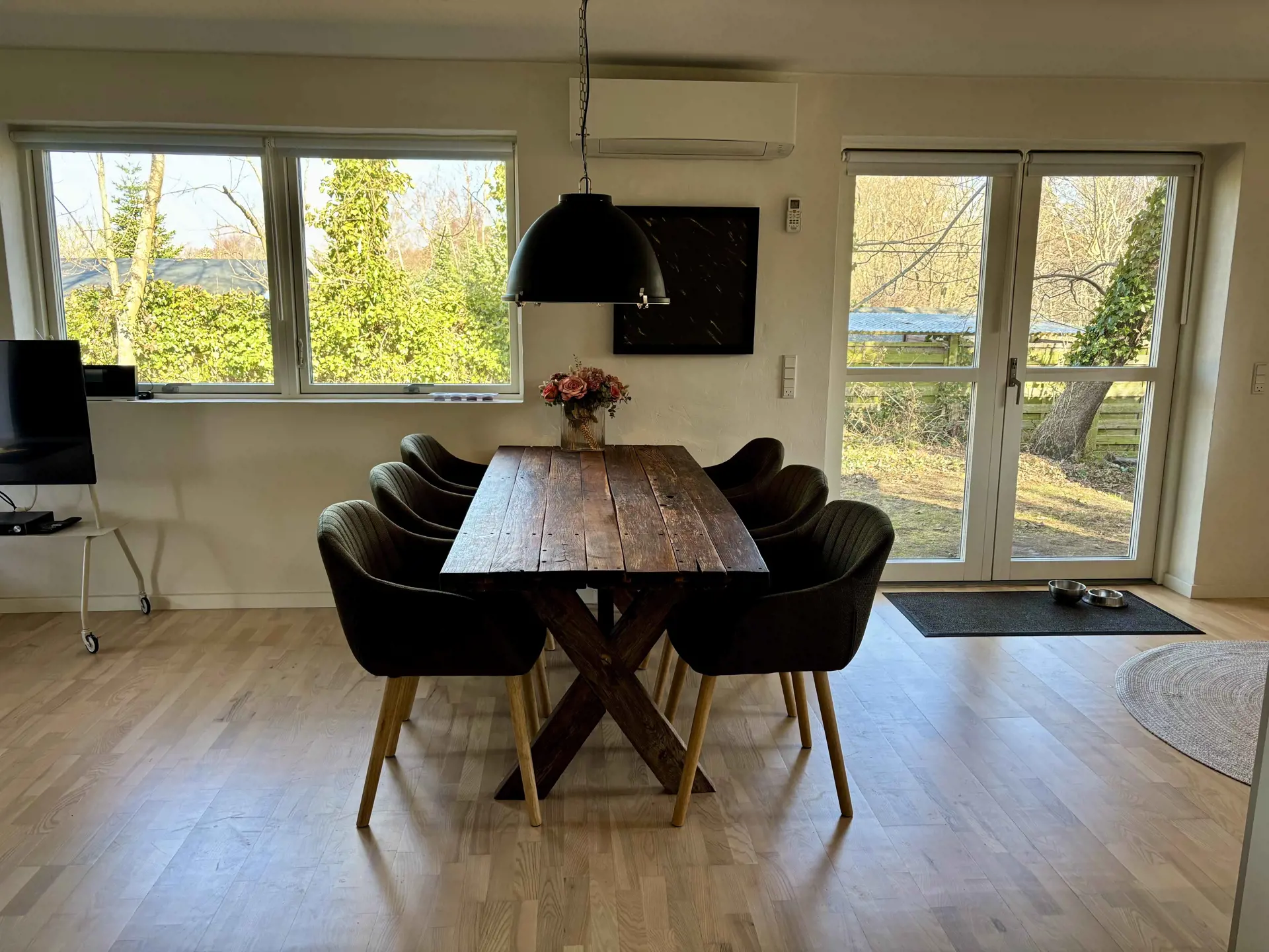 Das helle und gut eingerichtete Wohnzimmer ist mit einem großen Ecksofa sowie einem einzigartigen, rustikalen Esstisch mit viel Platz ausgestattet. Hier lassen sich entspannte Stunden in angenehmer Atmosphäre verbringen. Im Wohnzimmer steht ein Chromecast zur Verfügung, sodass Sie Ihre eigenen Streaming-Dienste nutzen können. Doppelte Glastüren führen direkt auf die schöne Terrasse mit Blick ins Grüne.
