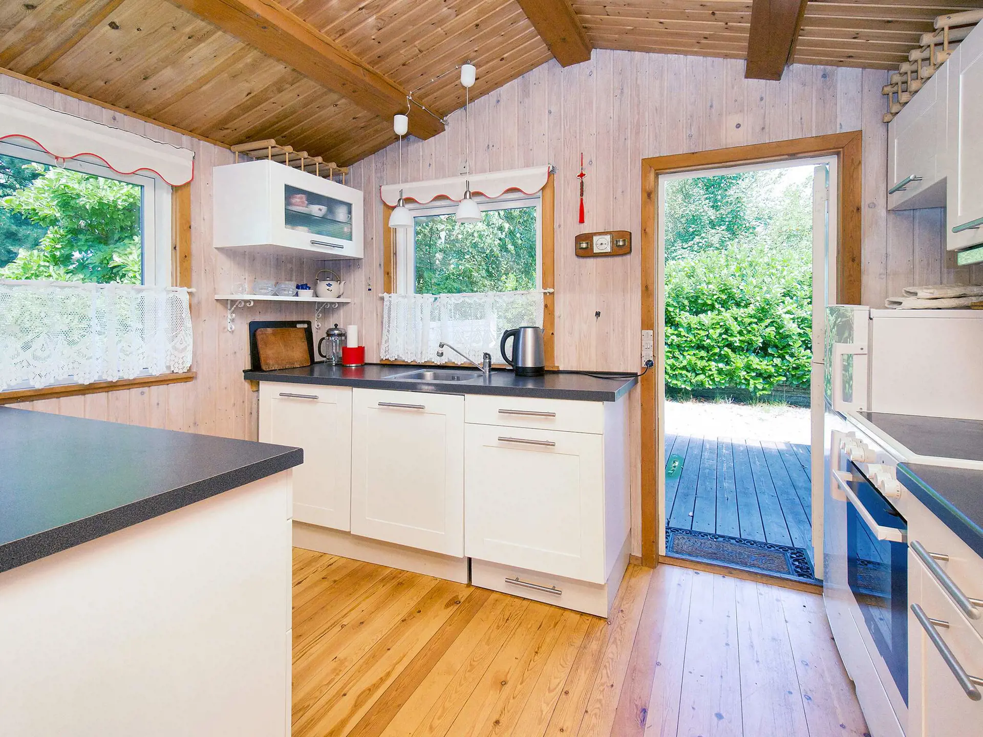 Dieses kleine, traditionelle Ferienhaus liegt auf einem schönen Naturgrundstück mit mehreren Terrassen und gemütlichen Sitzplätzen. Sie betreten direkt die Küche, die zum kleinen Wohnzimmer, in dem es eine Einzelaufbettung gibt, hin offen ist. Weiterhin gibt es zwei Schlafzimmer. Die Einrichtung ist einfach aber behaglich. Obwohl es ein älteres Haus ist, sind Annehmlichkeiten wie Spülmaschine und Internet vorhanden. Von der überdachten Hauptterrasse können Sie den Seerosenteich am Ende des Grundstücks überschauen. Für Kinder gibt es ein Spielhäuschen. Das Haus liegt in einem angenehmen Ferienhausgebiet nur ein paar Autominuten vom Wasser entfernt.