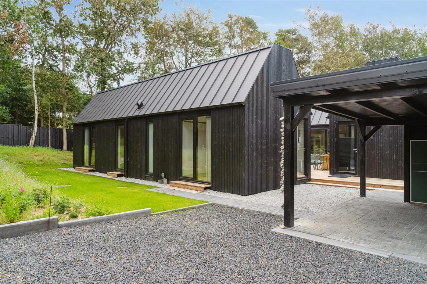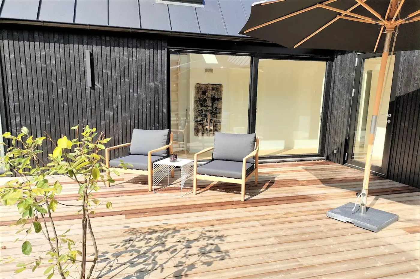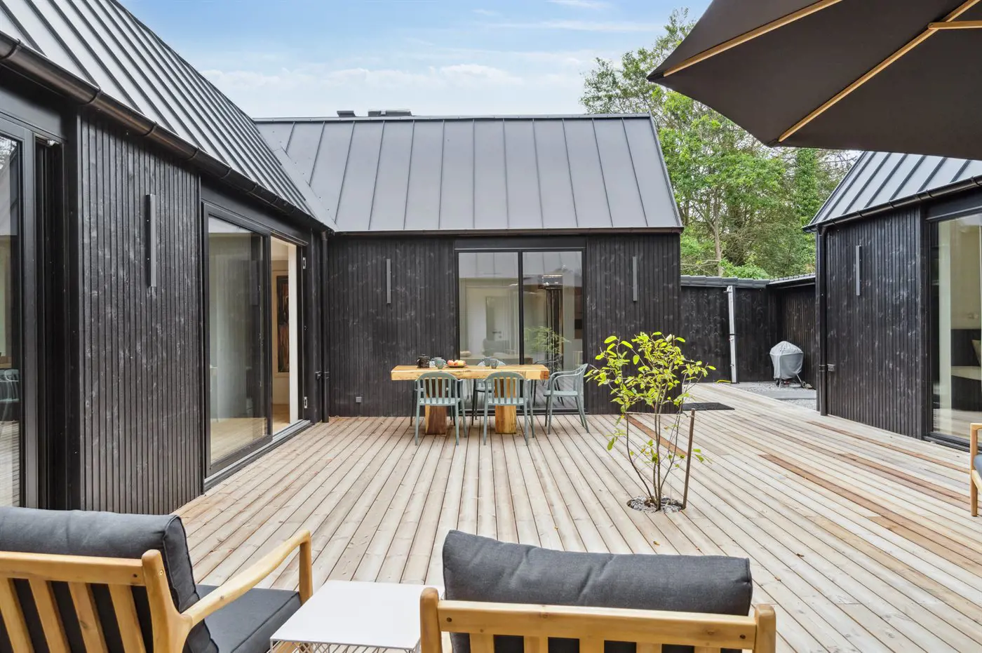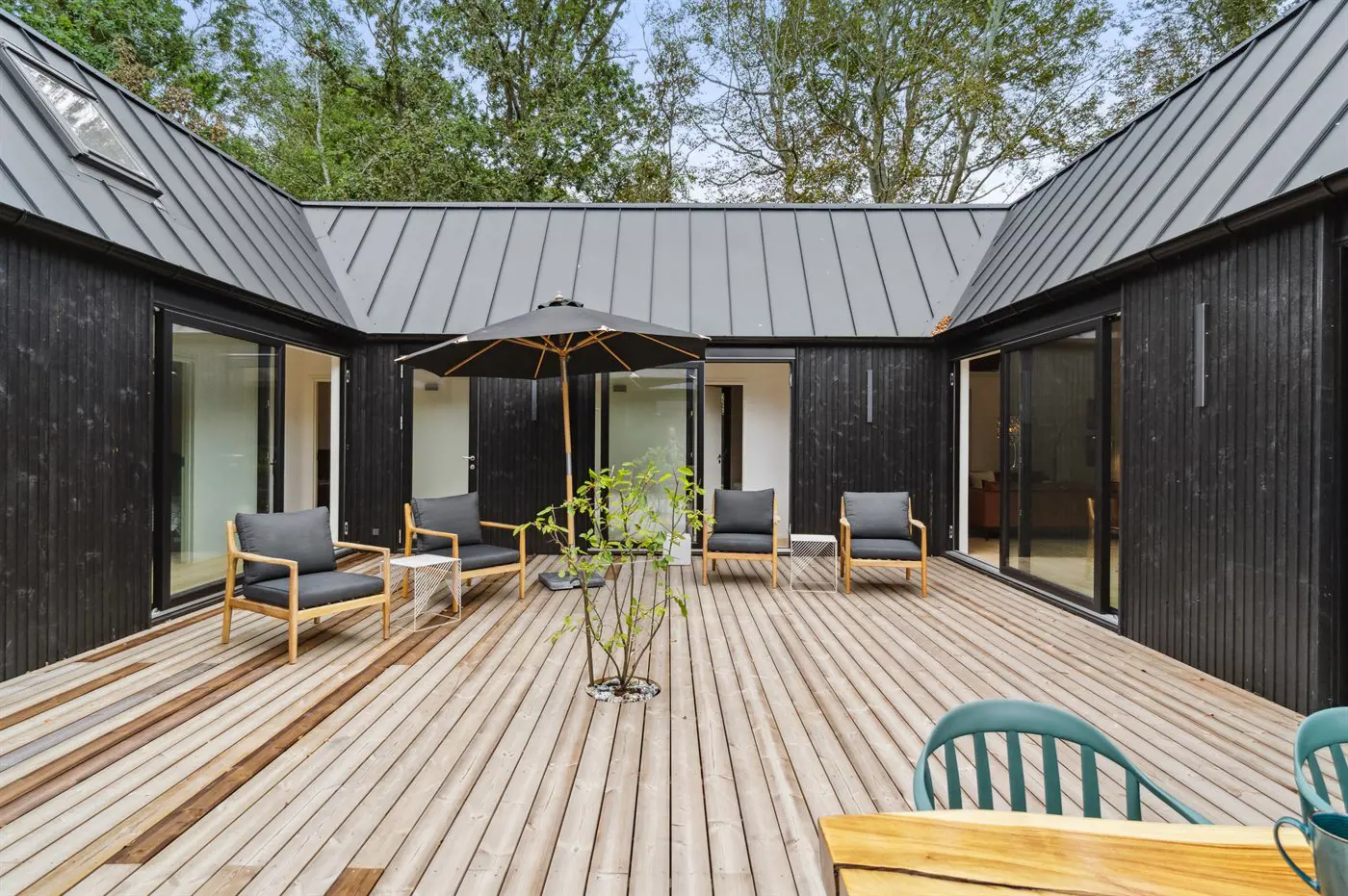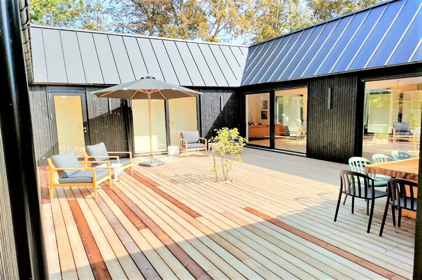 Das Haus besteht aus vier Seiten, in deren Mitte ein fantastischer Innenhof liegt, in dem man immer ein windgeschütztes Plätzchen findet. Das Haus wurde aus hochwertigen Materialien erbaut und besticht mit reichlich Luxus: Das Haus hat überall Fußbodenheizung, die über eine energiesparende Luft-Wasser-Wärmepumpe betrieben wird, eine Sauna und ist dank der großen Fensterfronten und der hohen Decken lichtdurchflutet und großzügig. Das gesamte Haus ist modern und stilvoll eingerichtet.