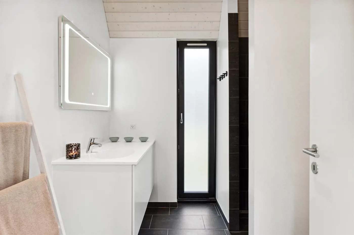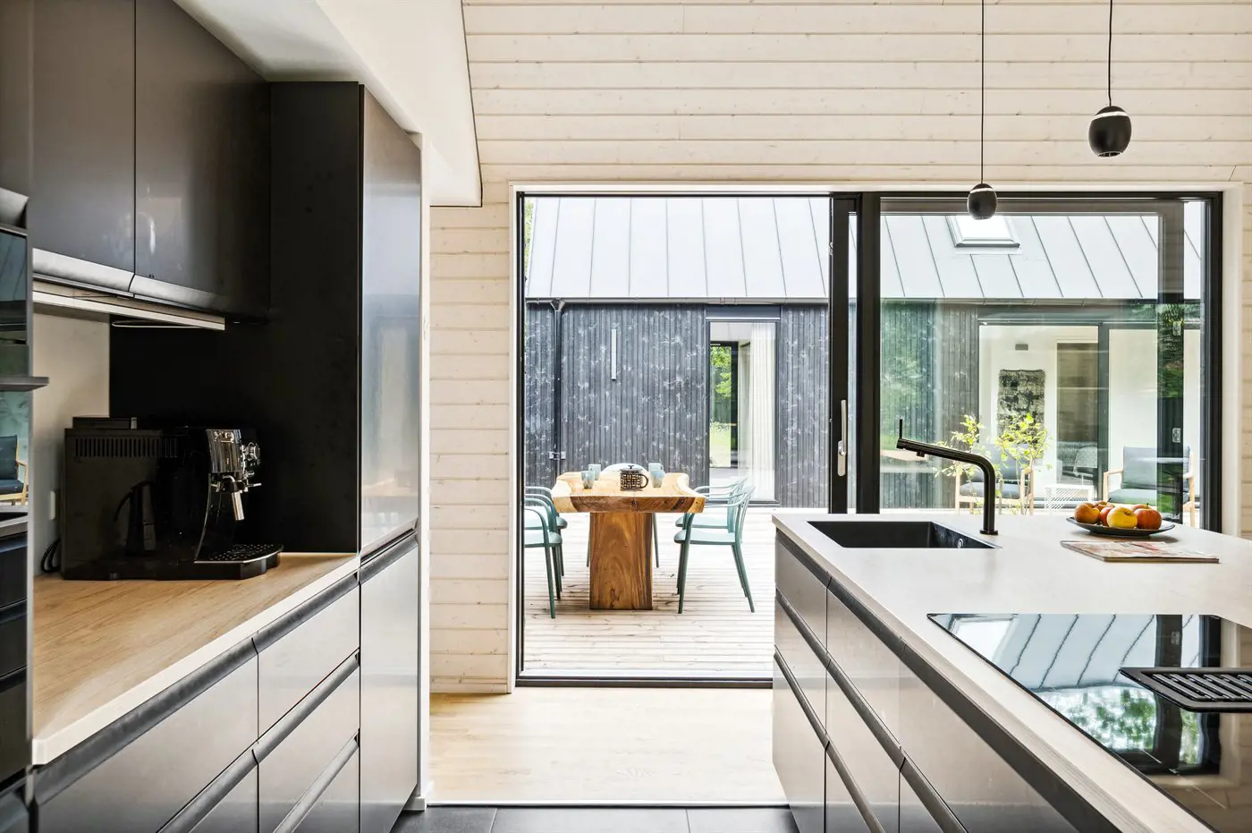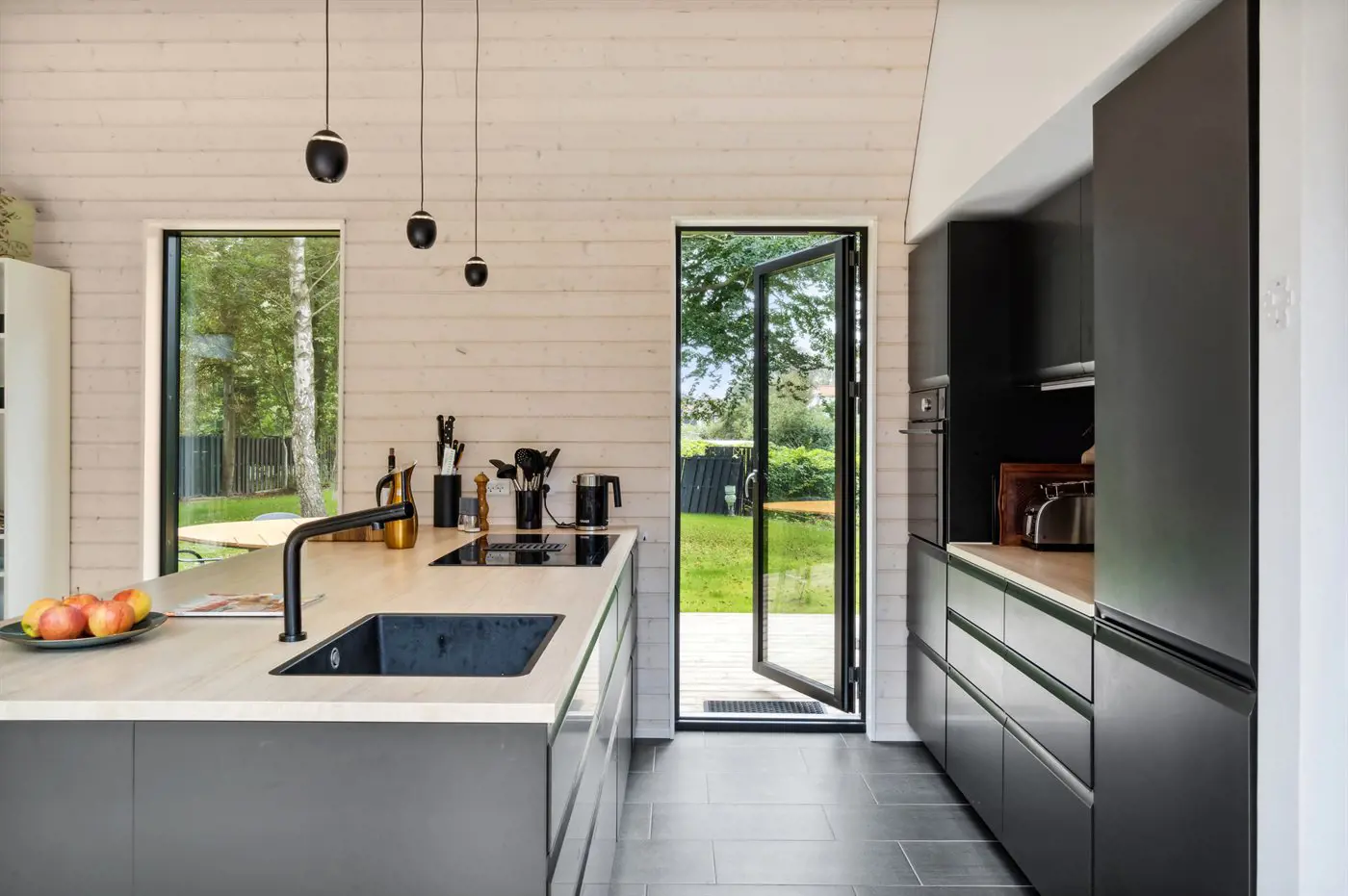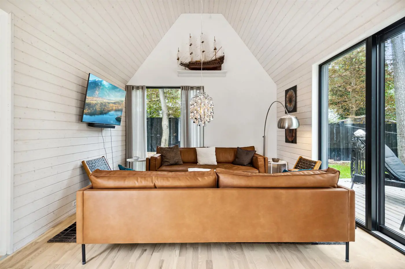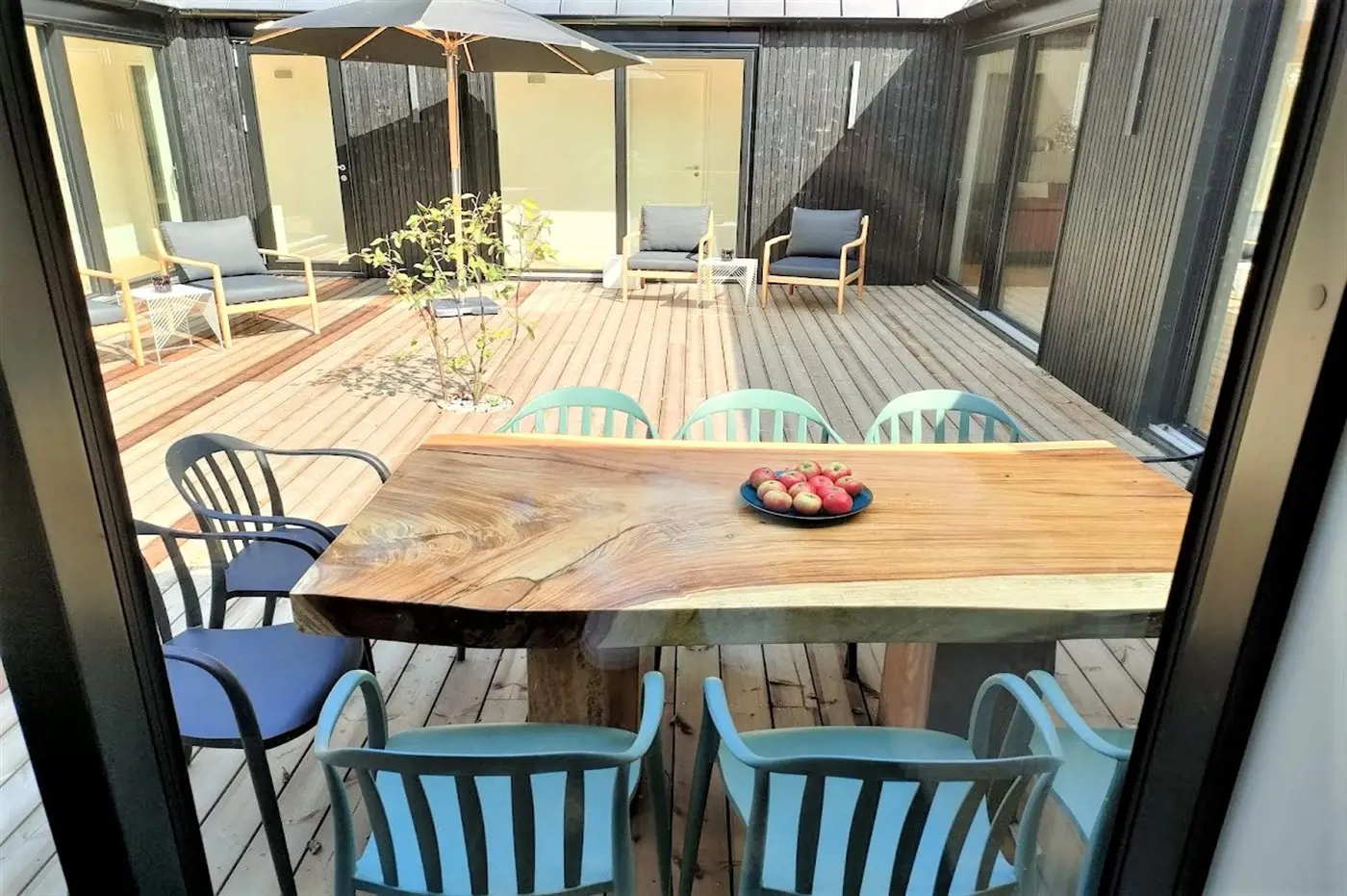 Das Haus besteht aus vier Seiten, in deren Mitte ein fantastischer Innenhof liegt, in dem man immer ein windgeschütztes Plätzchen findet. Das Haus wurde aus hochwertigen Materialien erbaut und besticht mit reichlich Luxus: Das Haus hat überall Fußbodenheizung, die über eine energiesparende Luft-Wasser-Wärmepumpe betrieben wird, eine Sauna und ist dank der großen Fensterfronten und der hohen Decken lichtdurchflutet und großzügig. Das gesamte Haus ist modern und stilvoll eingerichtet.