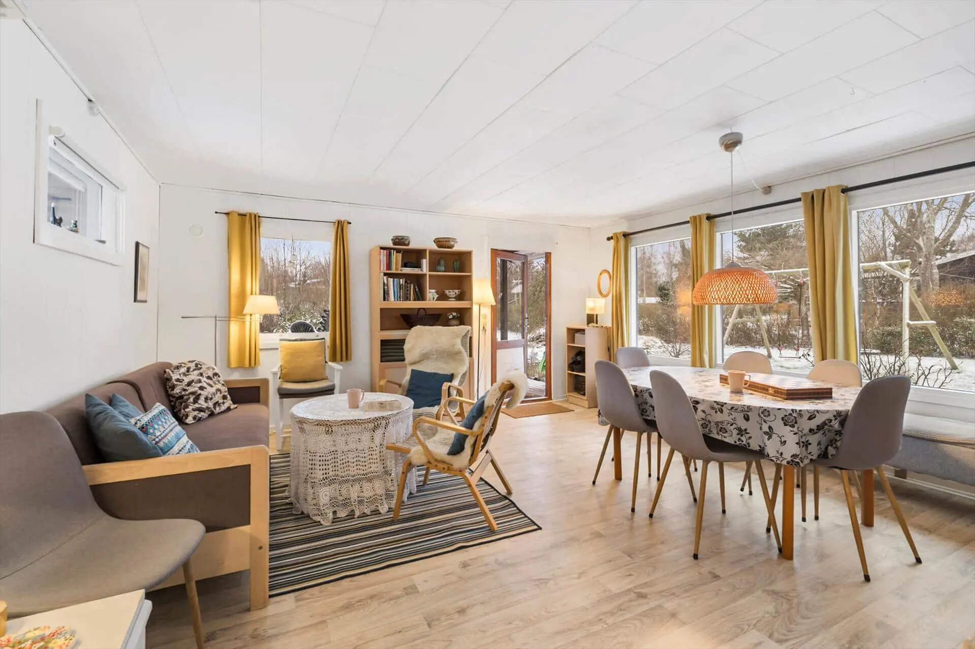 Vom Wohnzimmer aus gelangen Sie auf die überdachte Terrasse. Hier können Sie Ihre Mahlzeit genießen, sich hinsetzen und eine Tasse Kaffee trinken, während die Kinder im Garten spielen. Es gibt ein Trampolin, eine Schaukel und vieles mehr. Die ganze Familie hat hier viel Platz zum Spielen.