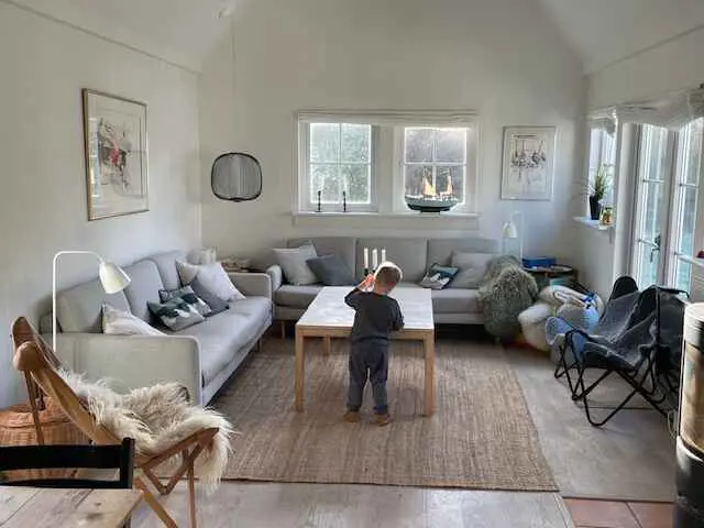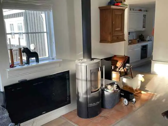 Das 125 m² große Haus verfügt über ein helles, geräumiges Wohnzimmer mit Kaminofen, Essbereich für 8 Personen und hohen Decken.