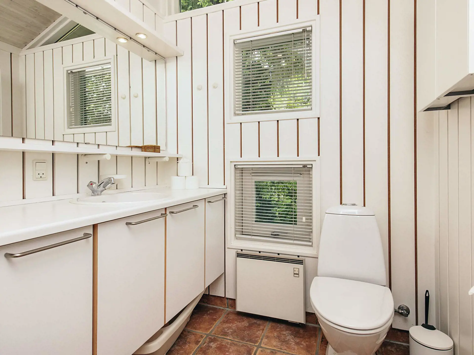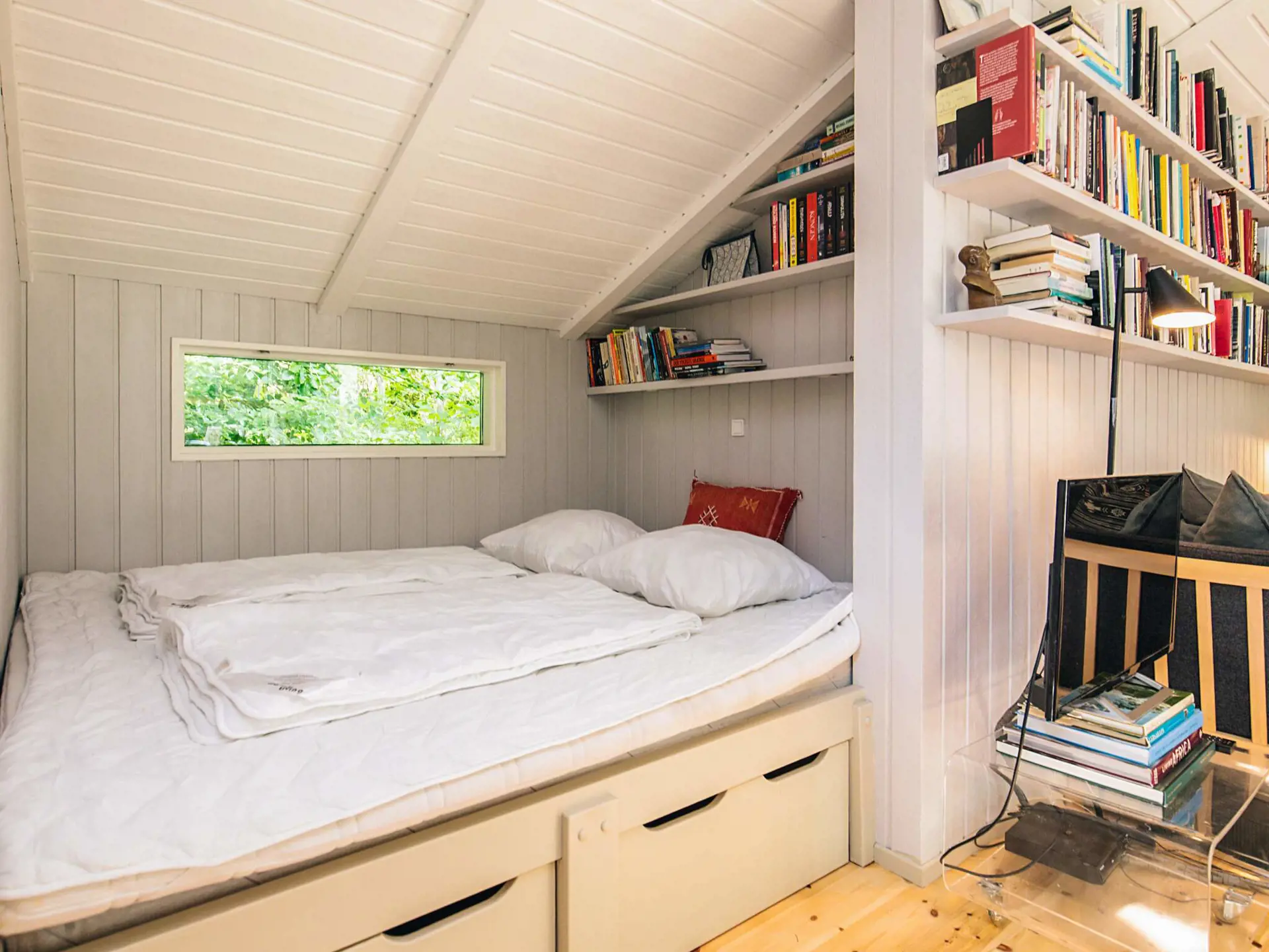 Es gibt zudem drei Schlafzimmer mit jeweils einem Doppelbett sowie einen gemütlichen Alkoven mit doppelter Schlafcouch im Haus. Ebenso Kinderbett und Hochstuhl für den jüngsten Gast bereit. Badezimmer mit Dusche und angenehmer Fußbodenheizung. Beheizt wird das Ferienhaus ggf. mit einer klimafreundlichen Luft-Luft-Wärmepumpe.