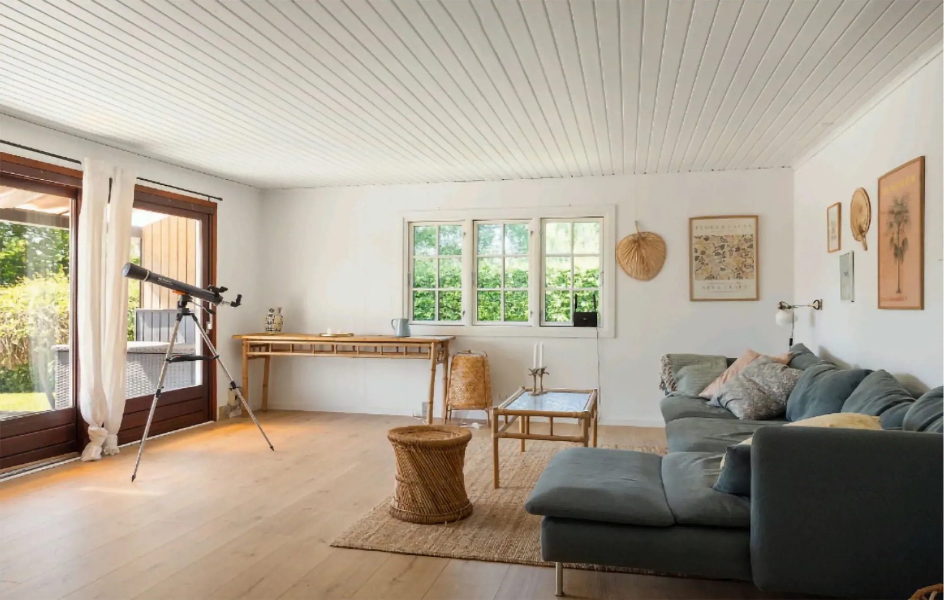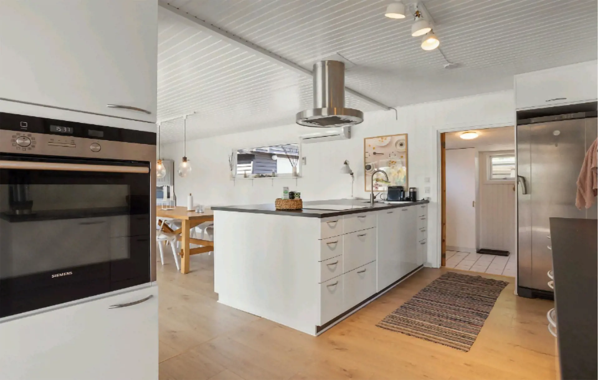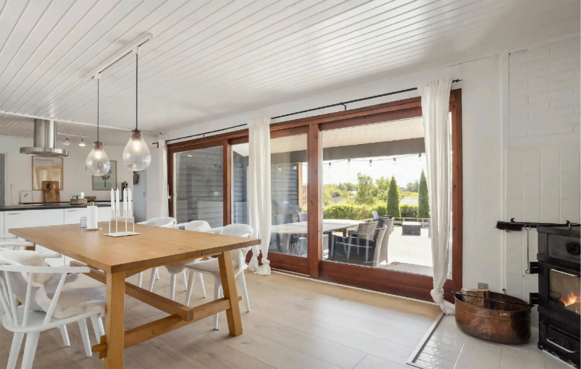 Betreten Sie das helle Innere des Hauses und fühlen Sie sich sofort willkommen. Entspannen Sie im großzügigen Wohnbereich auf dem bequemen Sofa und genießen Sie die wohlige Wärme des Kaminofens. Bereiten Sie Ihre Mahlzeiten in der modernen Küche mit Kochinsel zu und genießen Sie diese am großen Esstisch, der wie geschaffen für gemeinsame Stunden ist. Durch die großen Fensterfronten fällt viel Licht in die Räume und schafft eine angenehme, offene Atmosphäre.