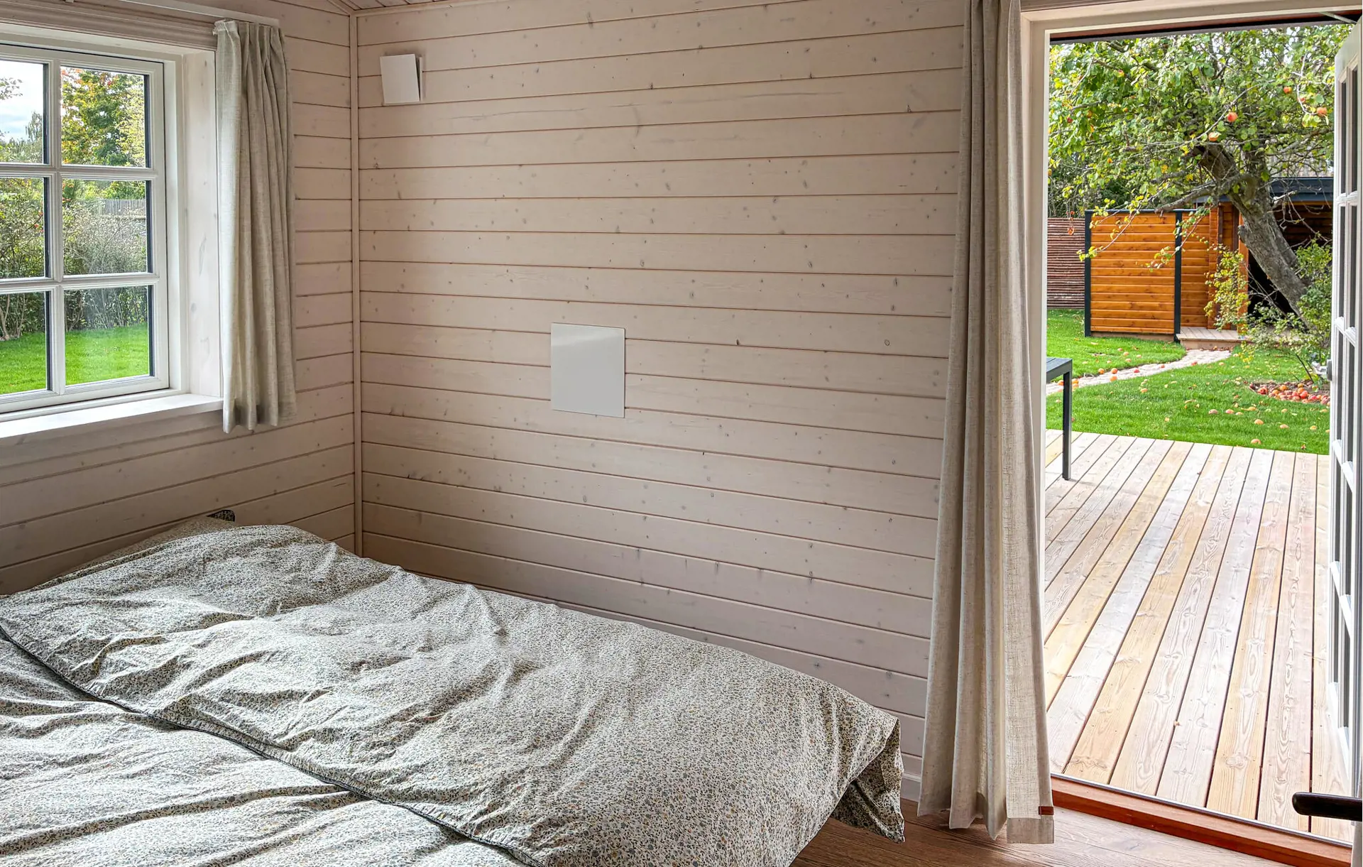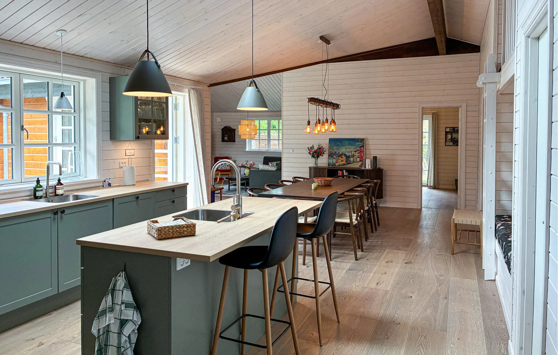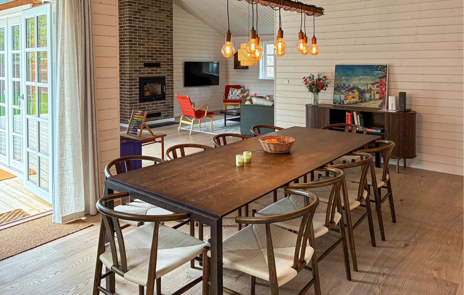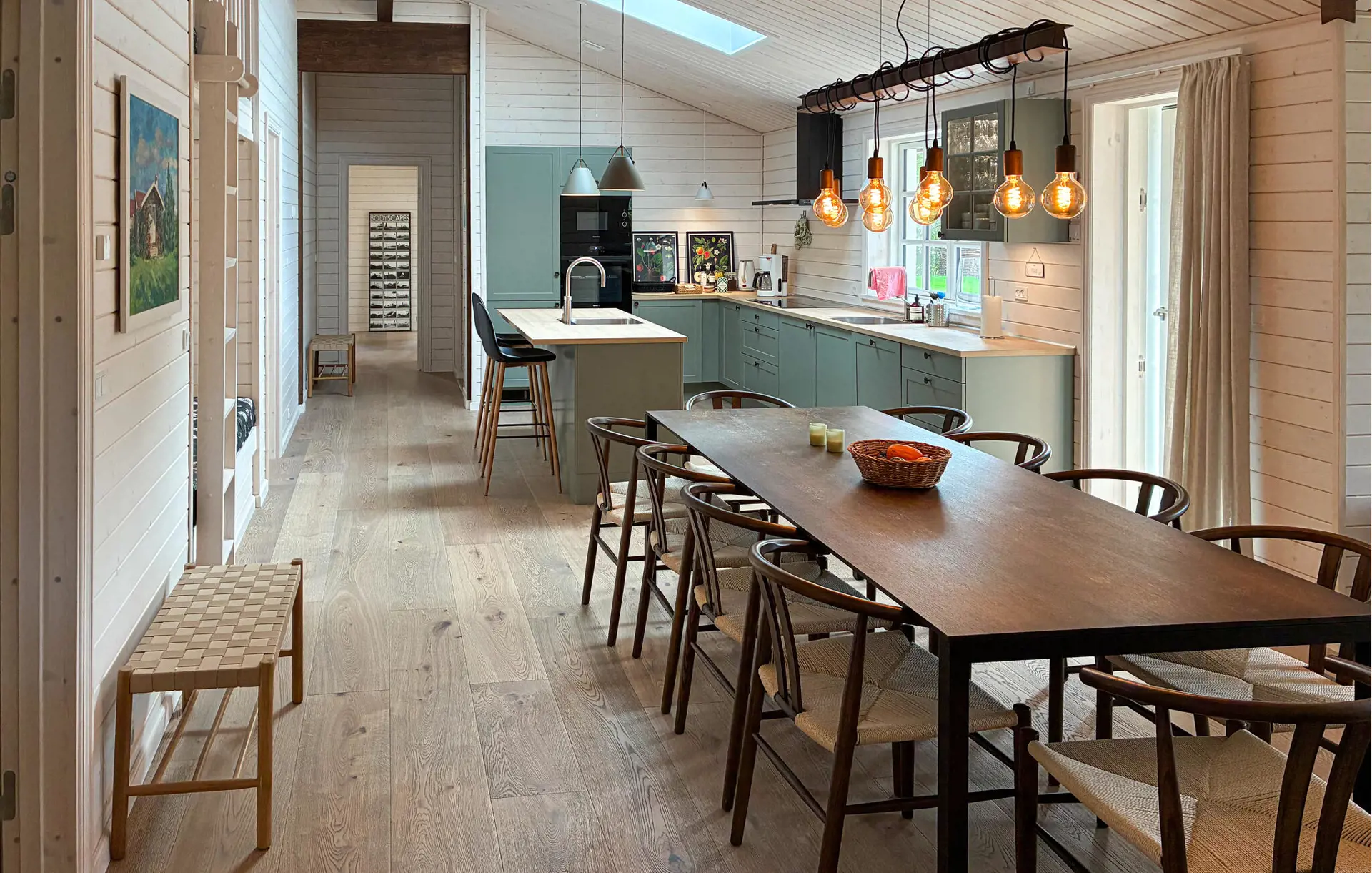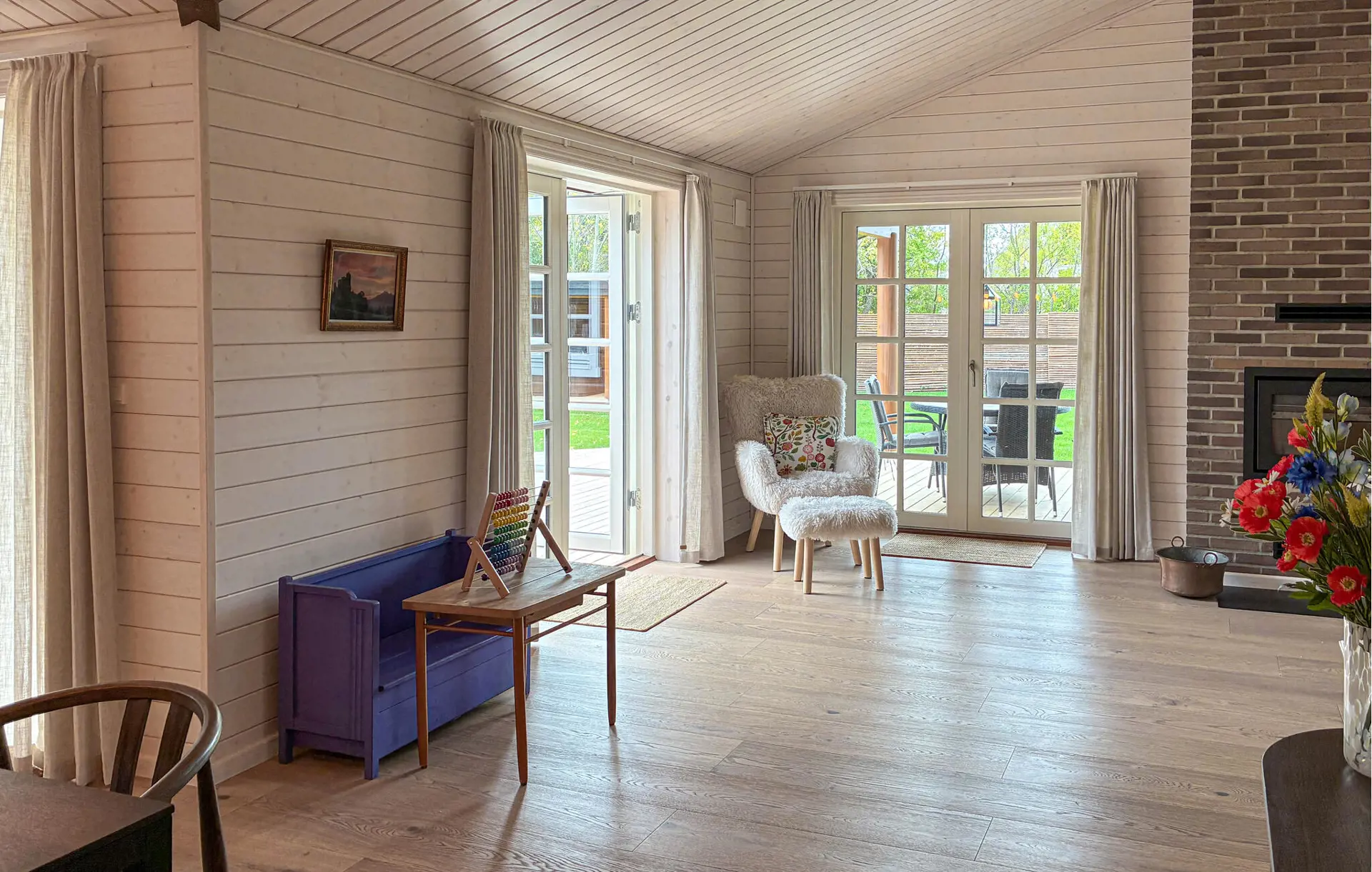 In diesem Haus verbinden sich nordischer Charme und moderne Behaglichkeit zu einem harmonischen Ganzen. Holzverkleidete Wände, natürliche Farben und liebevolle Details schaffen eine warme, wohnliche Atmosphäre. Machen Sie es sich im gemütlichen Wohnbereich am Kamin bequem, lesen Sie ein gutes Buch oder genießen Sie eine Tasse Kaffee. In der modernen, offen gestalteten Küche bereiten Sie gemeinsam köstliche Mahlzeiten zu und lassen den Tag anschließend in entspannter Runde ausklingen.
