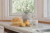 Die Küche ist mit Kühlschrank ausgestattet. Außerdem gibt es 4 Keramik-Kochfelder, Umluftofen, Mikrowelle sowie Geschirrspüler.