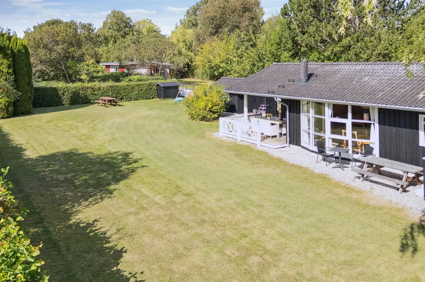 Die Ferienunterkunft liegt auf einem 1184 m² großen Gartengrundstück. Die Entfernung zum Meer beträgt 575 m. Die nächste Einkaufsmöglichkeit liegt 1700 m entfernt. Es steht ein offenes Terrassenareal zur Verfügung. Außerdem gibt es überdachte Terrasse. Schaukel. Kinderspielhaus. Es steht ein Grill zur Verfügung. Parkplatz auf dem Grundstück.