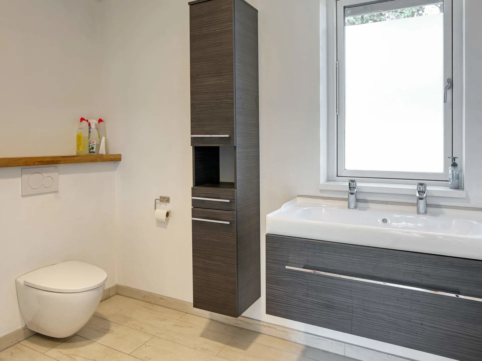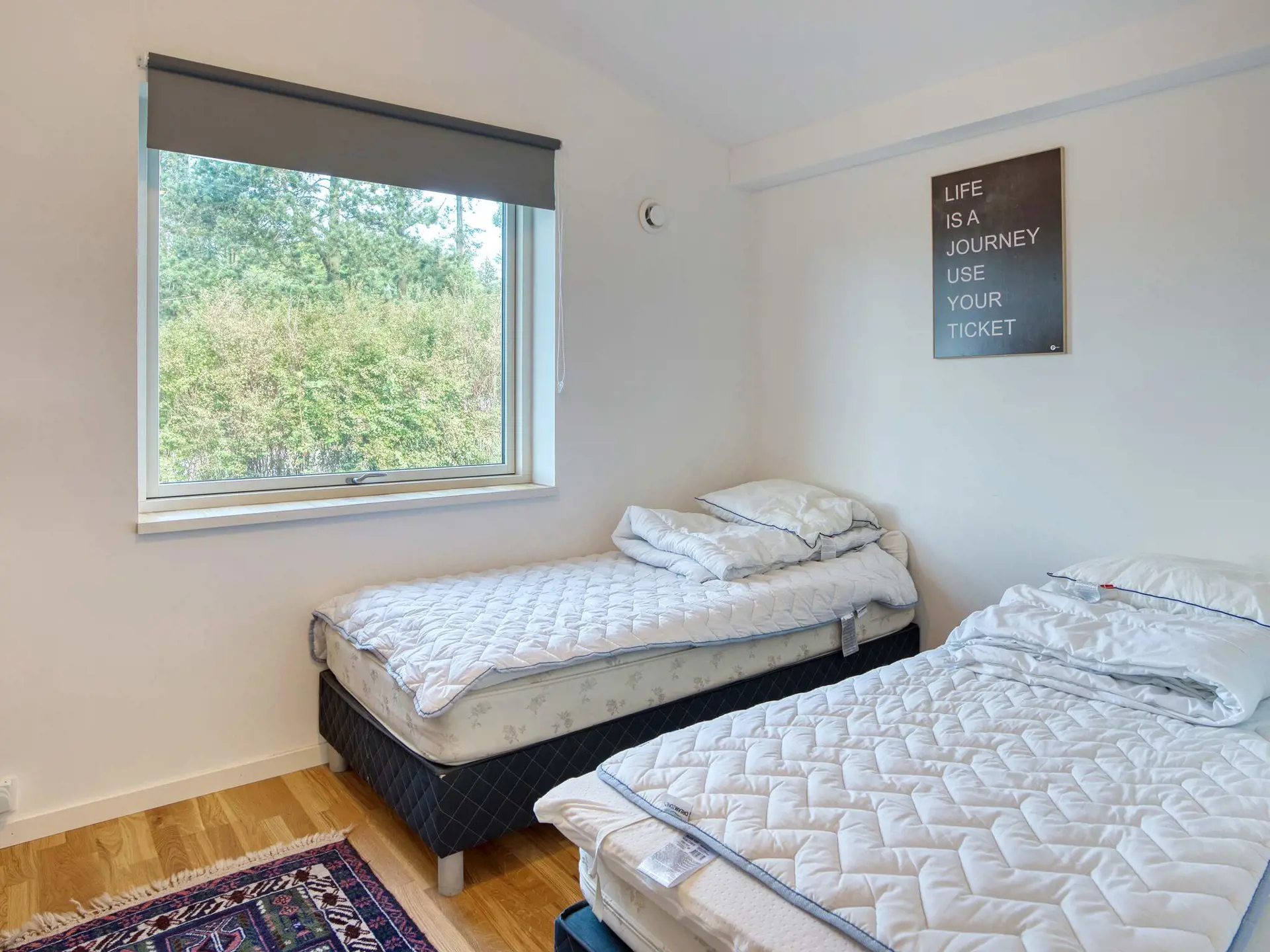 Das moderne Ferienhaus ist geschmackvoll eingerichtet und in jeder Hinsicht einladend. Es bietet einen großen, hellen und offenen Küchen-/Wohnbereich für das Familienleben, mit offener Zimmerdecke bis zum First und daher luftigem Ambiente. Es gibt drei geräumige Schlafzimmer mit jeweils einem Doppelbett im Haus, zudem ein viertes Zimmer mit einem Etagenbett für zwei Personen sowie einem Einzelbett. Außerdem Eingangsdiele und Badezimmer sowie kombinierter Hauswirtschaftsraum / Toilette im Haus.