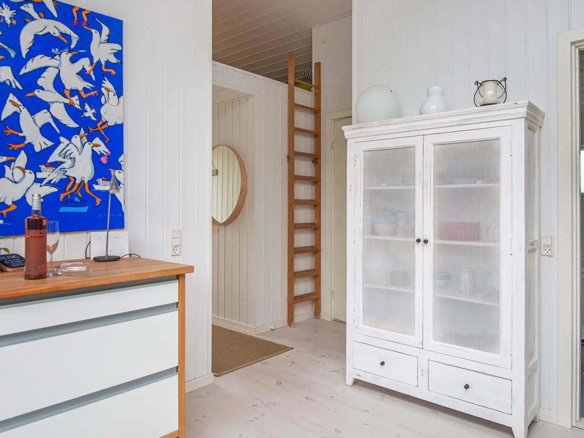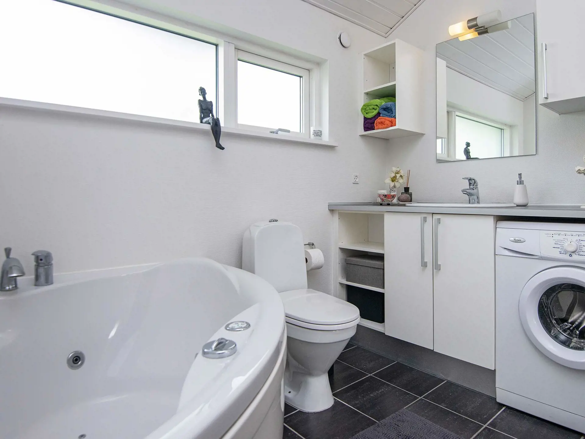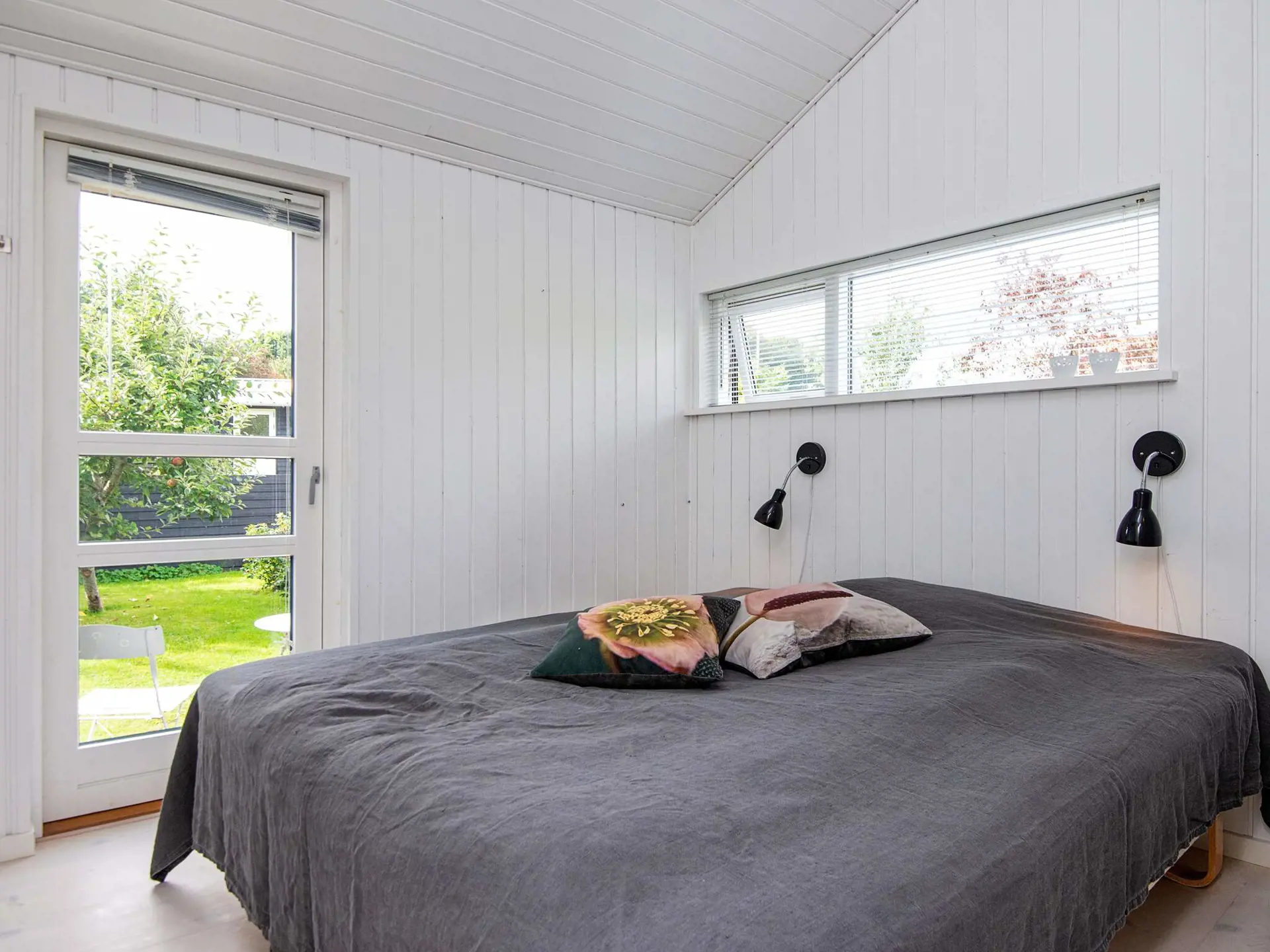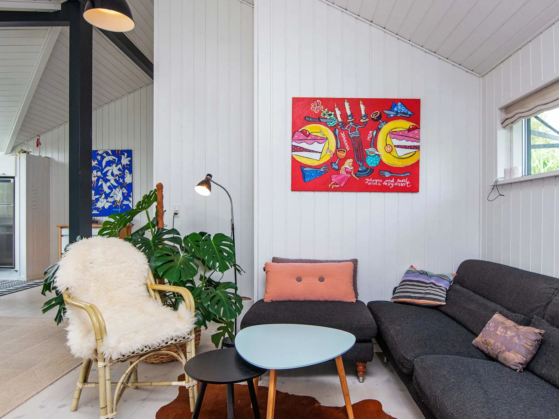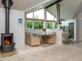 Das Ferienhaus ist hell und wohnlich eingerichtet und hat eine geräumige Wohnküche für das Familienleben, mit Holzofen für die kühlere Jahreszeit. Es gibt zwei Schlafzimmer mit einem Doppebett bzw. zwei Einzelbetten sowie einen Hems oben unter der Dachschräge und ein Schlafsofa für eine Person im Wohnzimmer. Geräumiges Badezimmer mit Whirlpool und Dusche sowie Gäste-WC im Haus.