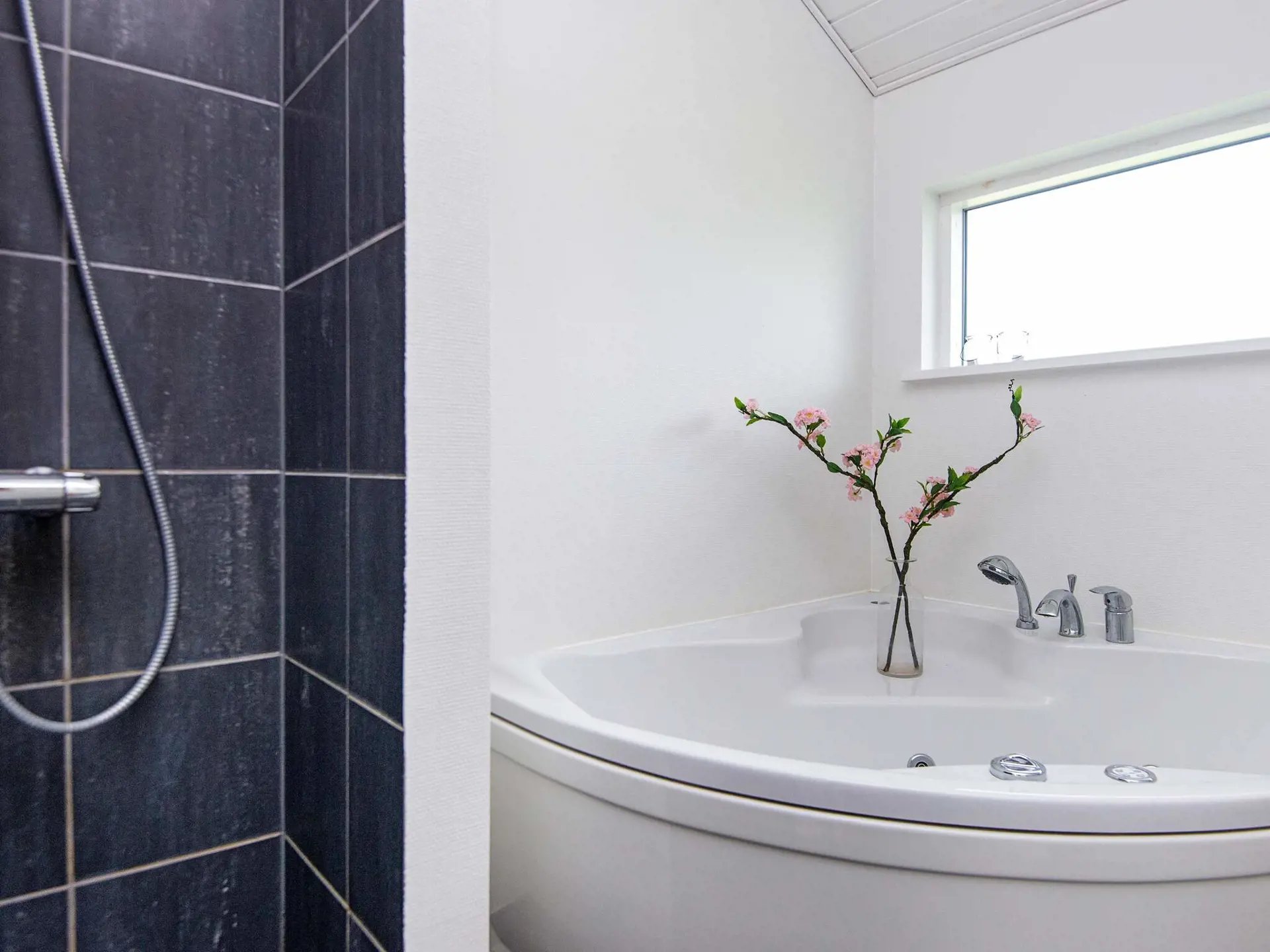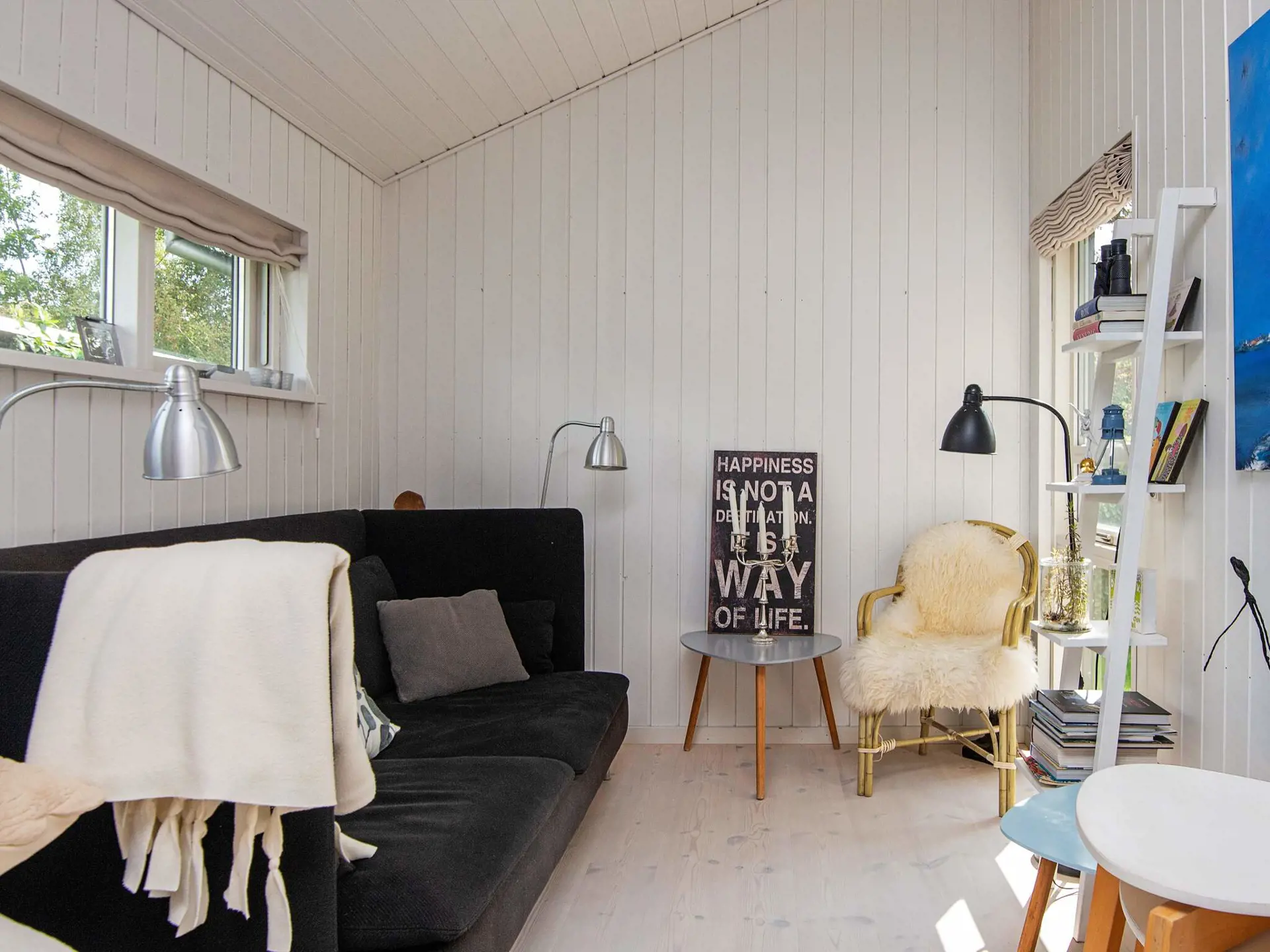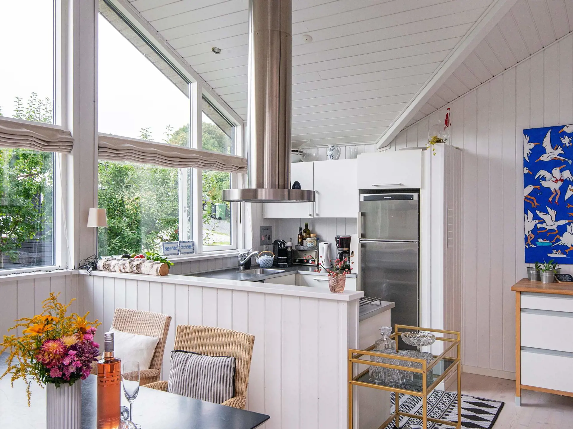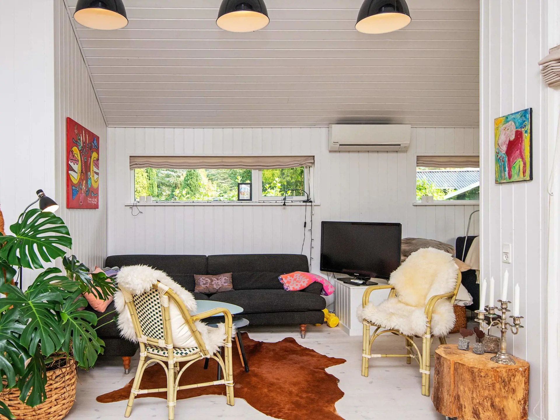 Das Ferienhaus ist hell und wohnlich eingerichtet und hat eine geräumige Wohnküche für das Familienleben, mit Holzofen für die kühlere Jahreszeit. Es gibt zwei Schlafzimmer mit einem Doppebett bzw. zwei Einzelbetten sowie einen Hems oben unter der Dachschräge und ein Schlafsofa für eine Person im Wohnzimmer. Geräumiges Badezimmer mit Whirlpool und Dusche sowie Gäste-WC im Haus.