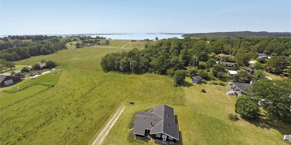 Herrliche Terrasse mit Blick auf die Felder und mit Ausblick auf den Lerdrup Vig. Das große, offene Grundstück bietet viel Platz zum Spielen und Toben. Für die Kleinsten gibt es einen Sandkasten und eine Schaukel. Auf der Terrasse stehen Gartenmöbel und ein Grill bereit.