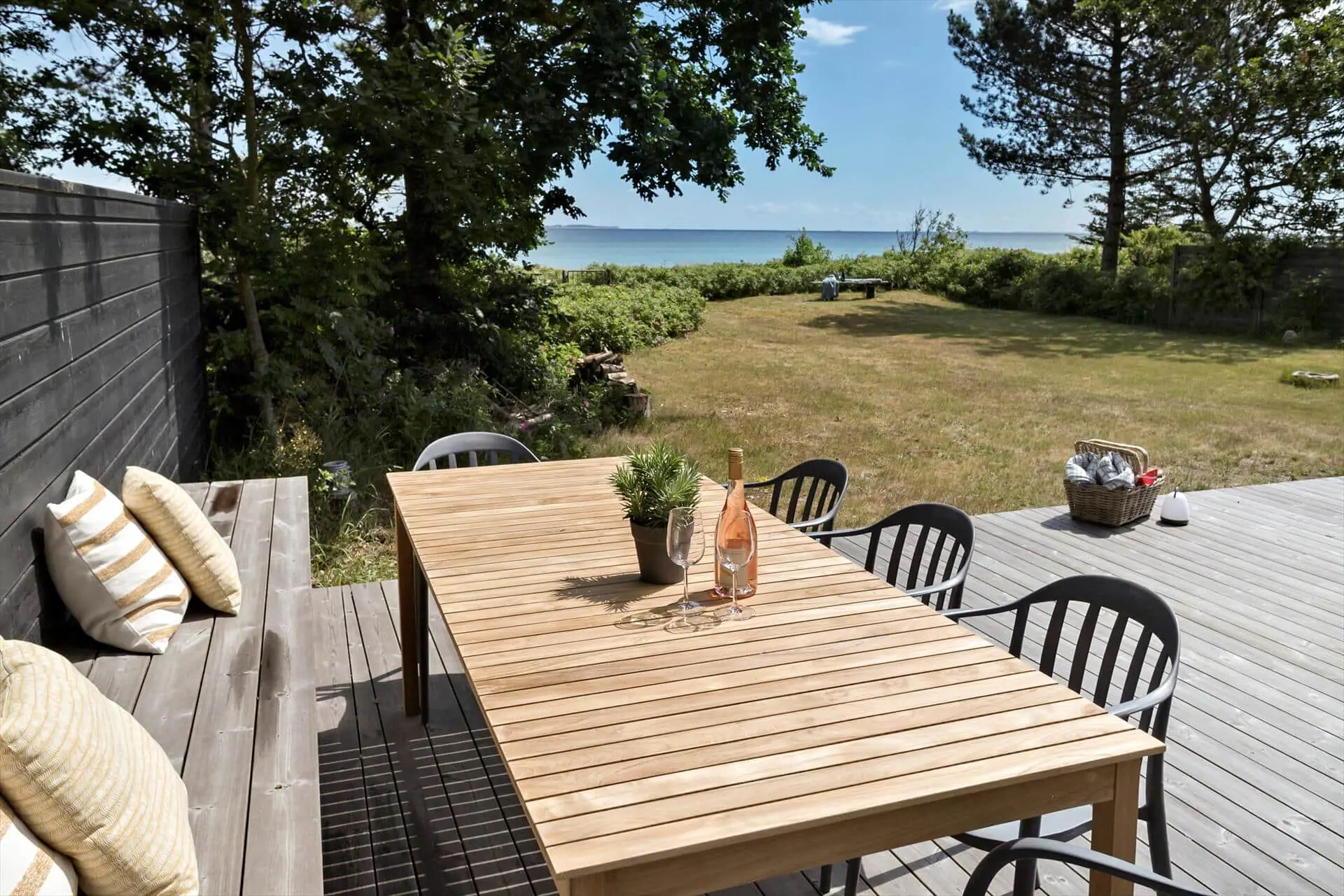 Wenn Sie sich nicht den gesamten Tag hindurch am wohl besten Badestrand Ostjütlands aufhalten möchten, bietet Ihnen die schöne Holzterrasse mit Gartenmöbeln, Liegestühlen und vielem mehr schöne Möglichkeiten, das Wetter, die Lage und das Beisammensein zu genießen.