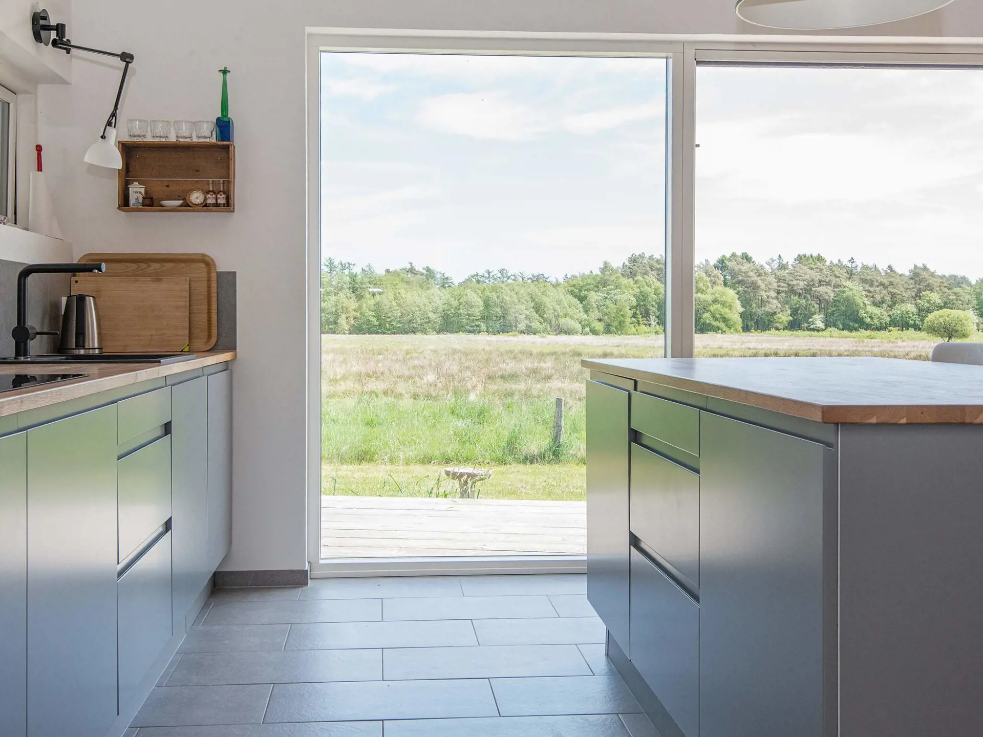 Rund um das Ferienhaus befinden sich eine große Holzterrasse und eine große überdachte Terrasse, auf der Sie grillen und die kühleren Abendstunden genießen können. Das Haus liegt auf einem weitläufigen Naturgrundstück mit herrlichem Blick auf die Felder und viel Platz zum Spielen für Kinder. Tischfußball und Frisbee-Golf sorgen für Freizeitvergnügen.