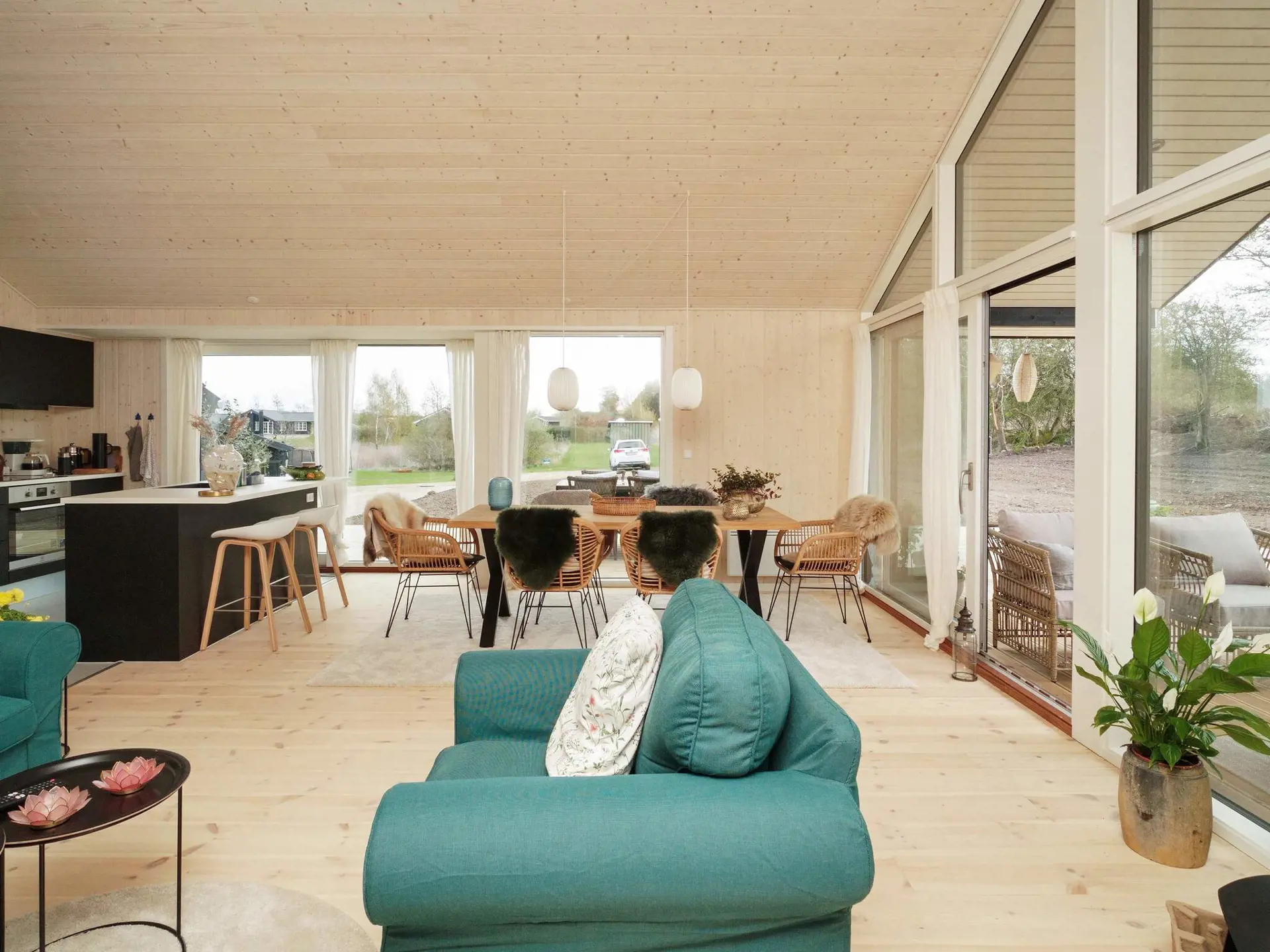 Offene und gut ausgestattete Küche in Verbindung mit dem Essbereich. Wohnzimmer mit Alkoven und Zugang zum Schlafzimmer mit Doppelbett. Im Wohnzimmer gibt es einen Fernseher, auf dem über das Internet des Hauses eigene TV-Anbieter gestreamt werden können. Durch die großen Fenster und Schiebetüren gelangt viel Licht in das Wohnzimmer. Davor liegt eine 13 m2 große, überdachte Terrassenfläche mit Loungesesseln. Von der Küche aus haben Sie zudem Zugang zur offenen Terrasse mit Gartenmöbeln, Sonnenliegen und einem Gasgrill. Ungestört von den Nachbarn lässt sich der Bereich mit Außensauna in Ruhe genießen, während die Kinder sich auf dem Gartentrampolin vergnügen (Nutzung nur auf eigenes Risiko).