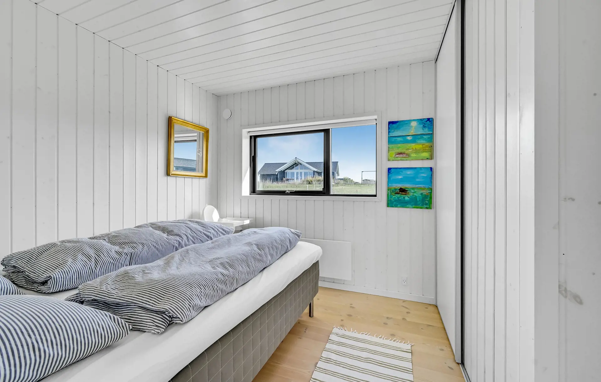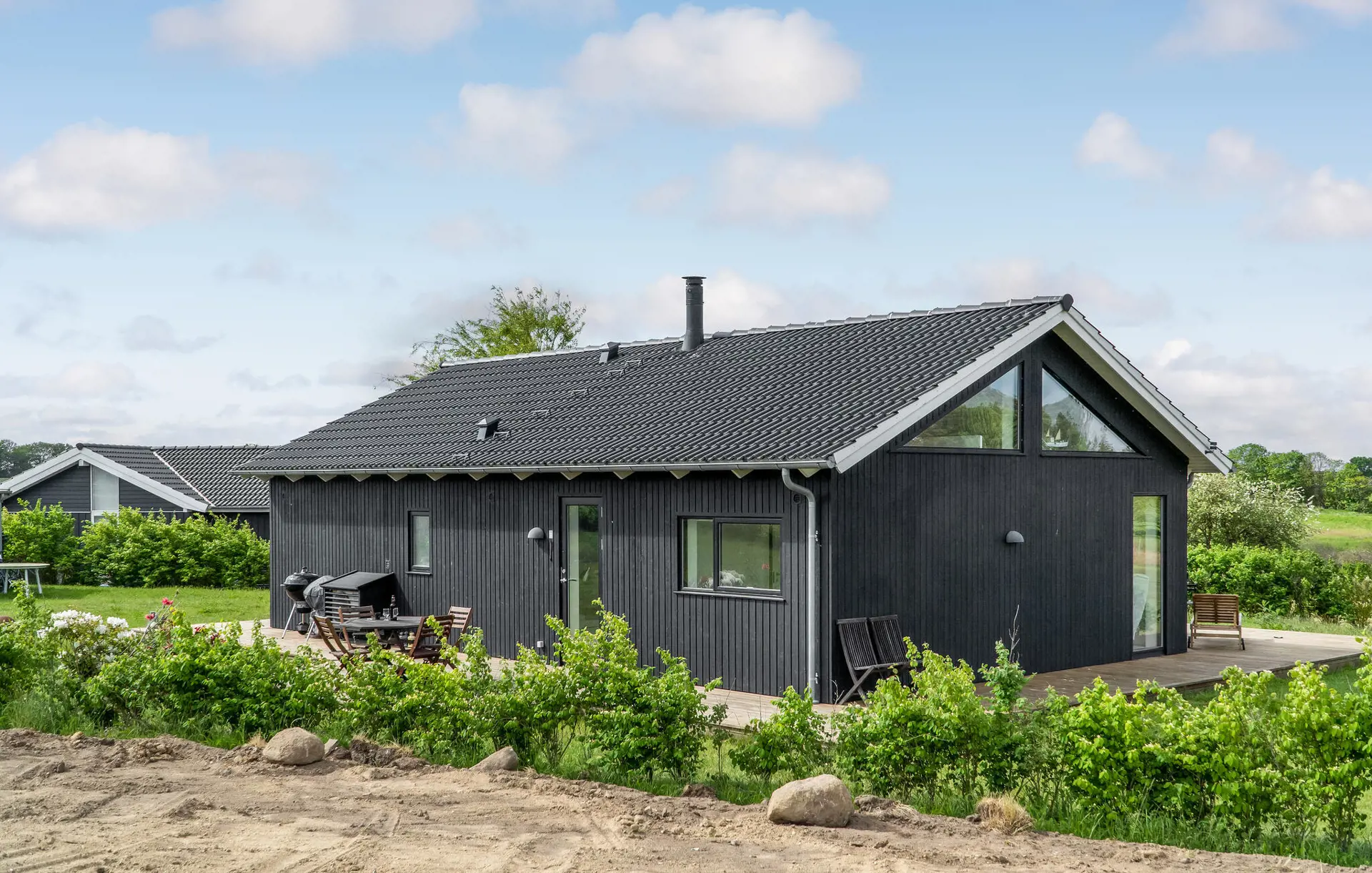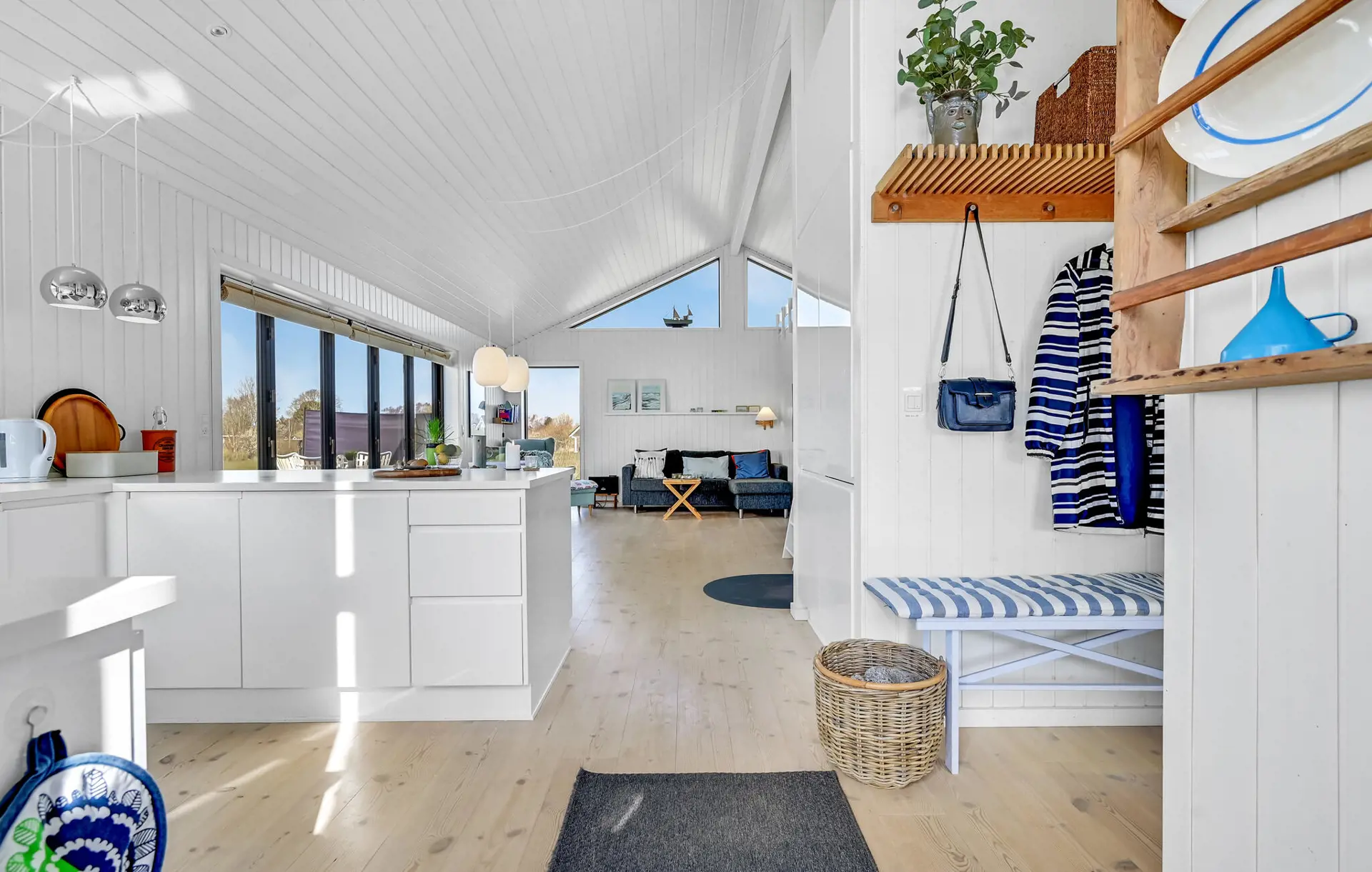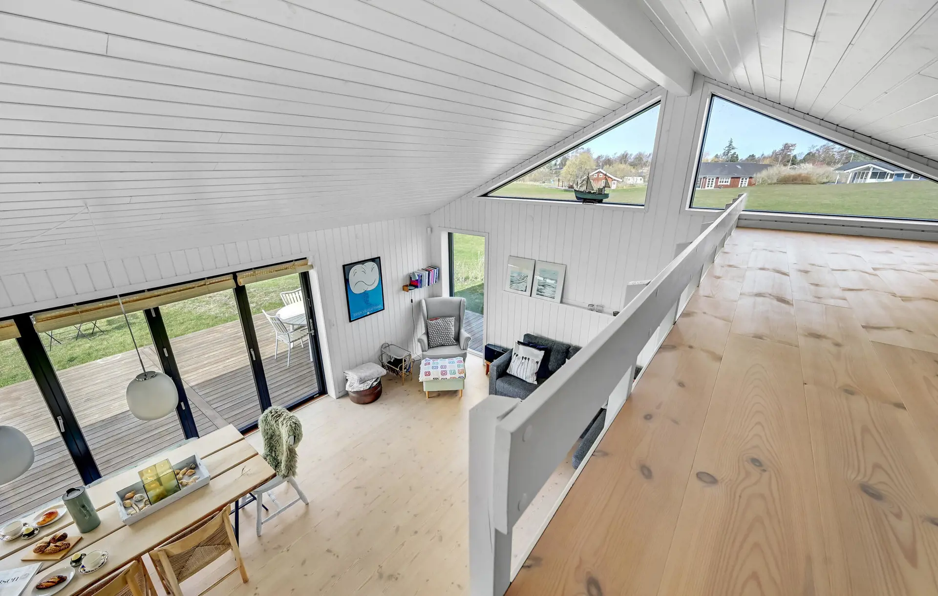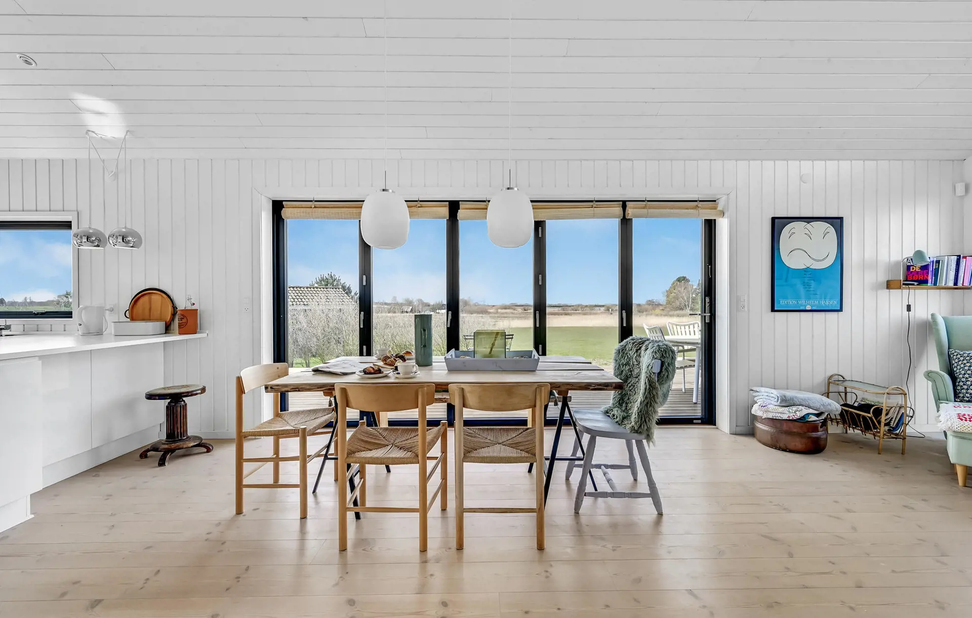 Dieses einladende Haus ist wie geschaffen für eine erholsame Auszeit vom Alltag. Ein großer, heller Wohnraum mit dezenten Farben, gemütlichem Sofa und offener Küche lädt dazu ein, sich mit einer Tasse Kaffee zurückzulehnen, einen schönen Blick ins Grüne zu genießen oder gemeinsam zu kochen.