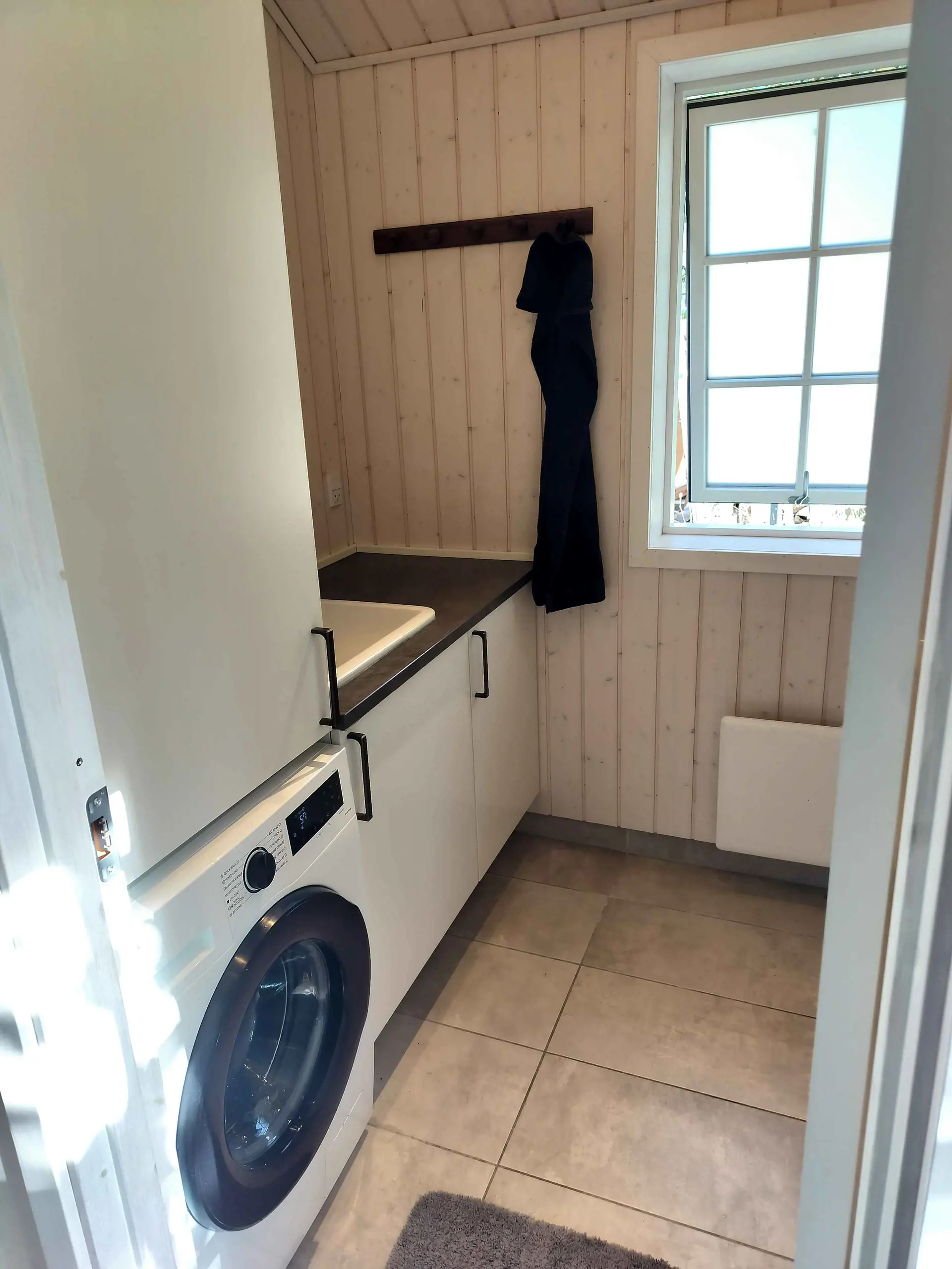 Drinnen gibt es hohe Decken, 3 gute Schlafzimmer, einen großen Küchen- und Essbereich sowie ein schönes Badezimmer mit Dusche, Fußbodenheizung und Waschmaschine. Wenn Sie am Esstisch sitzen, strömt das wunderbarste Licht herein, und von hier aus können Sie ebenfalls den Fjord sehen.