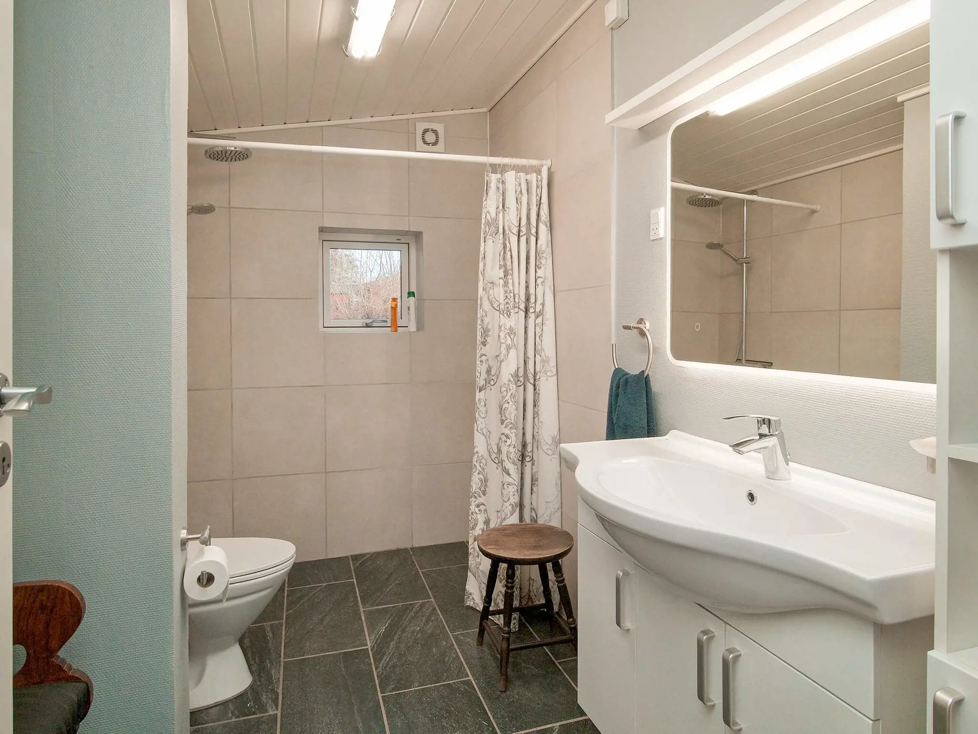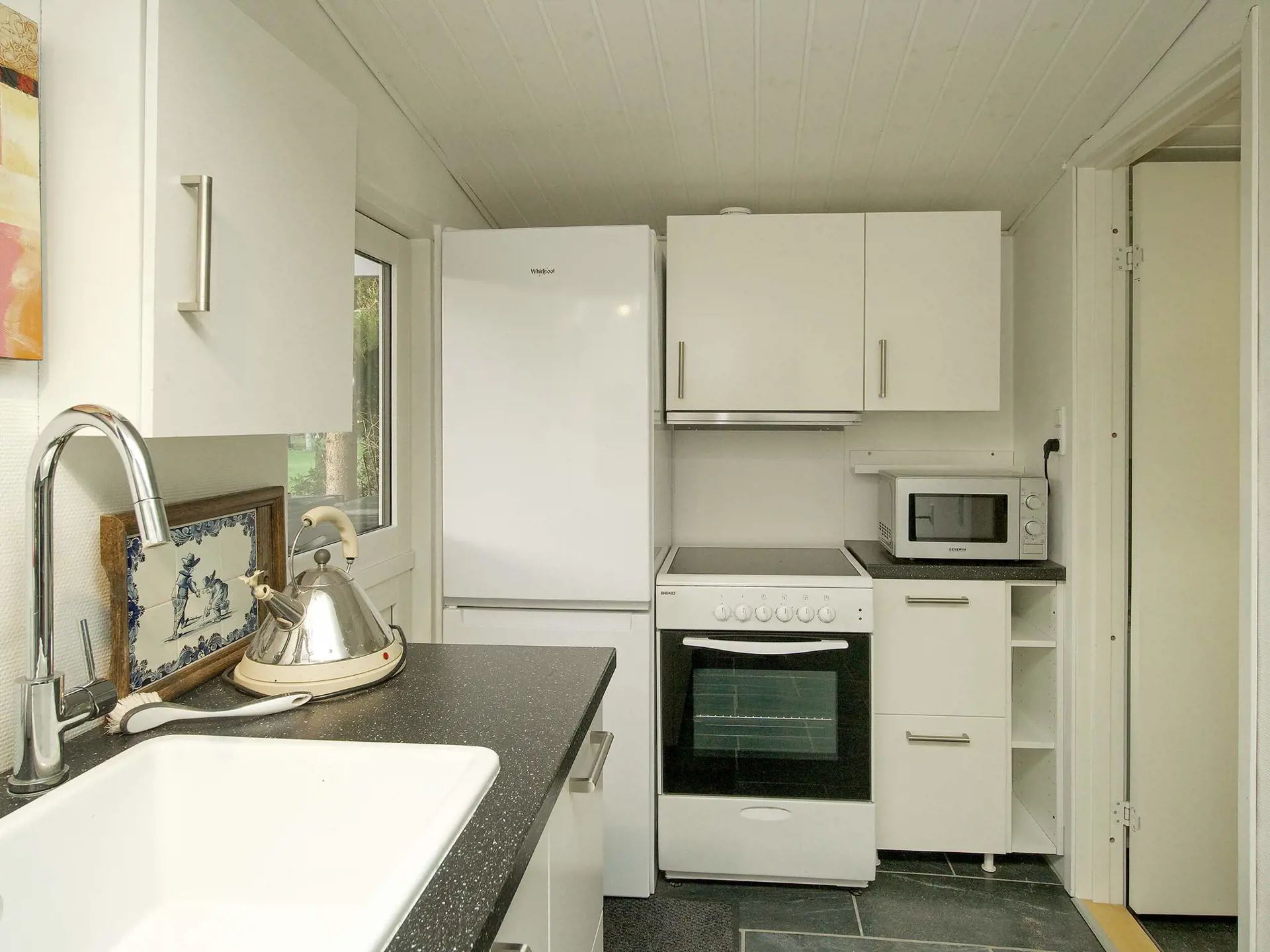 Zur Ausstattung gehören ein Vorraum, ein Schlafzimmer mit Doppelbett, ein Badezimmer mit Dusche, eine zum Wohn-/Esszimmer hin offene Küche und ein Wohnzimmer mit einer Schlafcouch für zwei Personen. Die Inneneinrichtung des Hauses eignet sich für Paare oder kleine Familien.