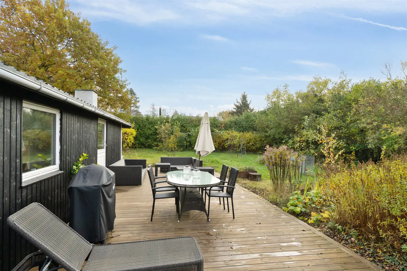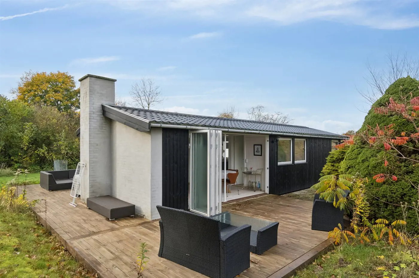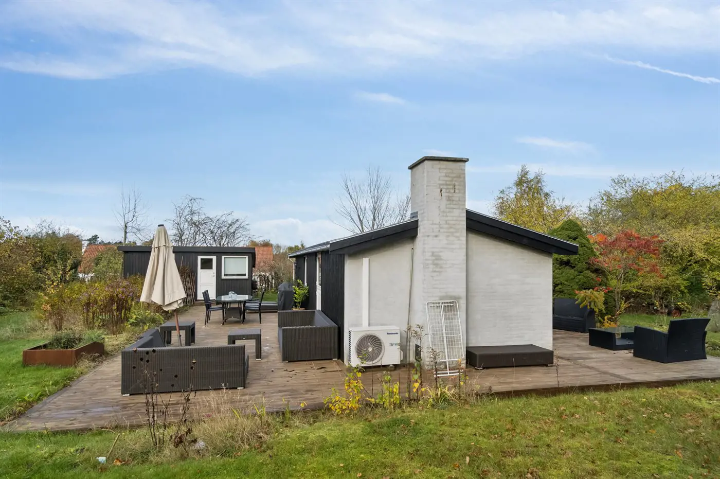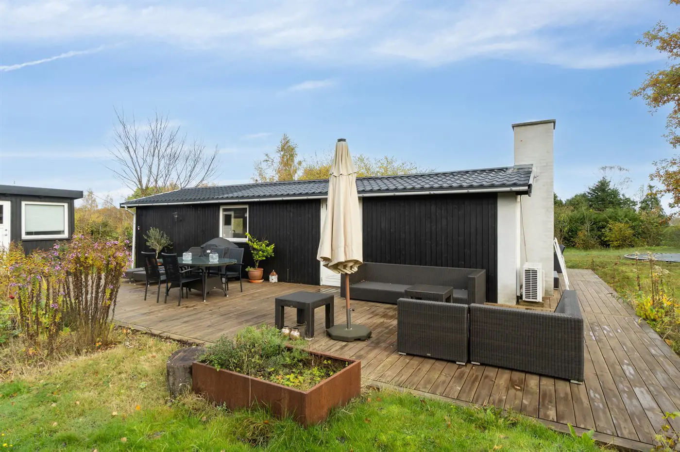 Das Haus verfügt über eine schöne Küche in offener Verbindung mit dem Wohnzimmer und dem Essbereich. Das große Fenster im Wohnzimmer kann geöffnet und zur Seite geschoben werden, sodass das Leben im Freien nach innen geholt wird und du freien Zugang zur Terrasse hast. Rund um das Haus gibt es schöne Terrassen und eine attraktive Bepflanzung, die dazu einlädt, draußen zu sein und die Sonne sowie das gute Wetter zu genießen.