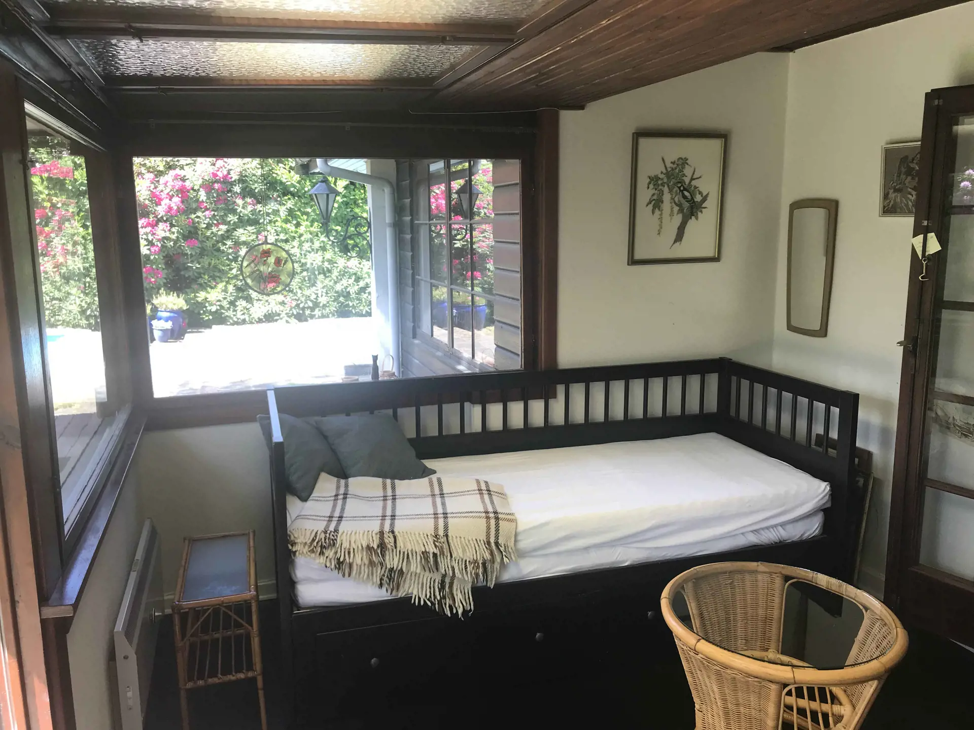 Das Haus verfügt über drei Schlafzimmer. Zwei der Schlafzimmer sind mit Doppelbetten ausgestattet. Das dritte Schlafzimmer hat zwei Einzelbetten und dient auch als Durchgangszimmer. Es hat keine Tür, ist aber mit einem Vorhang abgeschirmt. Darüber hinaus gibt es ein Schlafsofa für zwei Personen. Das Schlafsofa befindet sich im schönen Wintergarten, der über Flügeltüren zum Garten und einen Blick auf den fantastischen, großen Rhododendron hat.