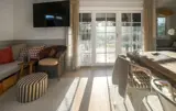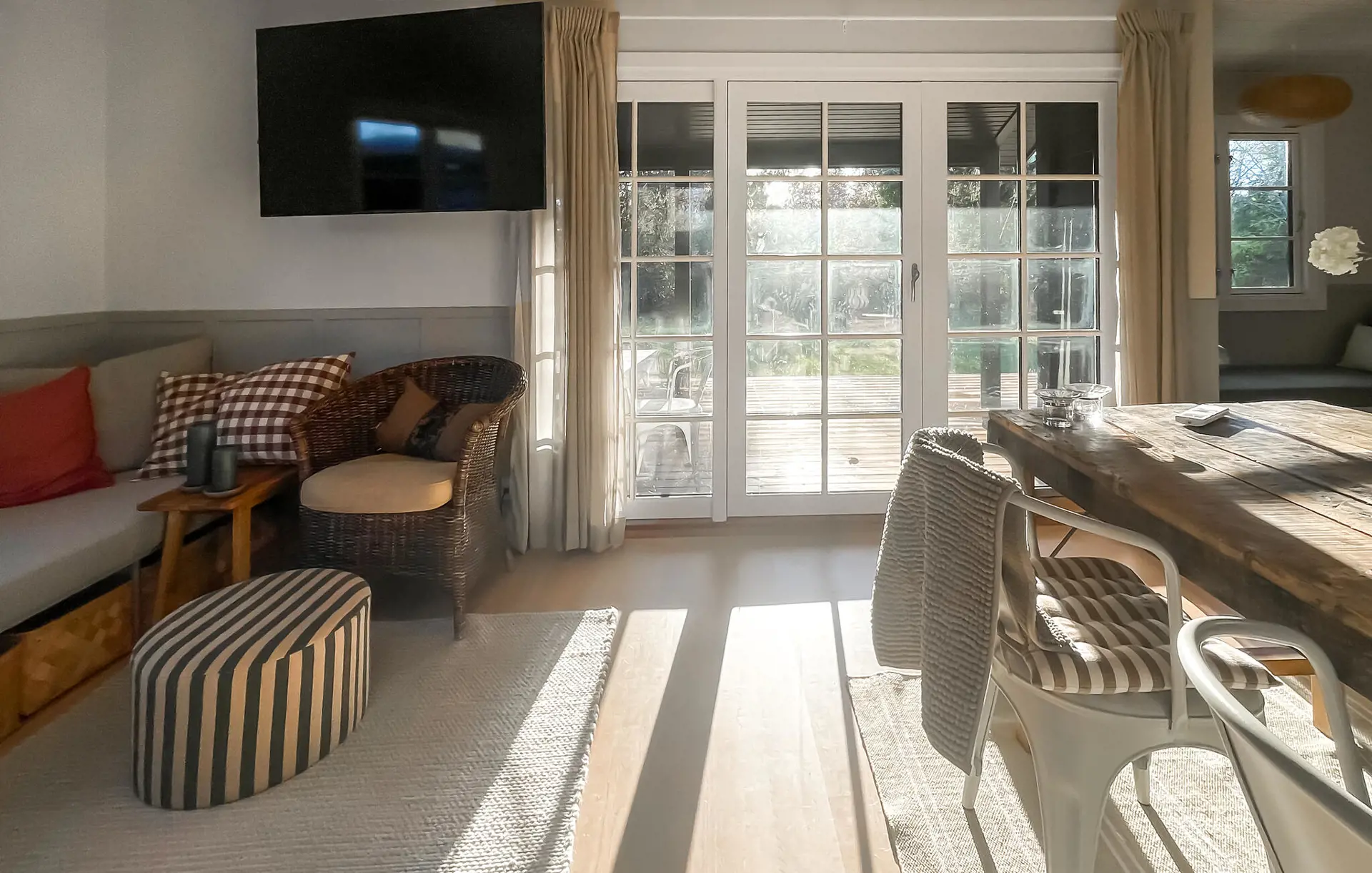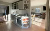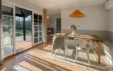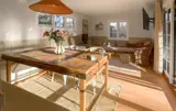 Lassen Sie sich in den hellen Wohnräumen von der freundlichen Atmosphäre empfangen. Der Innenbereich Ihres Ferienhauses ist gemütlich gestaltet. Nutzen Sie den offenen Wohn- und Essbereich, der mit gemütlichen Sitznischen, warmen Holzdetails und großen Fensterfronten einladend wirkt. Entspannen Sie auf der Sofalandschaft oder setzen Sie sich an den Holztisch, der Platz für gemeinsame Mahlzeiten oder Spieleabende schafft. Die Küche ist kompakt und bietet Ihnen funktionale Arbeitsflächen zum Zubereiten der gemeinsamen Mahlzeiten.
