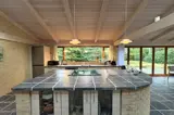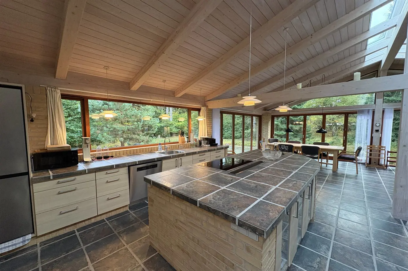 Die große Wohnküche ist offen mit dem Wohnzimmer verbunden und bietet einen schönen Essbereich sowie zwei gemütliche Sitzgruppen an – ideal, um mit der Familie und mit Freunden entspannte Zeit zu verbringen. Von hier aus gelangst du auf die gute Süd- und Ostterrasse und auf das große Naturgrundstück mit Heidekraut und hohen Bäumen, die das Grundstück umgeben.