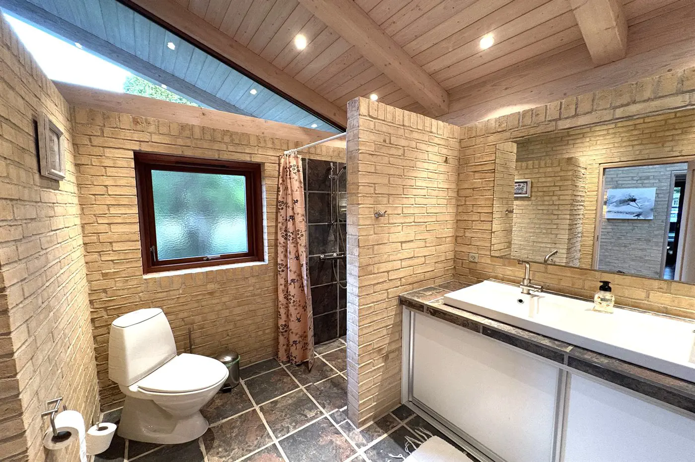 Das Haus hat eine Wohnfläche von ganzen 134 m2 und in allen Räumen gibt es Decken bis zum First. Die großen Fensterfronten und das Oberlicht sichern ein gutes Lichteinfall. Die hohe Qualität des Hauses zeigt sich unter anderem in der wassergeführten Fußbodenheizung, die im gesamten Haus verlegt ist.