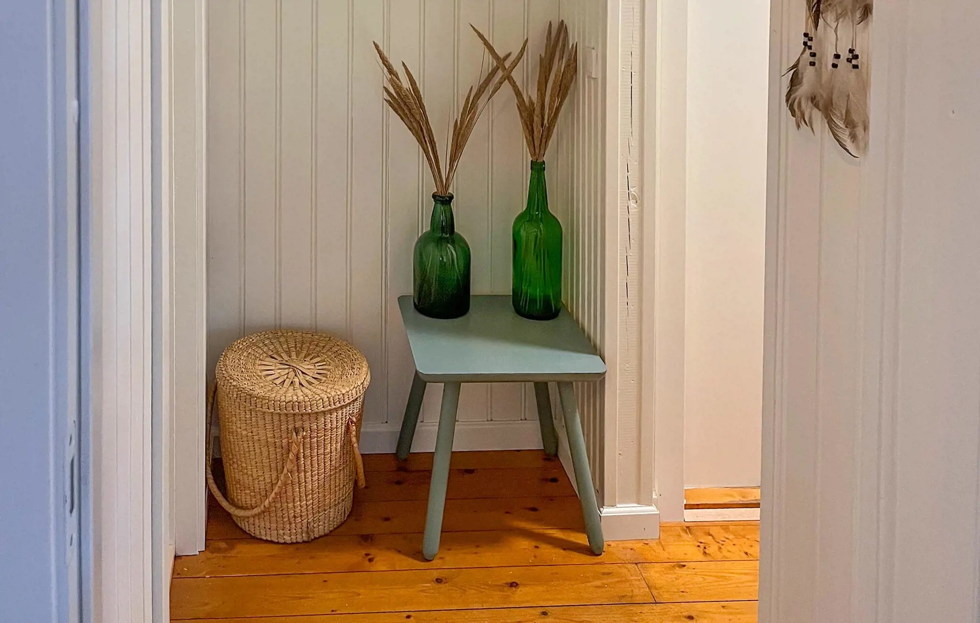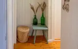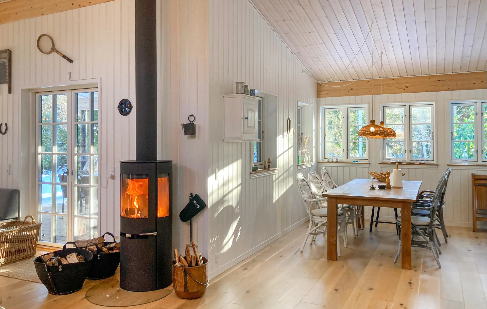 Treten Sie ein und spüren Sie sofort die warme, einladende Atmosphäre des Innenbereichs. Nehmen Sie im großzügigen Wohnraum Platz und genießen Sie die behagliche Wärme des zentralen Kaminofens, der an kühleren Tagen für eine besondere Stimmung sorgt. Lassen Sie den Blick durch die vielen Fenster in den Garten schweifen, während gemütliche Sessel und Sofas zu entspannten Stunden einladen. Versammeln Sie sich am langen Holztisch zu Ihren Mahlzeiten oder planen Sie hier gemeinsam die Erlebnisse des nächsten Tages. Liebevoll gestaltete Details im Flur runden den schönen Eindruck ab.