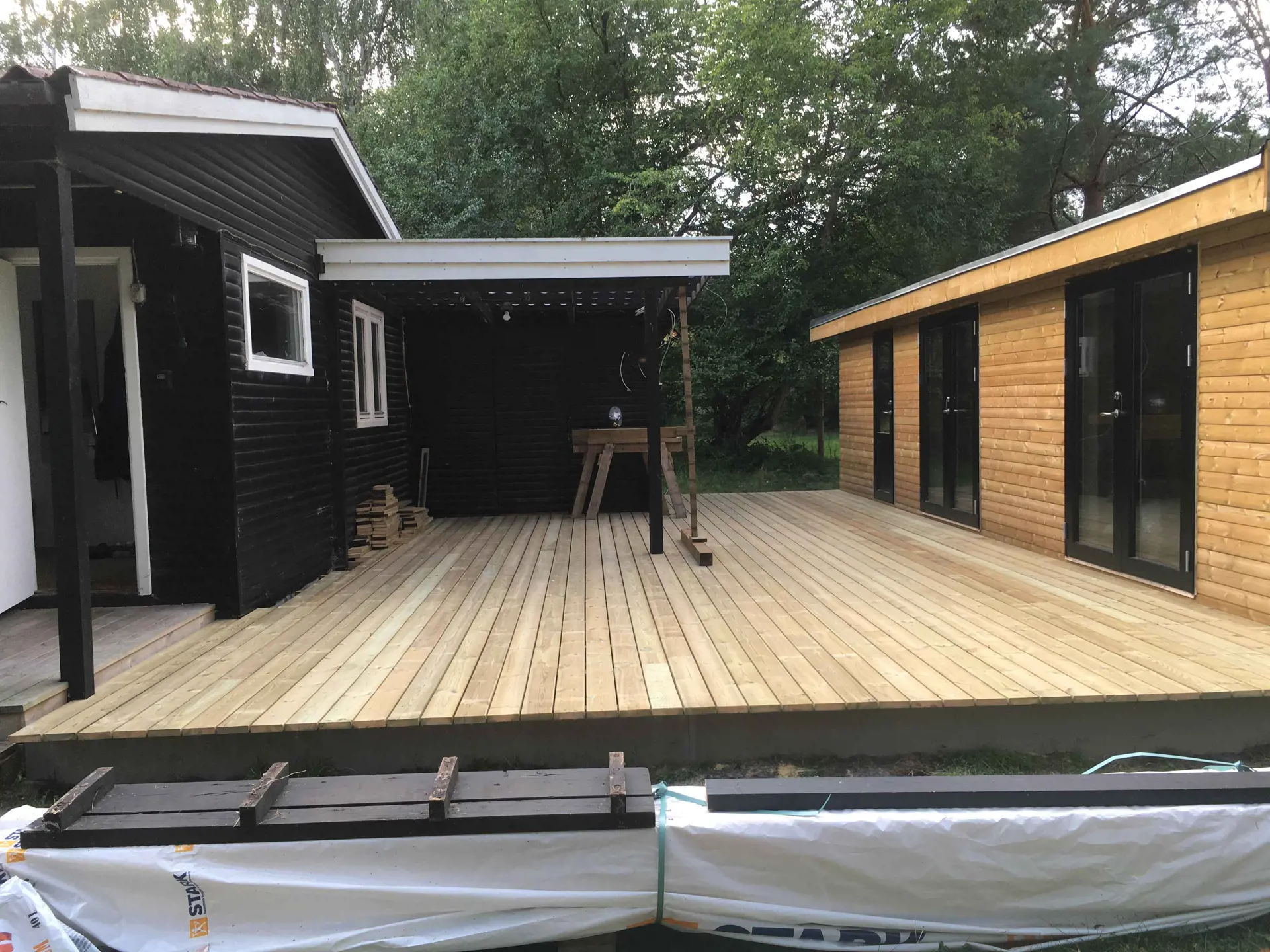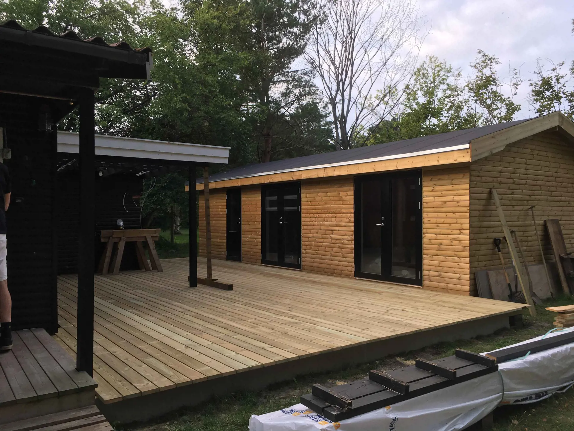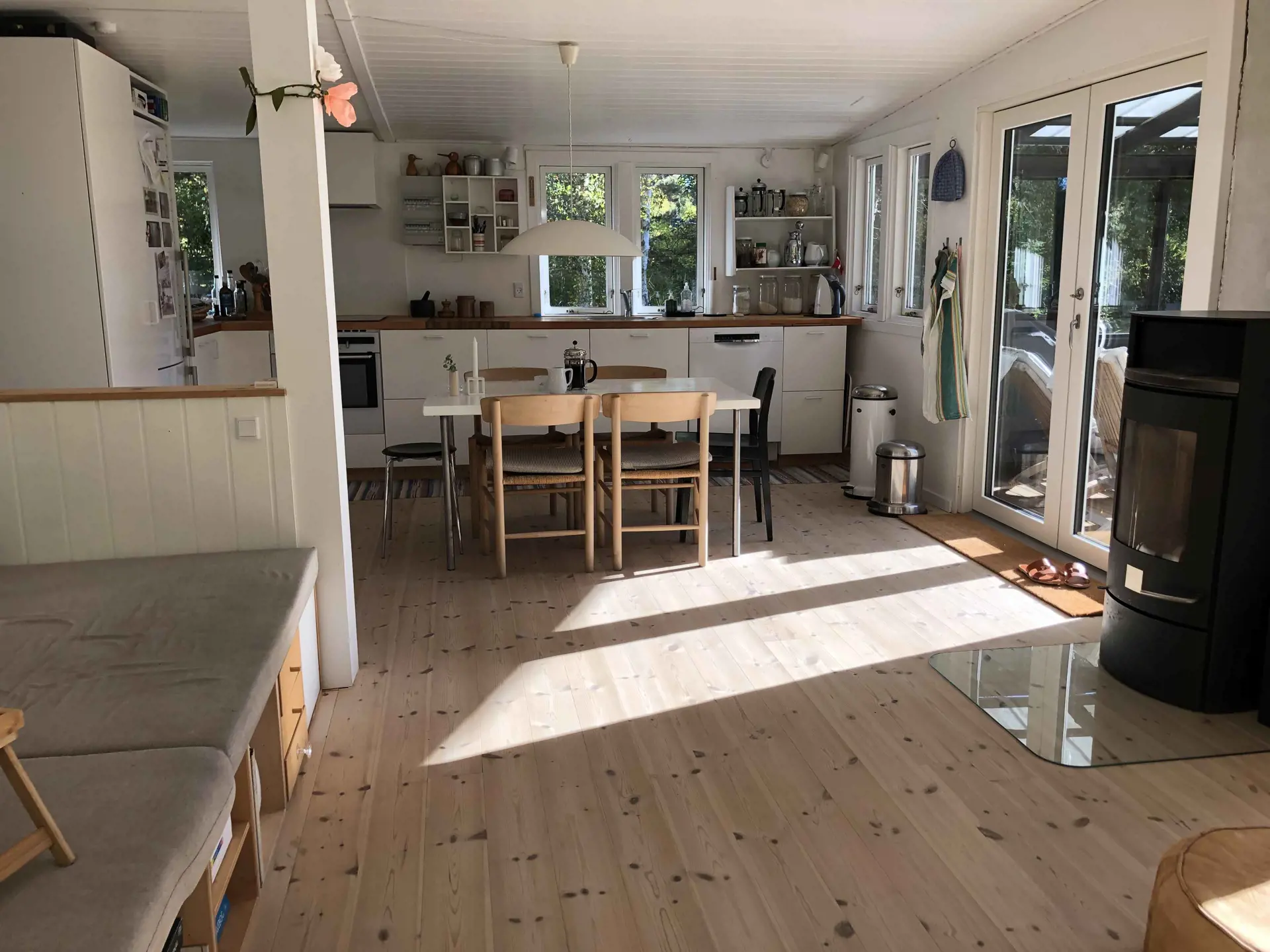 Es gibt auch zwei Nebengebäude mit Türen direkt in Verbindung mit der Holzterrasse, die mit dem Haus verbunden ist. Ein Zimmer im Nebengebäude verfügt über ein Doppelbett und das andere über zwei Einzelbetten, die auf Wunsch zu einem Doppelbett verbunden werden können.