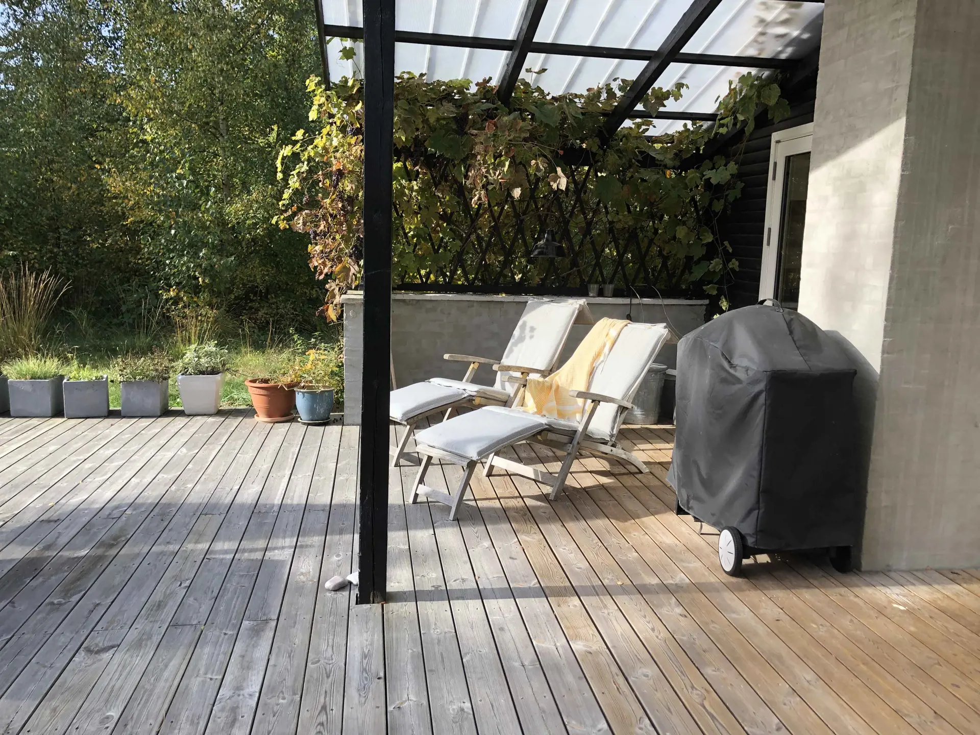 Die beiden großen, nach Süden ausgerichteten, teilweise überdachten Holzterrassen laden zum Entspannen, Sonnenbaden und Grillabenden mit Gasgrill ein.