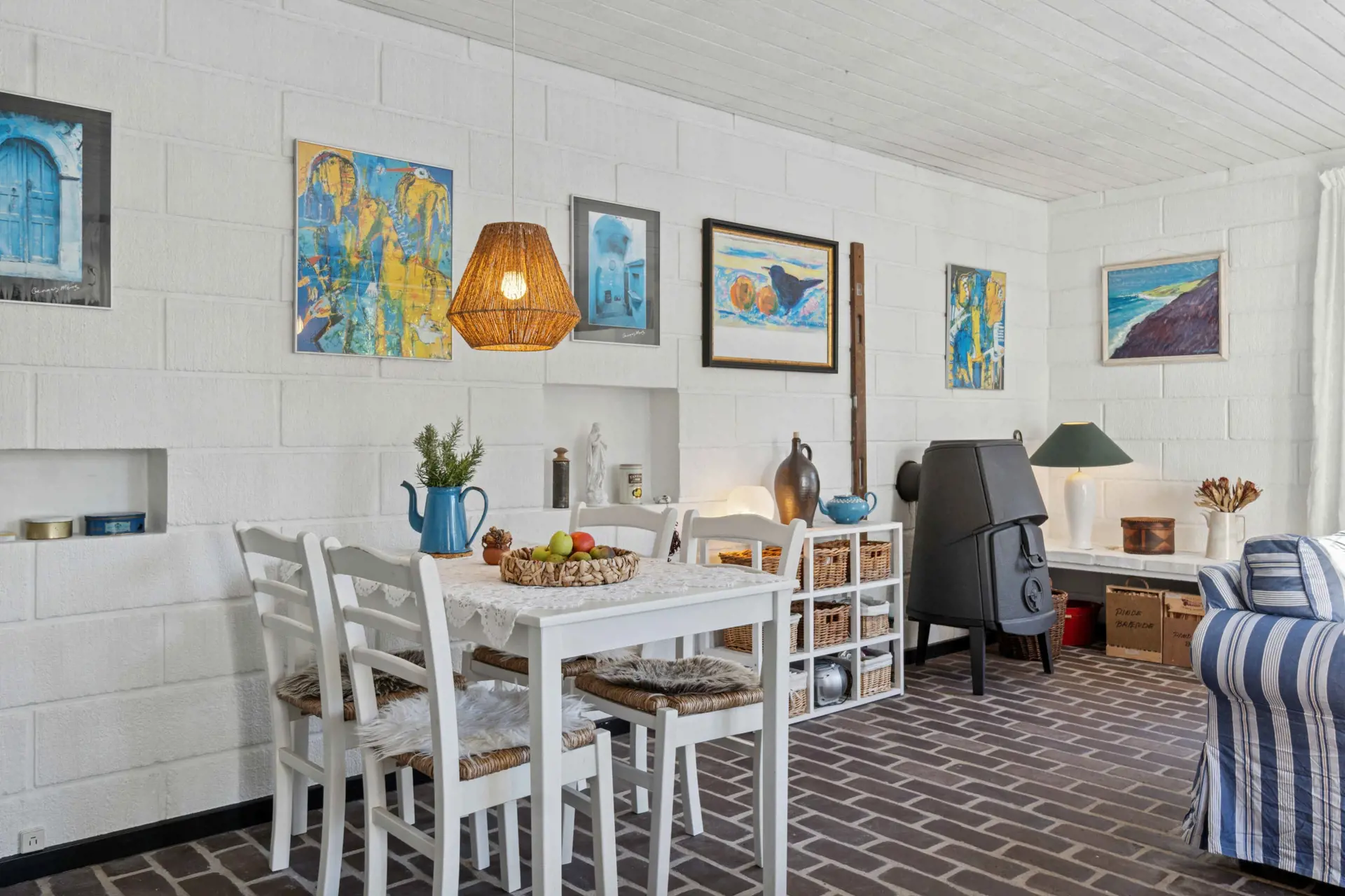Im Inneren erwarten Sie 101 m² mit drei Schlafzimmern und vier Schlafplätzen. Ein Schlafzimmer verfügt über zwei Einzelbetten, die beiden anderen jeweils über ein Einzelbett, das auf 140 cm Breite ausgezogen werden kann. Eines der Zimmer mit Einzelbett hat keine Tür, sondern einen Vorhang. Zwei helle Wohnzimmer, beide komfortabel eingerichtet, bieten Raum für Entspannung und gemeinsames Beisammensein. Klassische Ziegelböden unterstreichen die besondere Atmosphäre des Hauses.