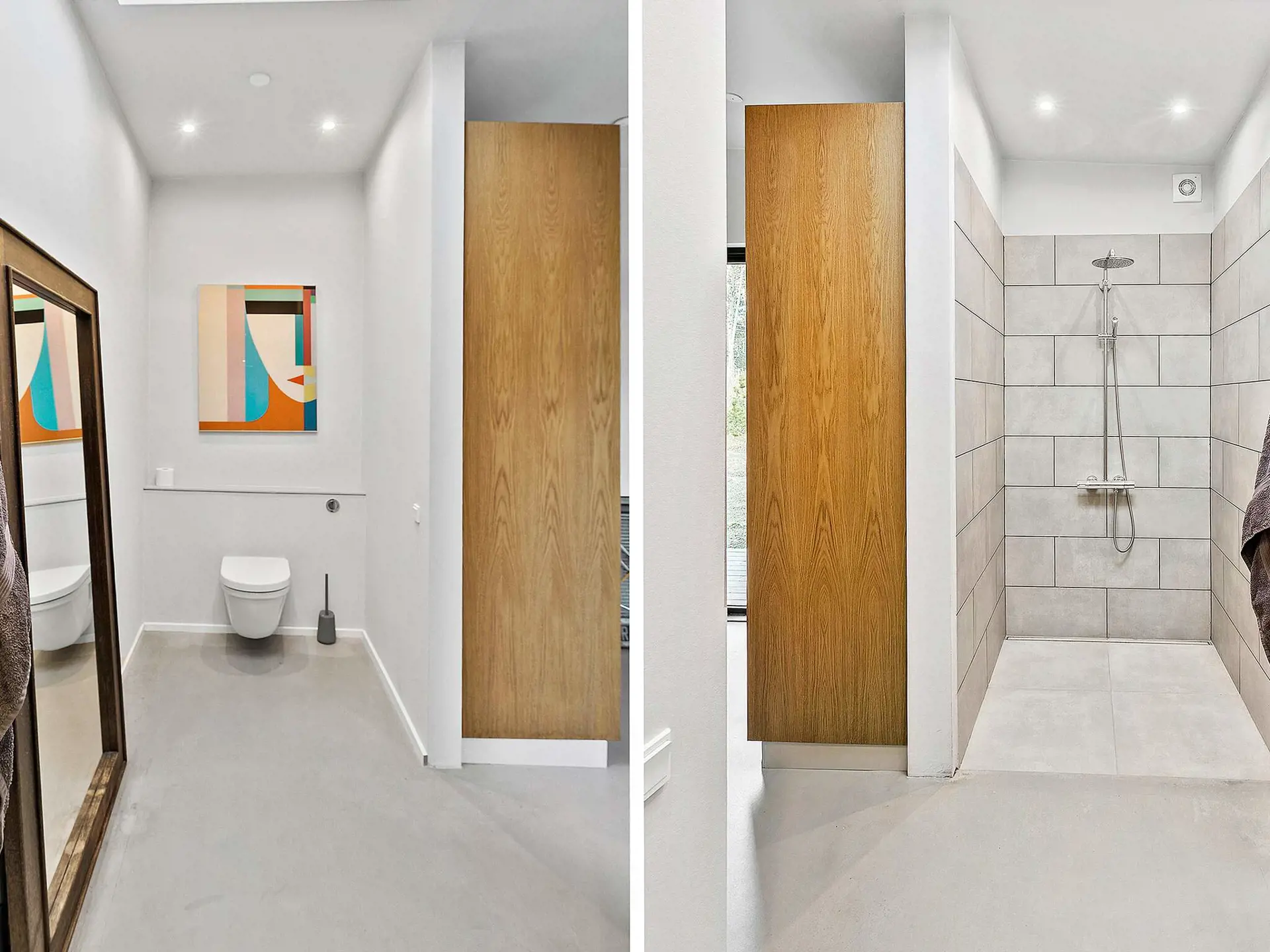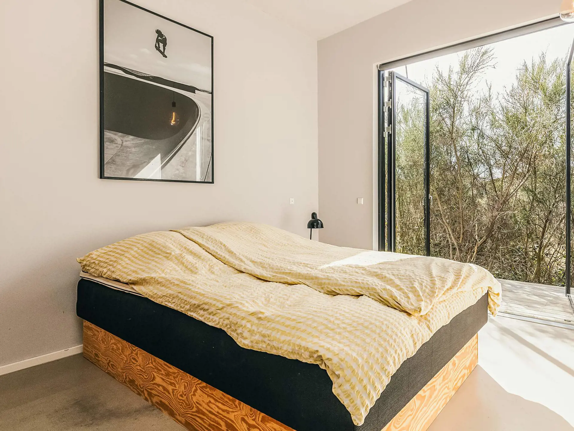 Die Innengestaltung des Hauses ist geprägt von der Vision des Architekten von Offenheit und Licht. Jeder Raum hat einen direkten Blick und Zugang zum umliegenden Wald und vermittelt so das Gefühl, eins mit der Natur zu sein. Die großen Fenster laden den Wechsel der Jahreszeiten ins Innere ein, während der Kamin für eine gemütliche Atmosphäre sorgt.