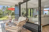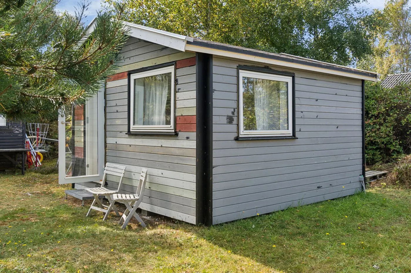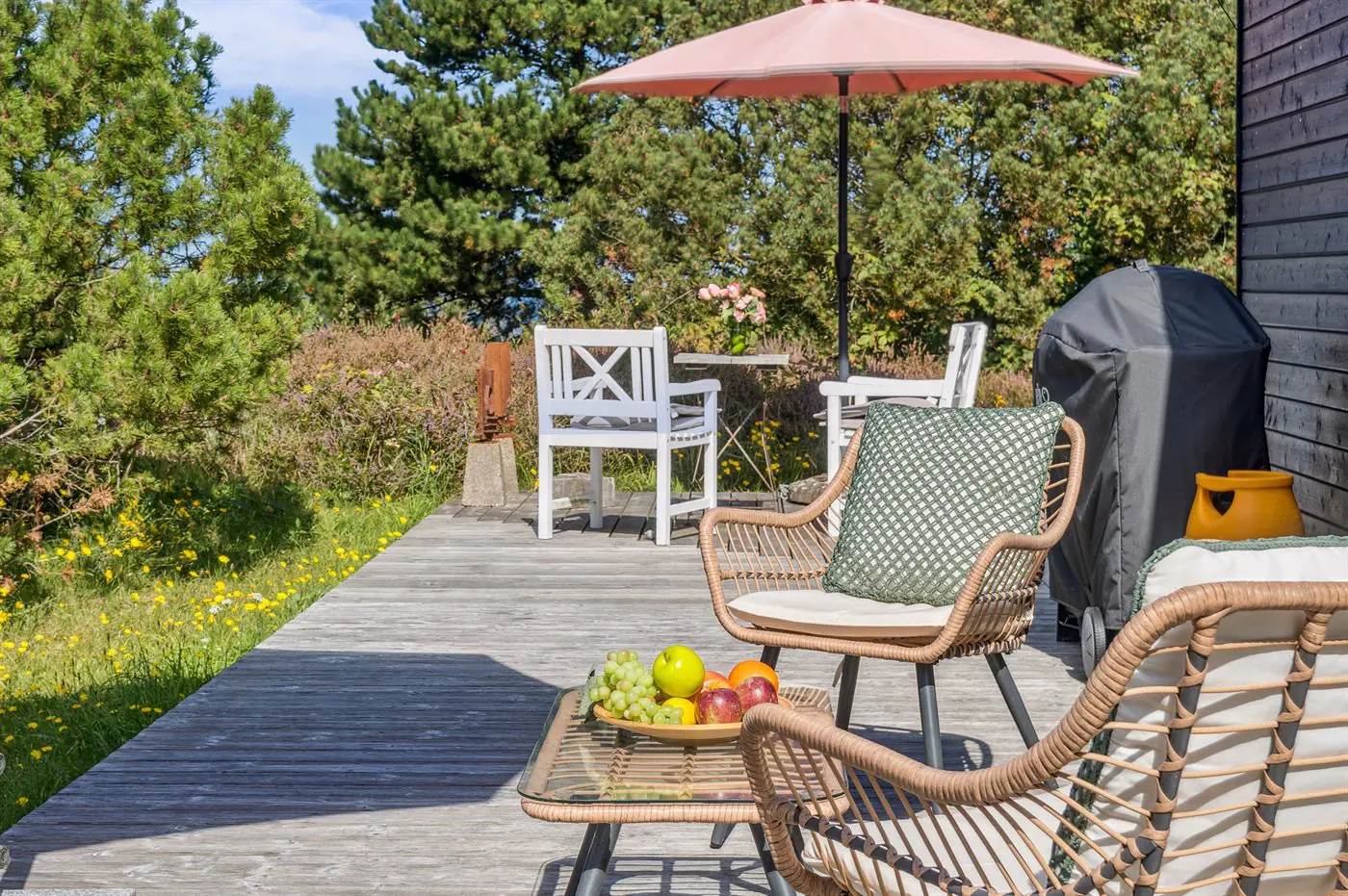 Das Haus besteht aus einem offenen Wohnbereich mit Wohnzimmer, Essplatz und Küche in einem. Von hier aus gelangst du direkt auf die große Holzterrasse, die sich über drei Seiten des Hauses erstreckt. Auf der Südseite findest du eine große überdachte Terrasse, auf der du Schatten und Windschutz findest.