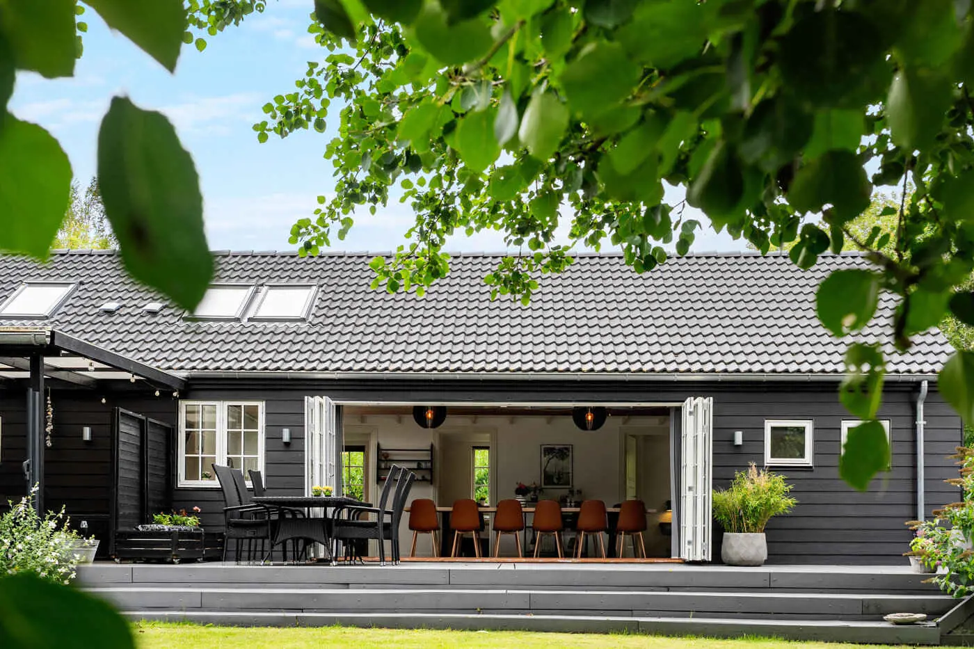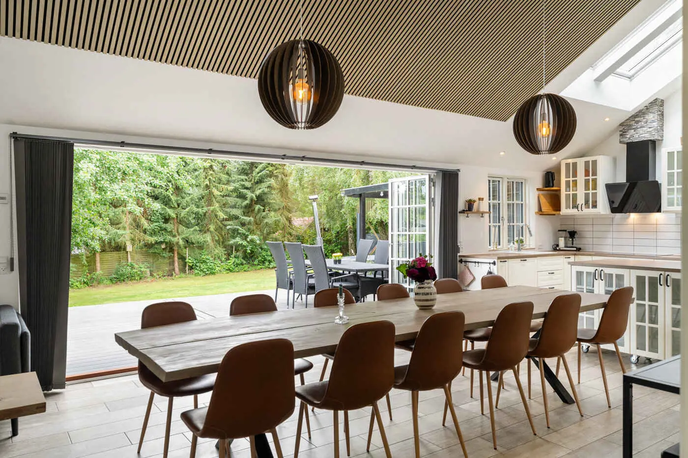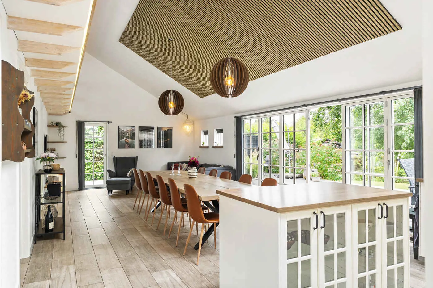 Das Herzstück des Hauses ist der großzügige Wohn- und Essbereich mit offener Küche, hohen Decken bis zum First und großen Schiebetüren zur Terrasse. Hier kommt man leicht beim Kochen, Essen und bei langen Abenden zusammen, während der Übergang zwischen Innen- und Außenbereich offen und natürlich wirkt.