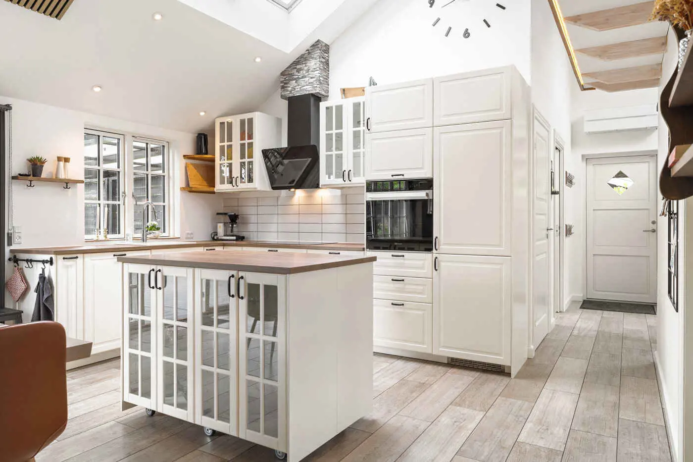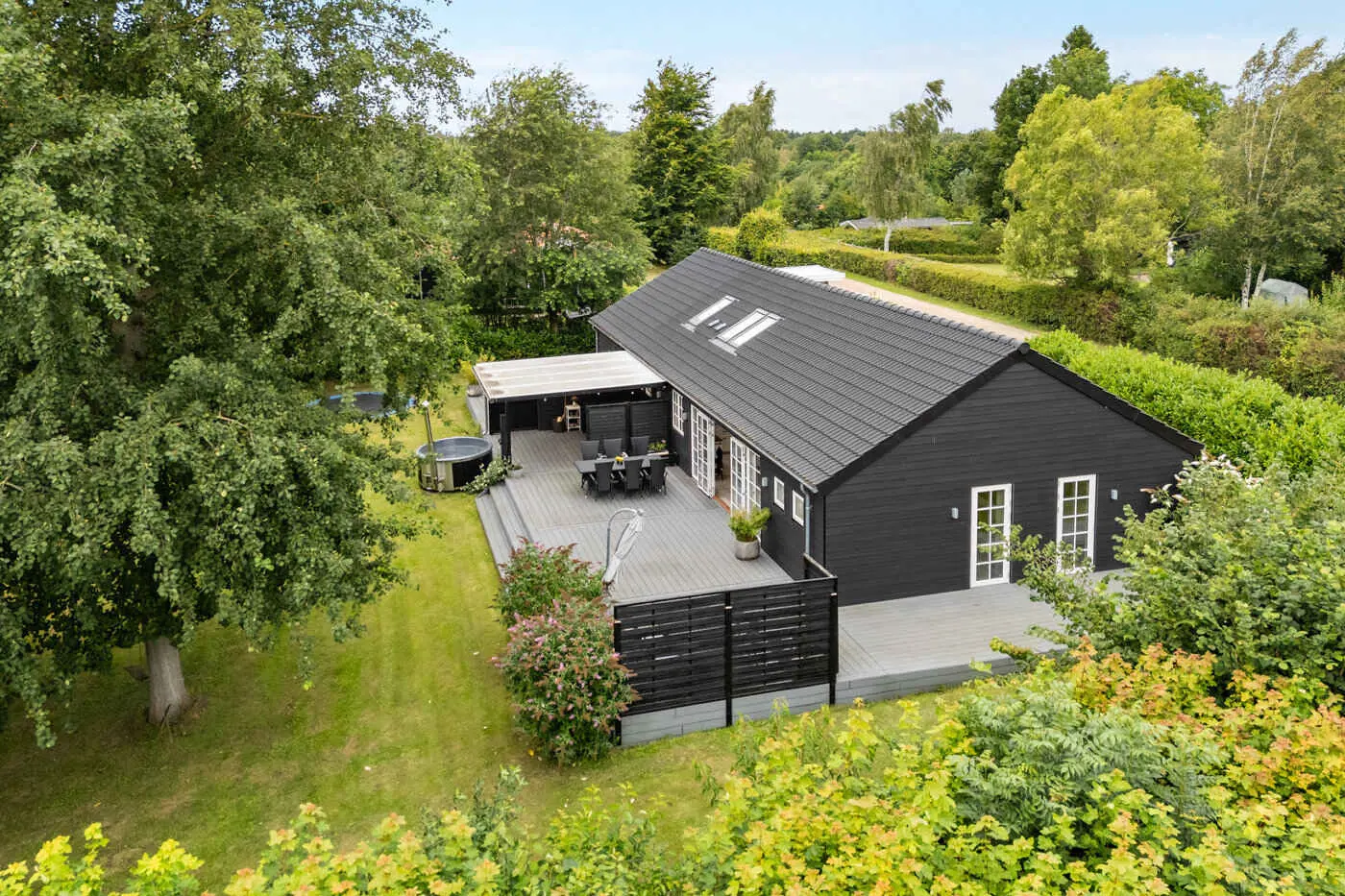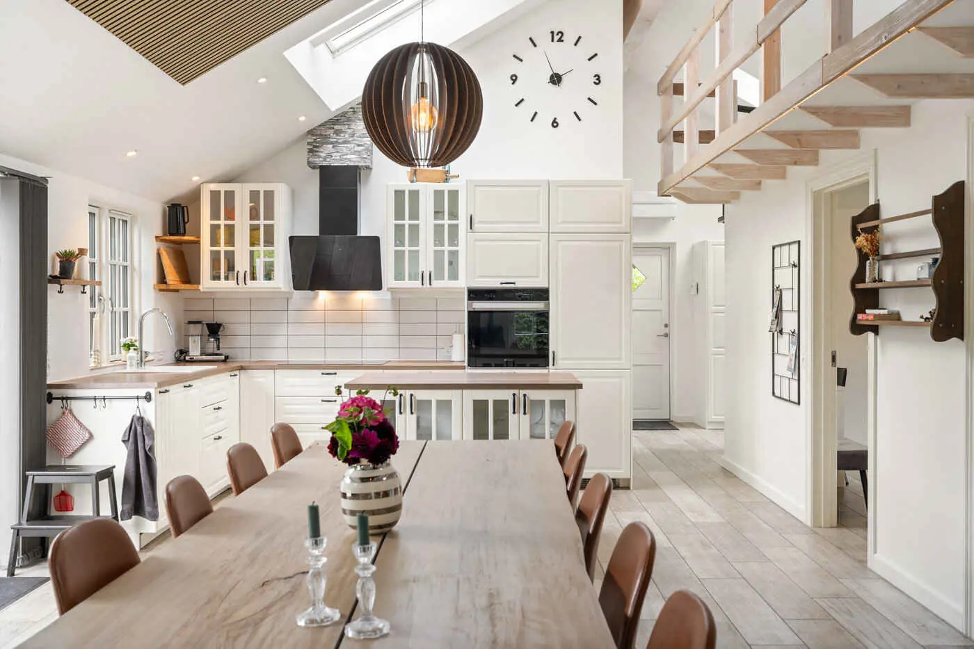 Das Herzstück des Hauses ist der großzügige Wohn- und Essbereich mit offener Küche, hohen Decken bis zum First und großen Schiebetüren zur Terrasse. Hier kommt man leicht beim Kochen, Essen und bei langen Abenden zusammen, während der Übergang zwischen Innen- und Außenbereich offen und natürlich wirkt.