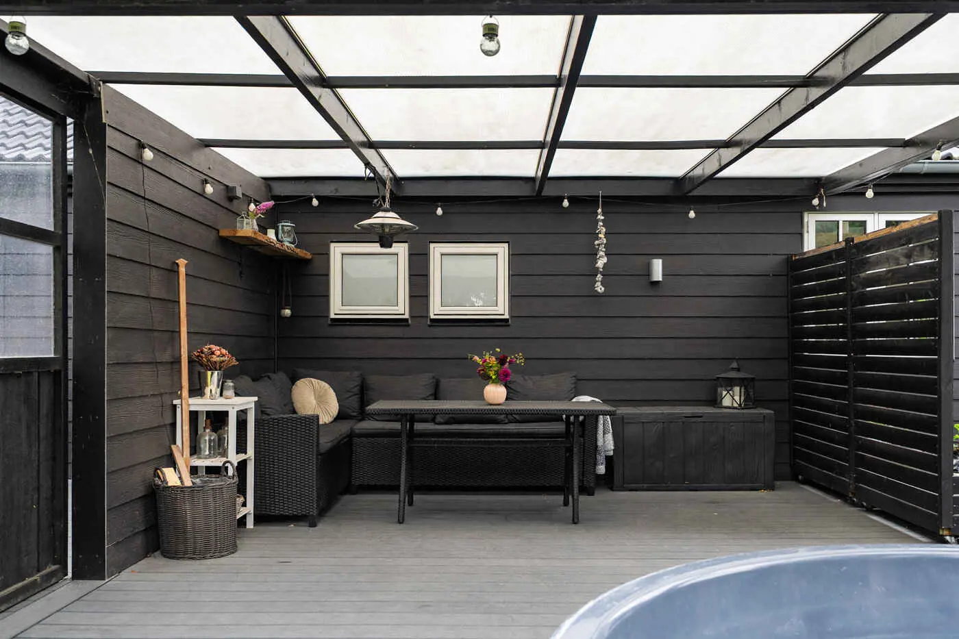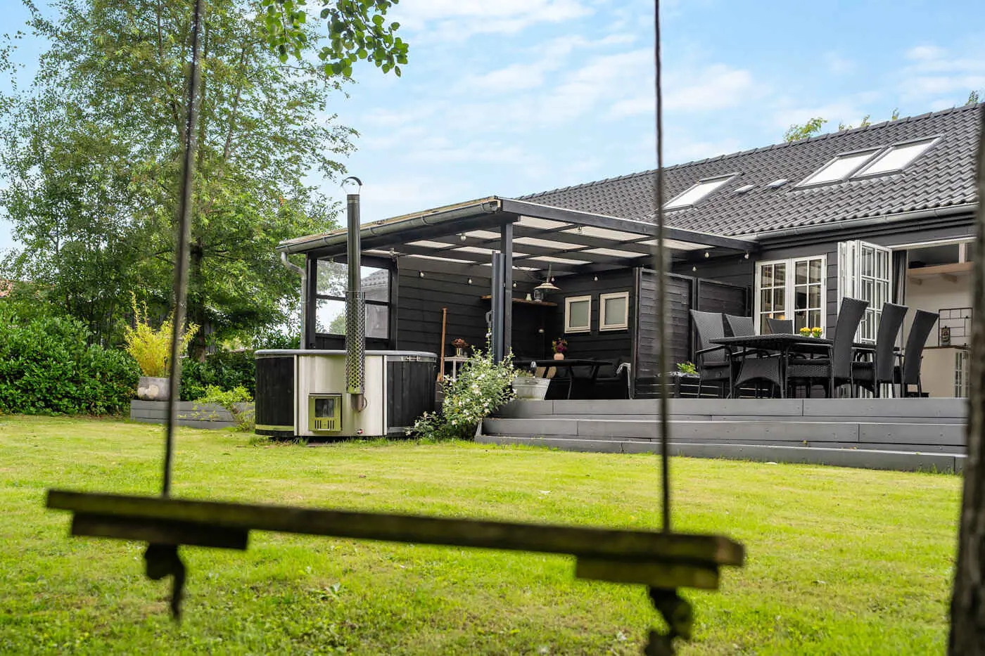 Im Außenbereich erwartet Sie eine große Holzterrasse, die teilweise überdacht ist und die Saison verlängert. Der Hot Tub lädt das ganze Jahr über zur Entspannung ein.