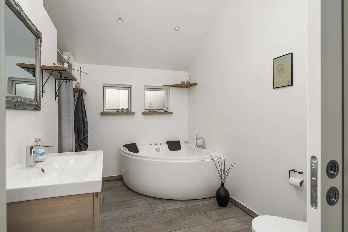 Das Haus verfügt über ein Badezimmer sowie ein zusätzliches WC, was den Aufenthalt auch bei mehreren Gästen praktisch macht. Die Einrichtung ist schlicht und funktional, mit Fokus auf Komfort und Raum für gemeinsames Beisammensein.