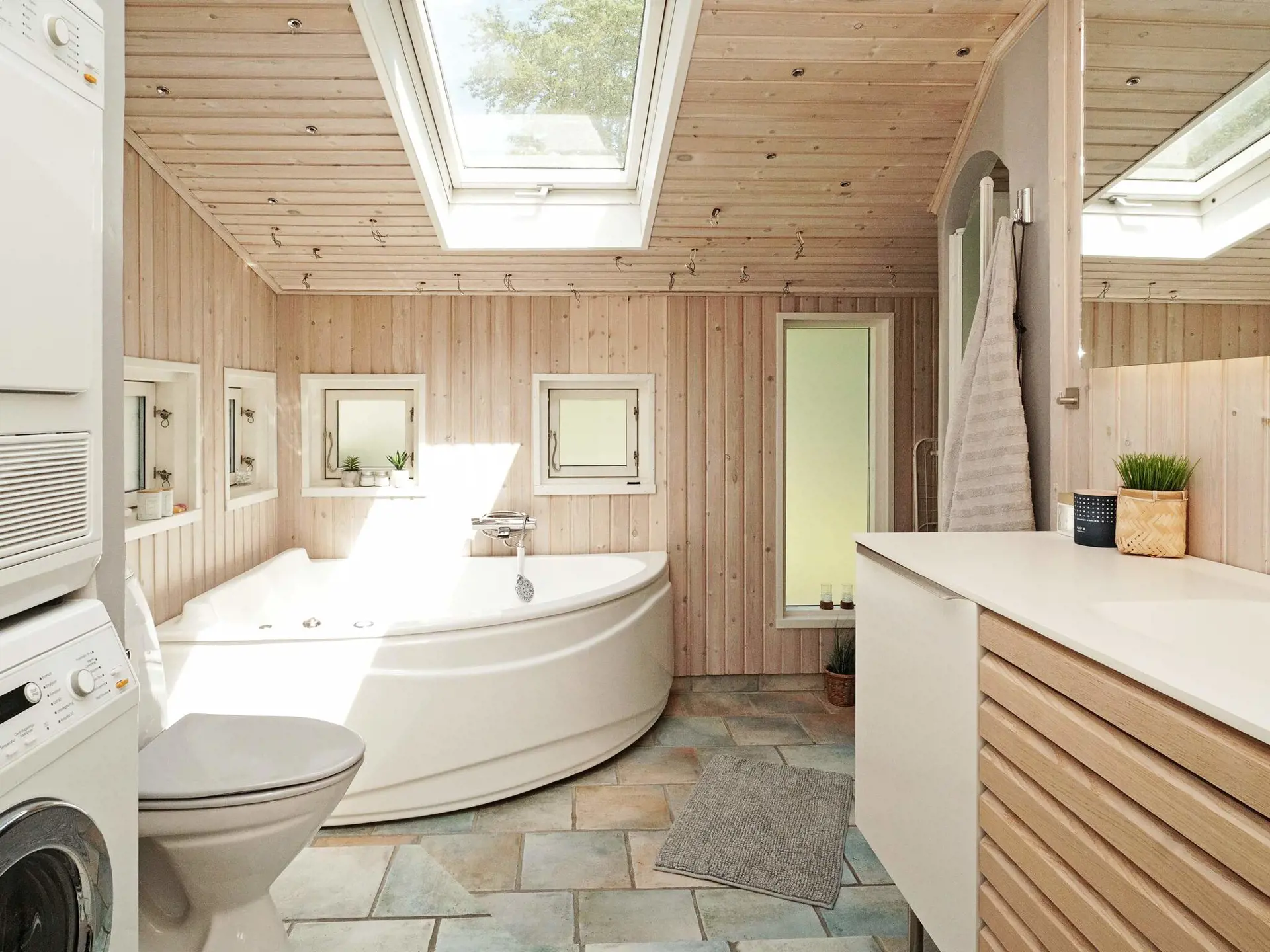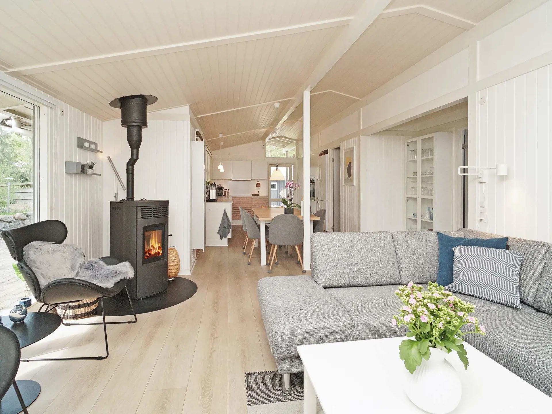 Das Ferienhaus selbst verfügt über zwei Schlafzimmer mit Doppelbett und ein Kinderzimmer mit Etagenbett und Spielzeug. Großes und geräumiges Badezimmer mit Dusche, Whirlpool für zwei Personen und großer Sauna mit Platz für sechs bis acht Personen. Wohnzimmer mit TV, Chromecast und PlayStation3. Offene und helle Küche in Verbindung mit dem Essbereich.