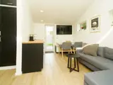 Im separaten Annex gibt es einen Aufenthaltsbereich mit TV, kleiner Teeküche, Holzofen und doppelter Schlafcouch. Dazu ein Schlafzimmer mit Doppelbett und ein Hems für Kinder.