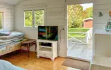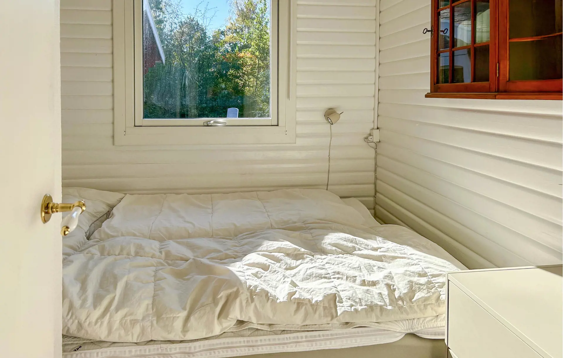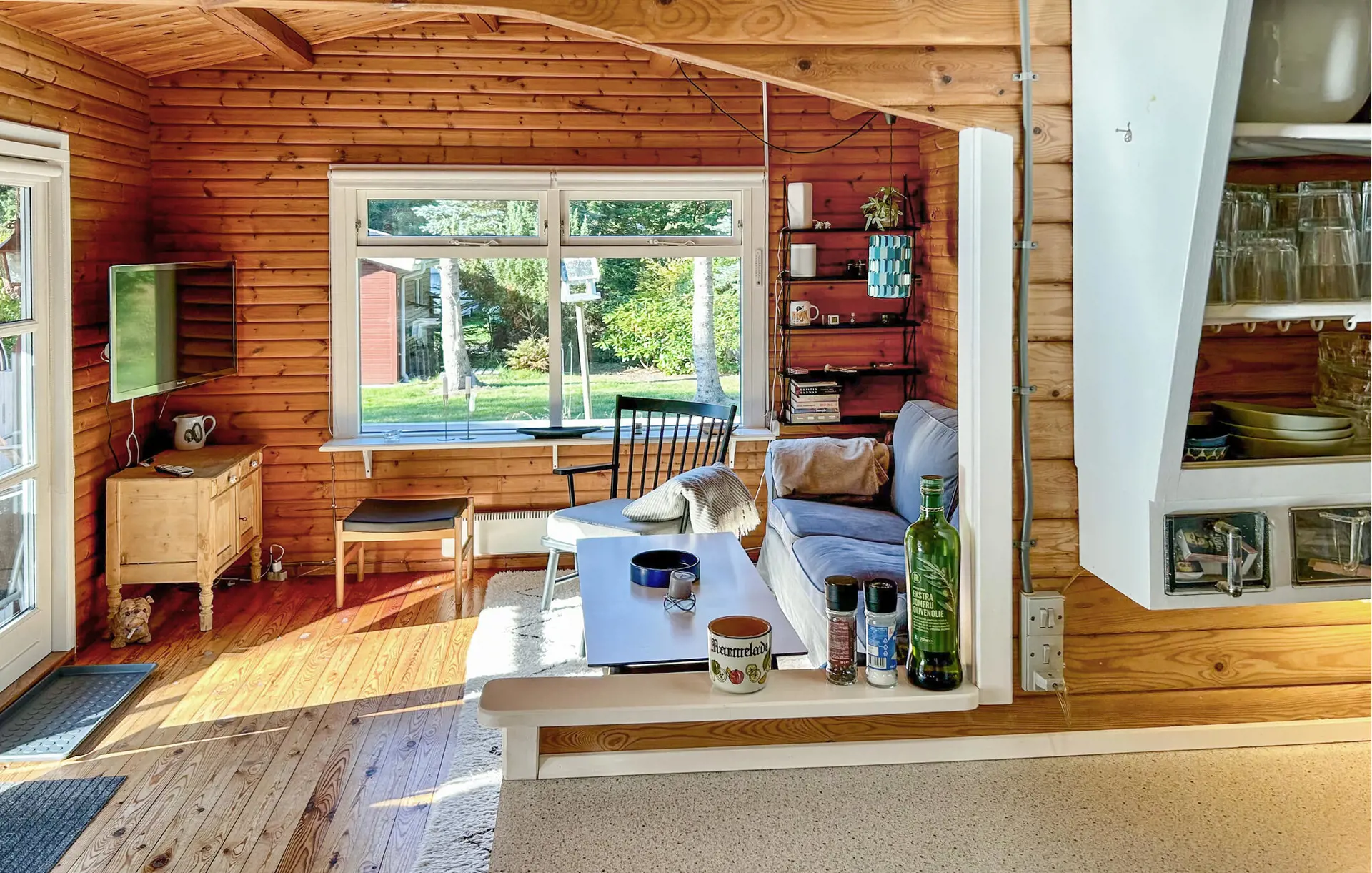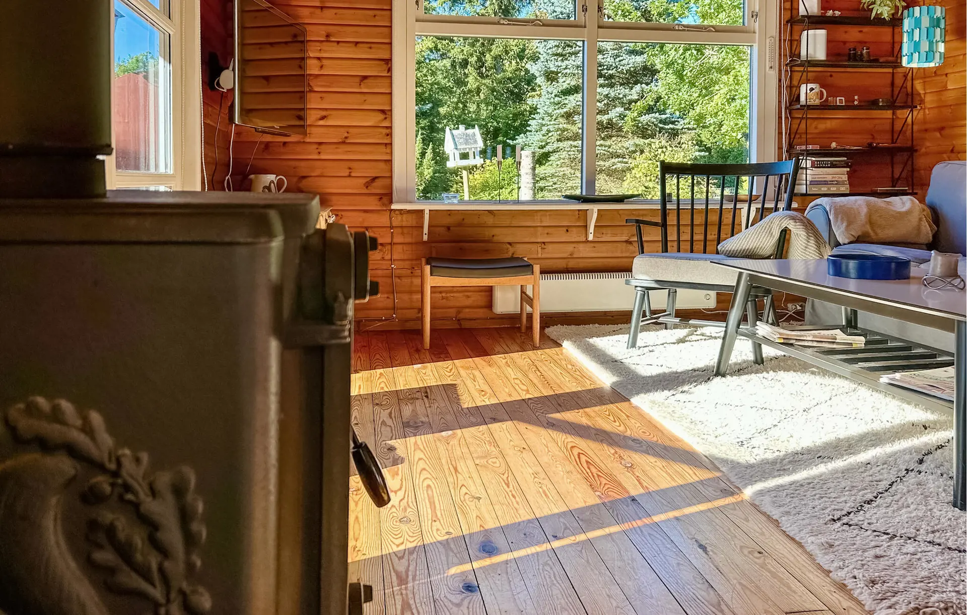 Umgeben von Bäumen und Natur bietet dieses Ferienhaus die ideale Kulisse für Familien, die Ruhe, Gemeinschaft und Nähe zum Meer suchen. Lassen Sie sich von der warmen Atmosphäre des Innenraums empfangen. Das helle Holz an Wänden und Decke schafft Gemütlichkeit, während große Fenster den Blick in den Garten öffnen. Machen Sie es sich auf dem bequemen Sofa vor dem Kaminofen gemütlich oder genießen Sie gemeinsame Mahlzeiten am Esstisch mit Ausblick ins Grüne. Die kompakte Küche bietet Ihnen die Möglichkeit, unkomplizierte Feriengerichte zuzubereiten.