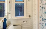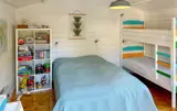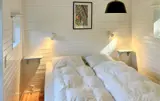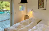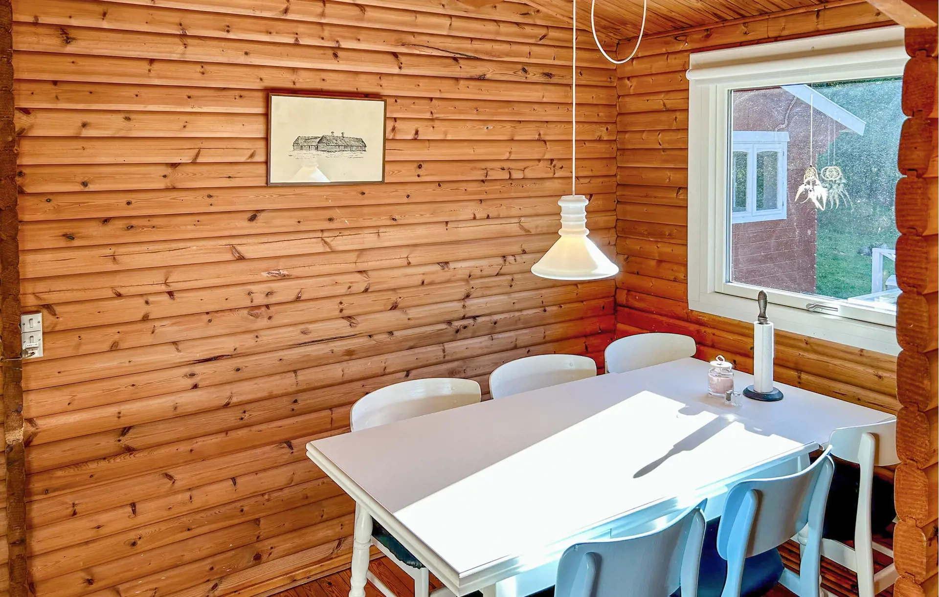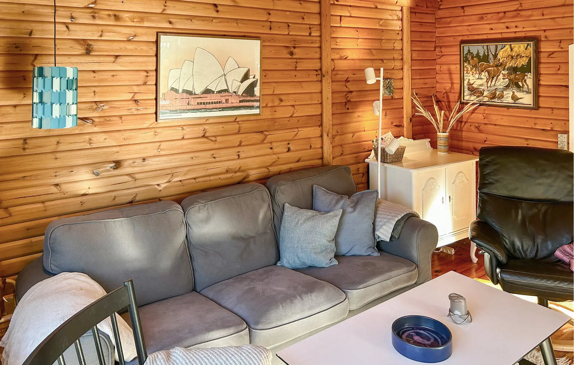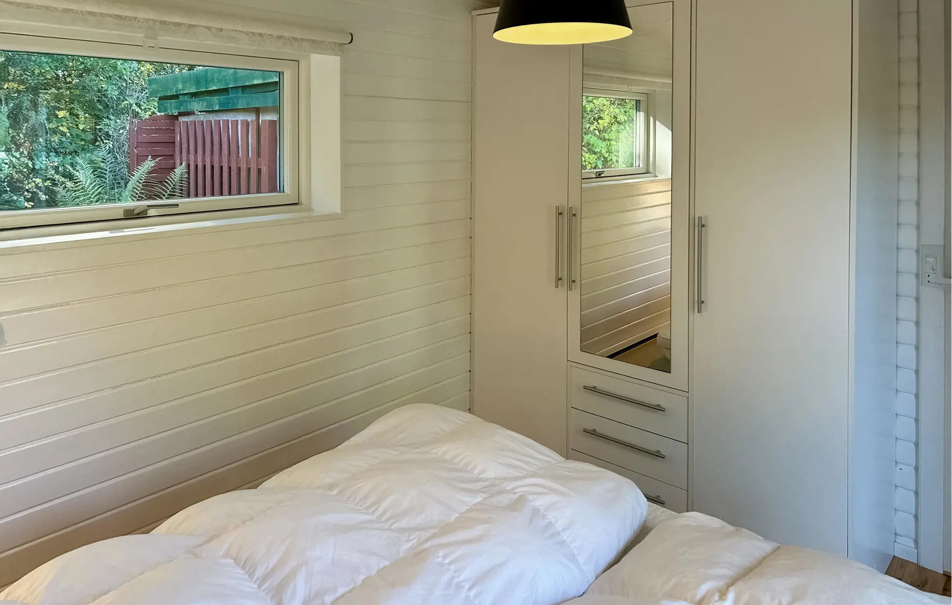 Umgeben von Bäumen und Natur bietet dieses Ferienhaus die ideale Kulisse für Familien, die Ruhe, Gemeinschaft und Nähe zum Meer suchen. Lassen Sie sich von der warmen Atmosphäre des Innenraums empfangen. Das helle Holz an Wänden und Decke schafft Gemütlichkeit, während große Fenster den Blick in den Garten öffnen. Machen Sie es sich auf dem bequemen Sofa vor dem Kaminofen gemütlich oder genießen Sie gemeinsame Mahlzeiten am Esstisch mit Ausblick ins Grüne. Die kompakte Küche bietet Ihnen die Möglichkeit, unkomplizierte Feriengerichte zuzubereiten.