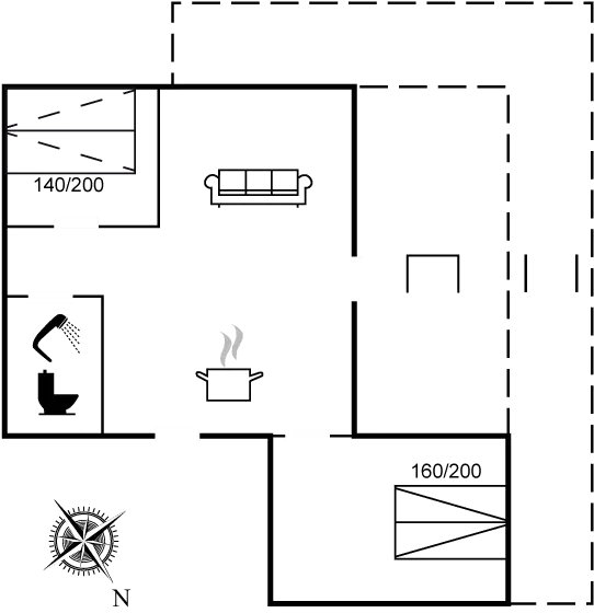 Das Ferienhaus ist mit einer gemütlichen Wohnküche eingerichtet, die in das Wohnzimmer übergeht. Von hier hast du Zugang zu einer schönen, teilweise überdachten Holzterrasse. Es gibt zwei Schlafzimmer – eines mit Doppelbett und eines mit einer Doppelschlafcouch. Das Badezimmer verfügt über eine Duschnische und Fußbodenheizung.
