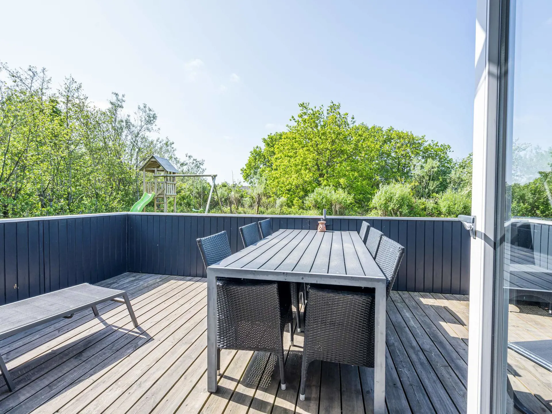 Zusätzliches, geräumiges Wohnzimmer mit Sofa und Esstisch und Stühlen für 6 Personen. Von hier aus gibt es Zugang zu einer schönen und komplett umschlossenen Holzterrasse.