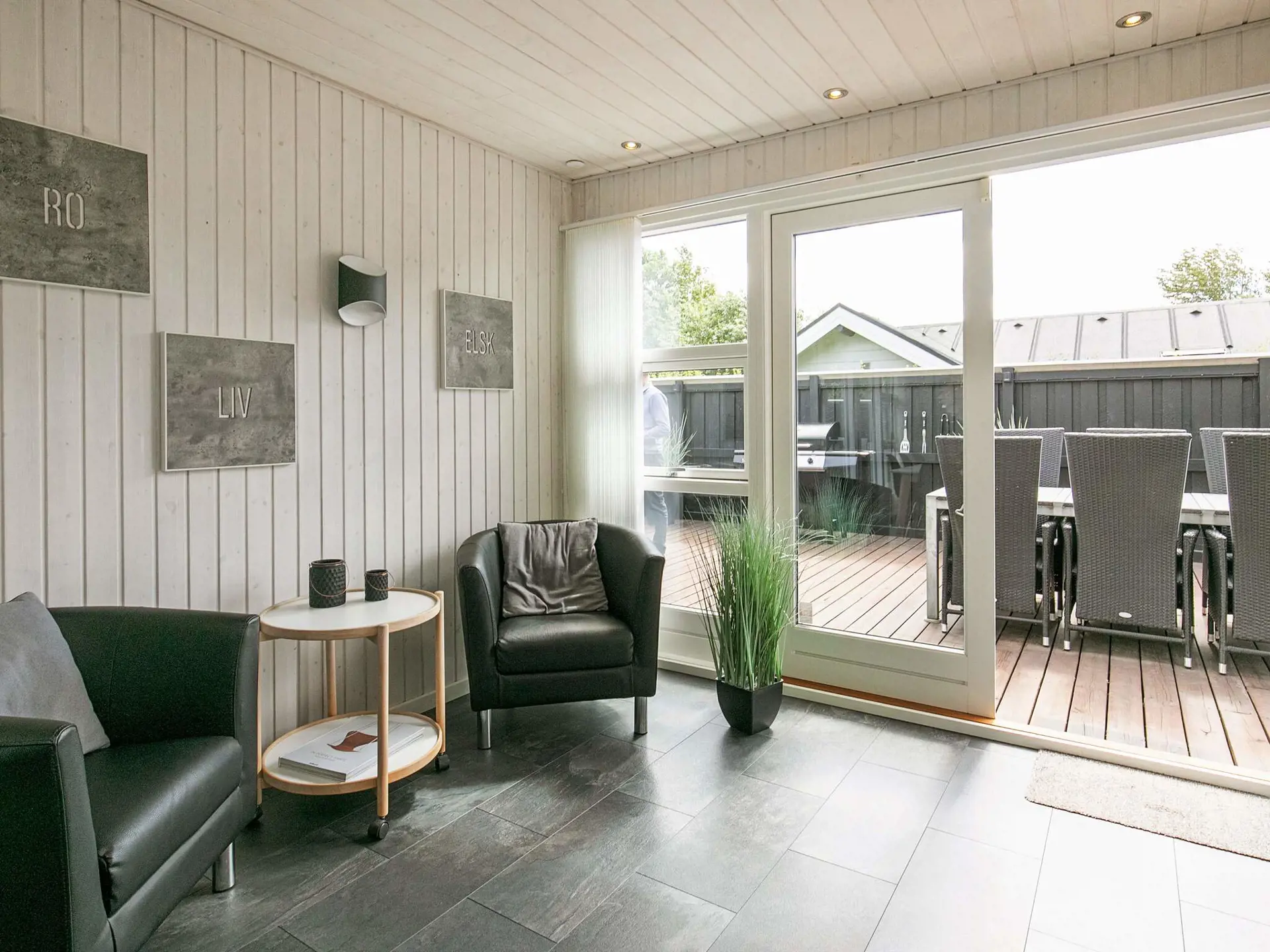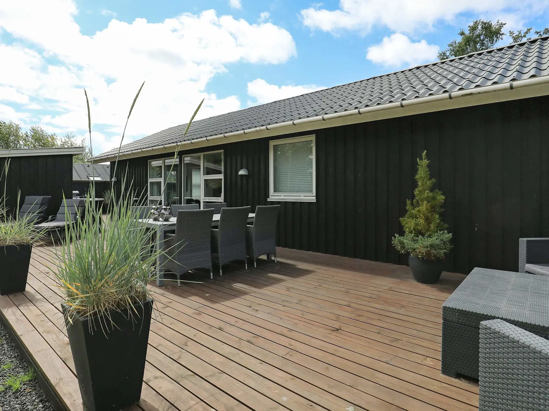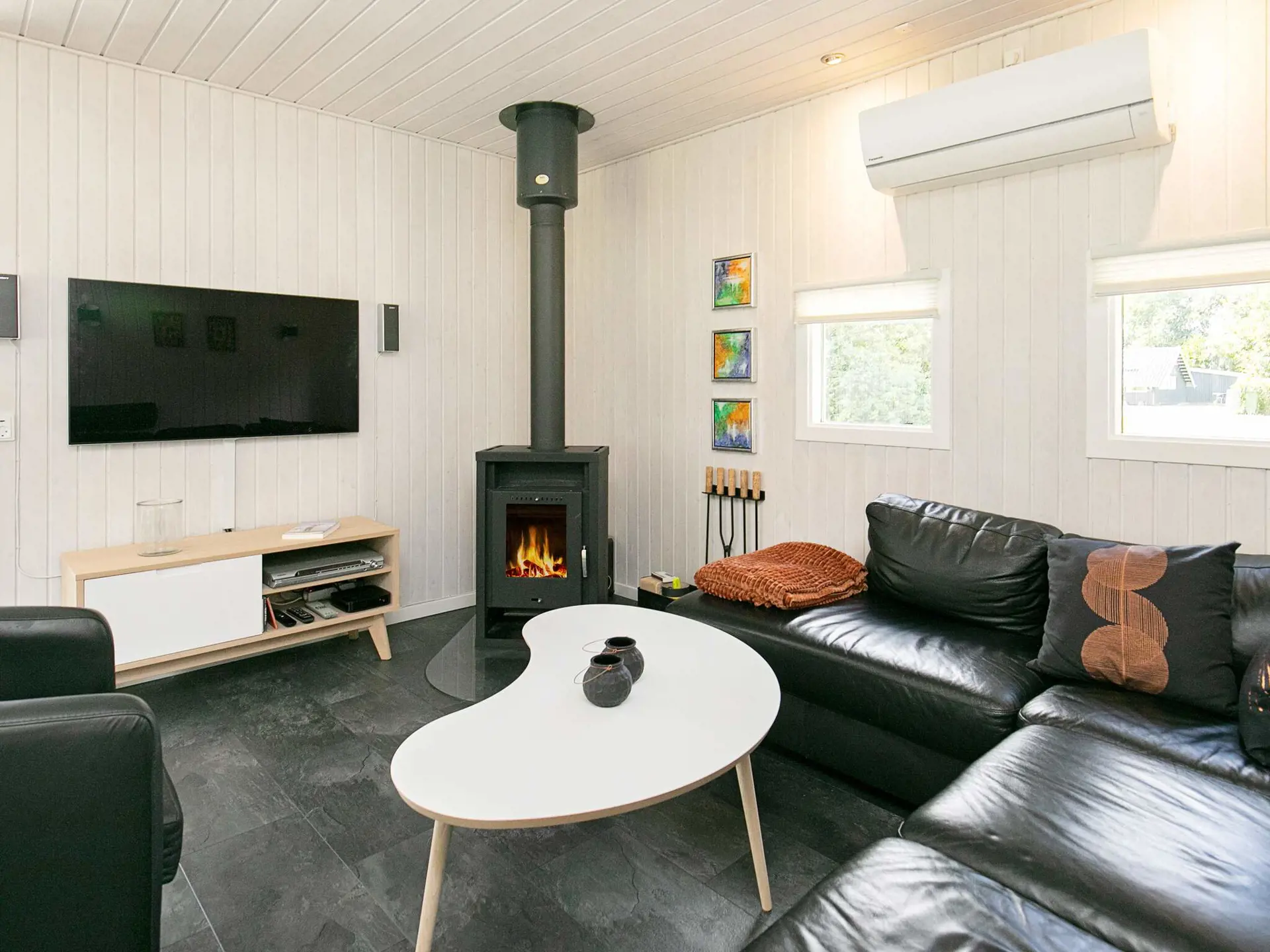 Im geräumigen Inneren des Ferienhauses steht alles für einen entspannten Aufenthalt mit bis zu sechs Personen bereit. Das Haus wird, wenn nötig, mittels einer energieeffizienten Luft-Luft-Wärmepumpe sowie elektrischer Heizkörper und Holzofen beheizt. Draußen finden Sie eine nach Osten und Süden ausgerichtete Holzterrasse für sonnige Tage, in völlig ungestörter Lage und mit optimalem Windschutz.