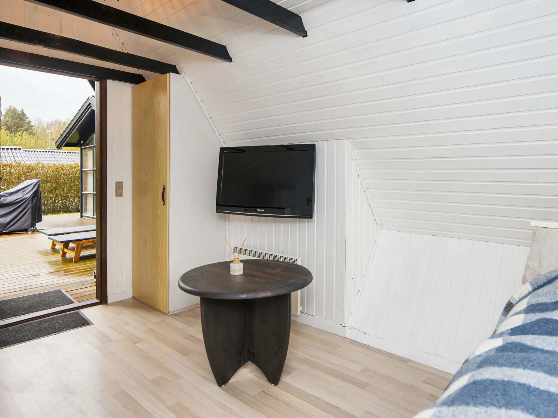 Nebenan im separaten Annex findet man ein Doppelbett, einen Fernseher (nur für streaming vom eigener Gerät) und ein Waschbecken.