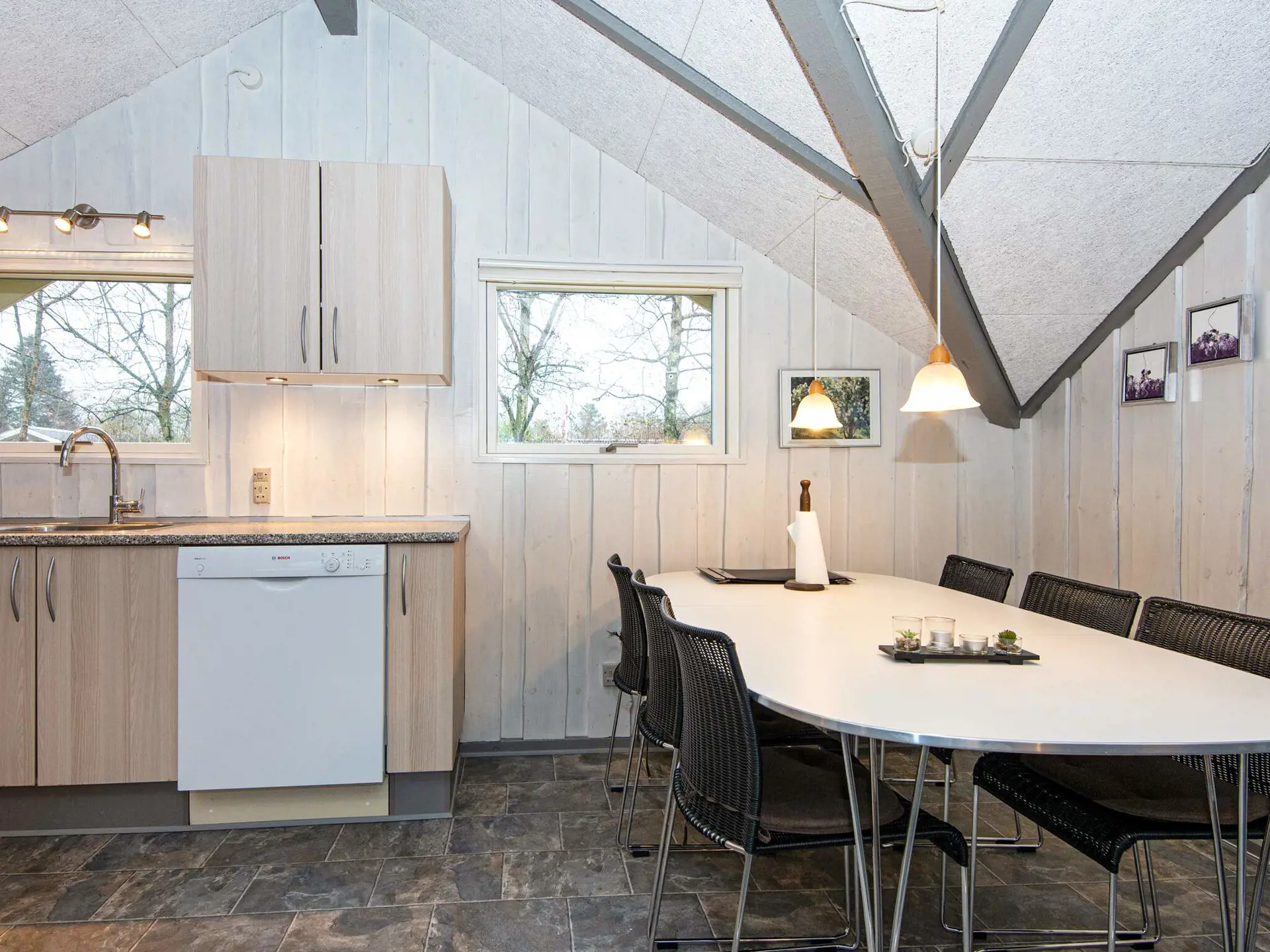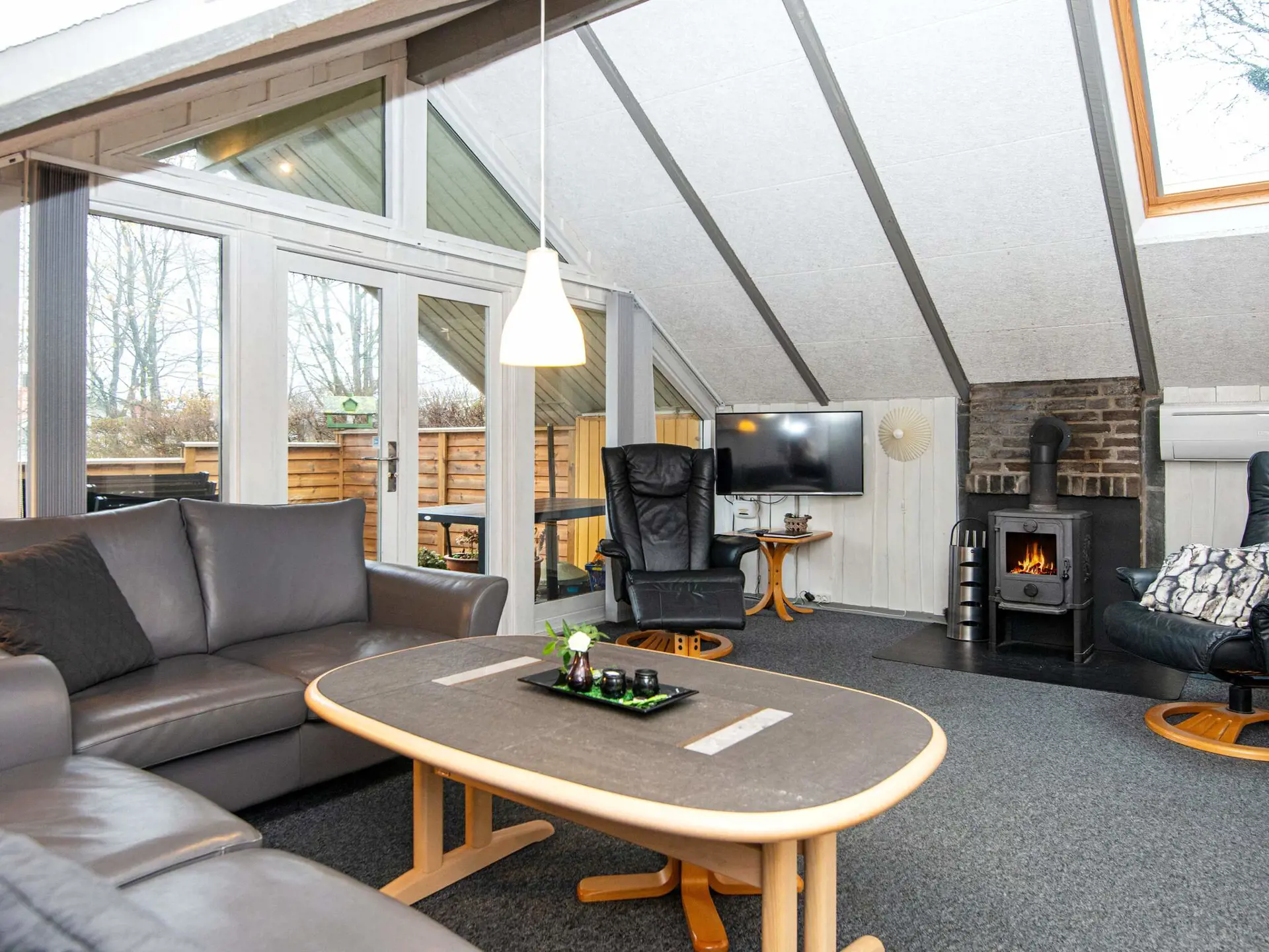 Zur Ausstattung gehört auch eine klimafreundliche Wärmepumpe. Vom Wohnzimmer haben Sie direkten Zugang zu einer nach Süden ausgerichteten Terrassenfläche. Die Lage des Hauses in der Nähe des Fjordes ist besonders attraktiv für Wassersportler wie Surfer aber ebenso für Naturliebhaber.