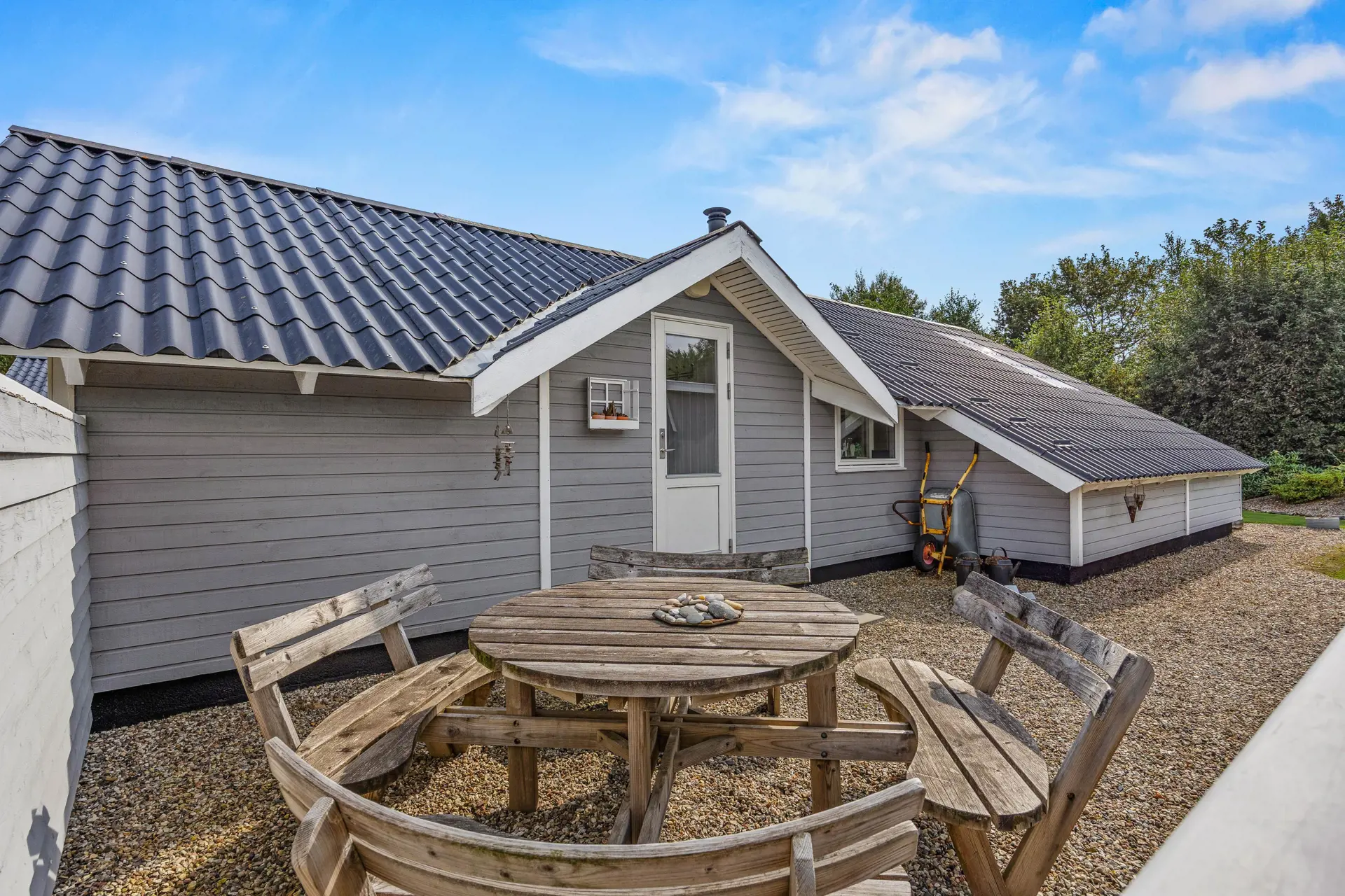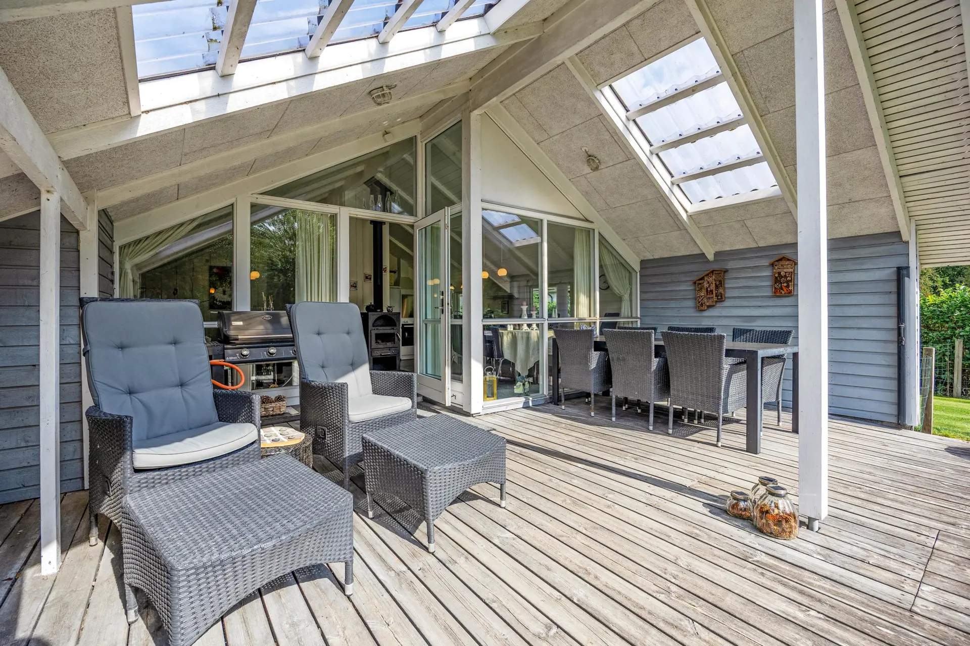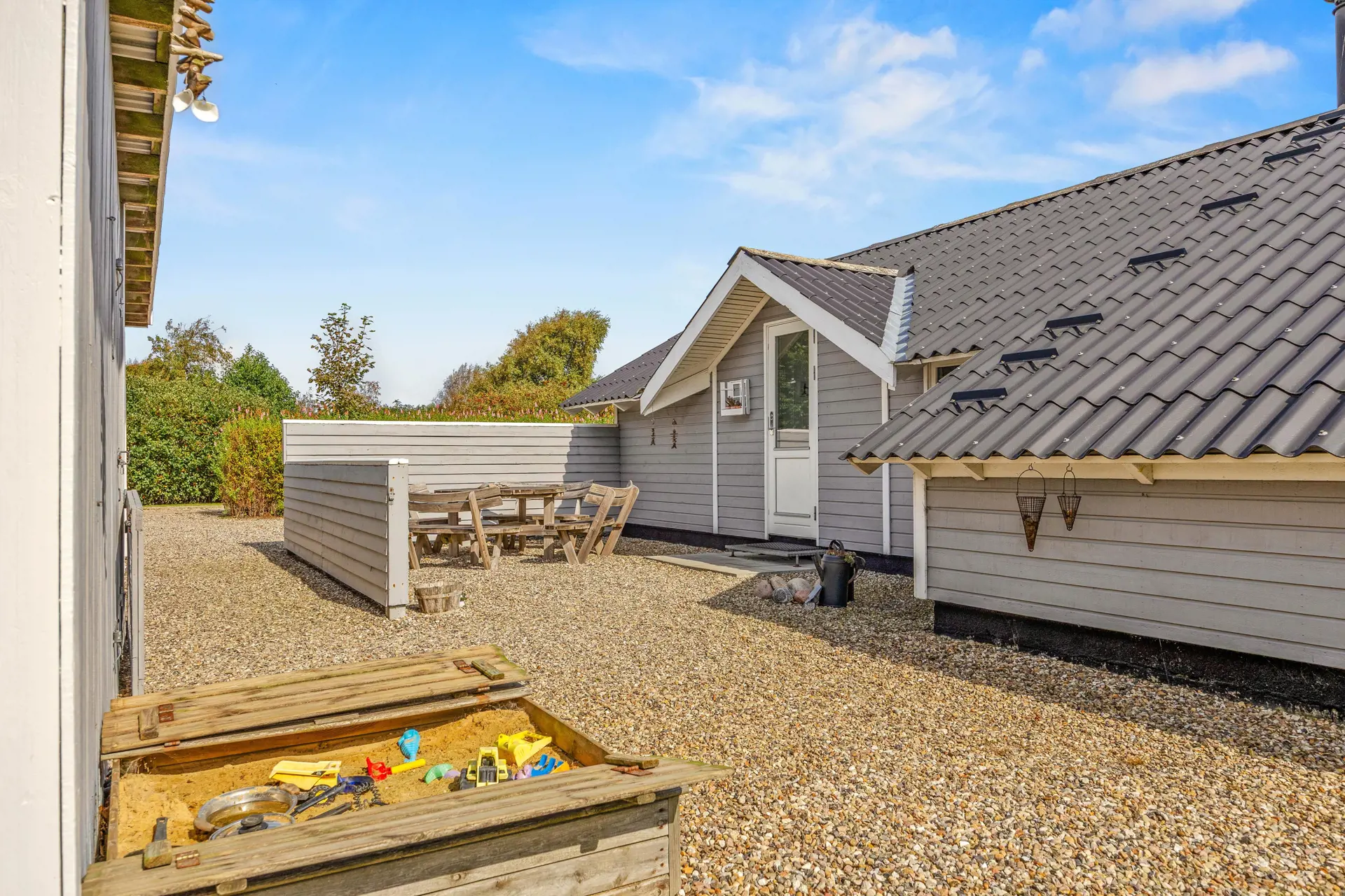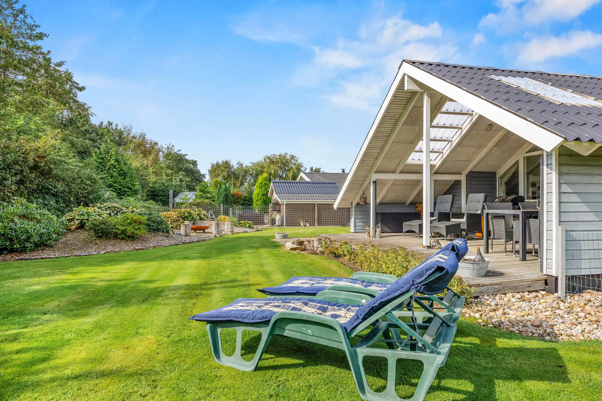 Das gepflegte Ferienhaus ist von einem großzügigen, 704 qm großen Gartengrundstück umgeben, das zahlreiche Möglichkeiten zur Freizeitgestaltung bietet. Hier findet Ihr einen Gasgrill für gemütliche Grillabende sowie Gartenmöbel und Sonnenliegen, die auf der teils überdachten Terrasse zum Verweilen einladen.