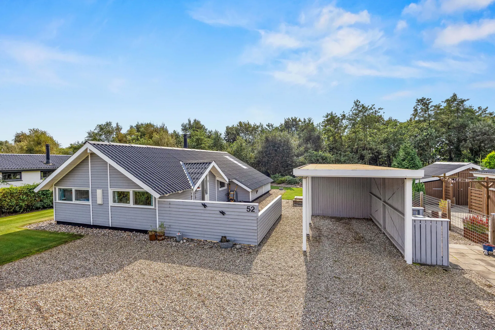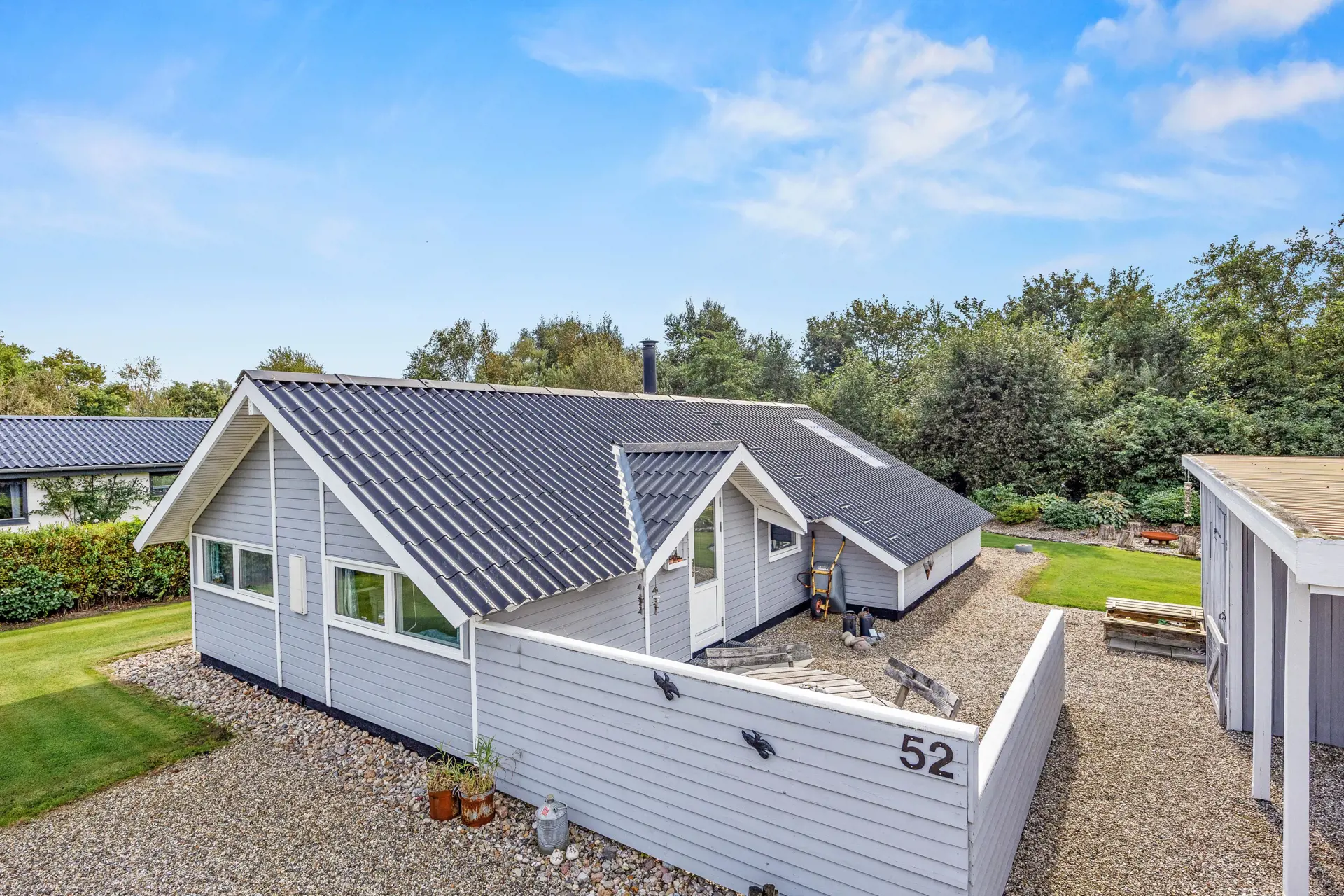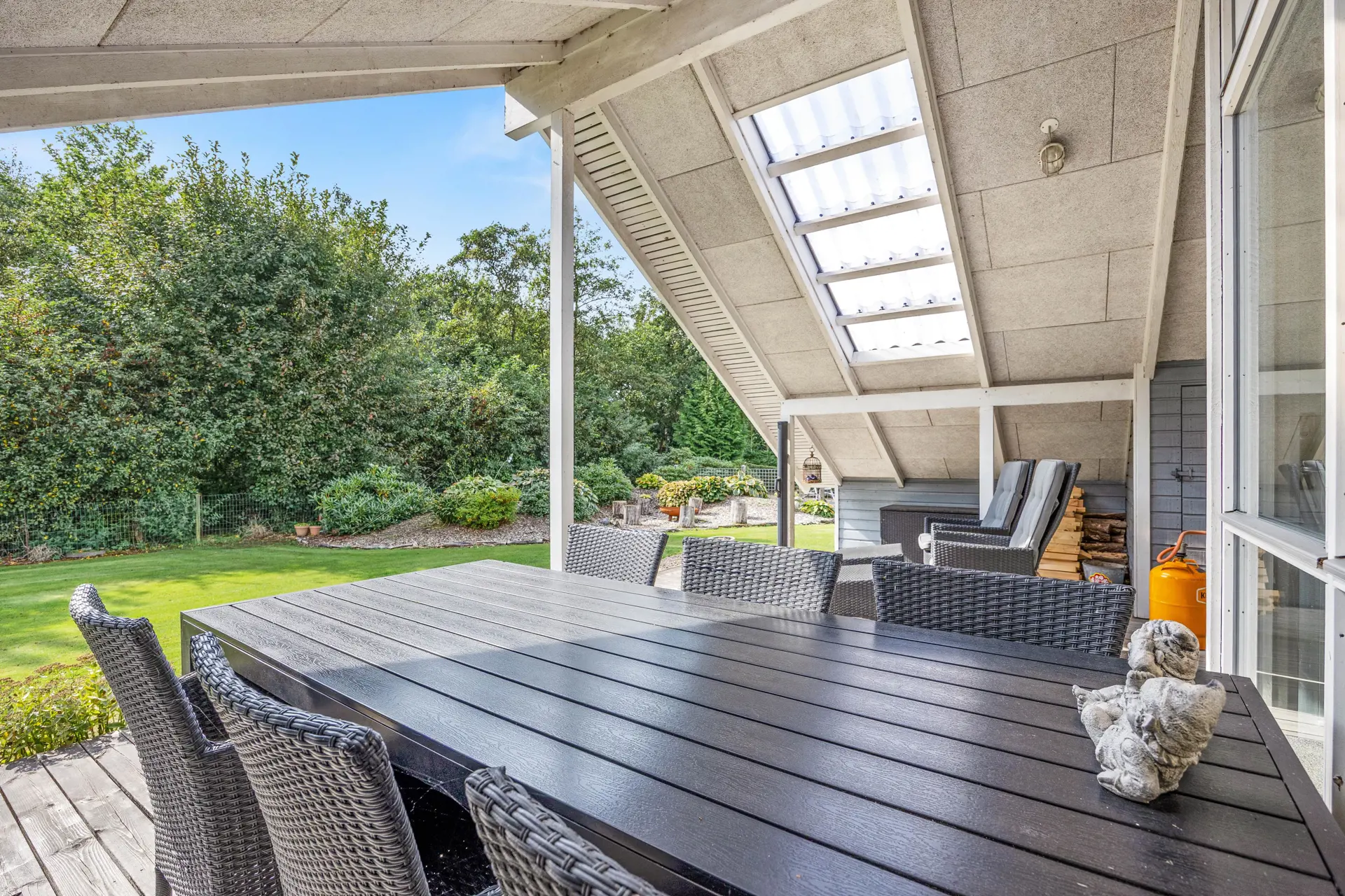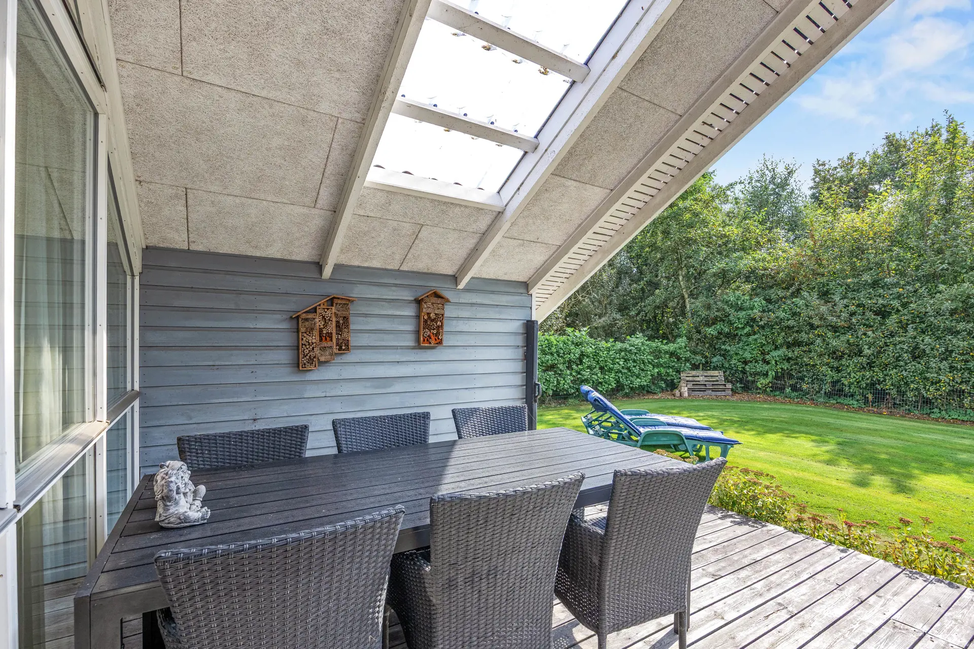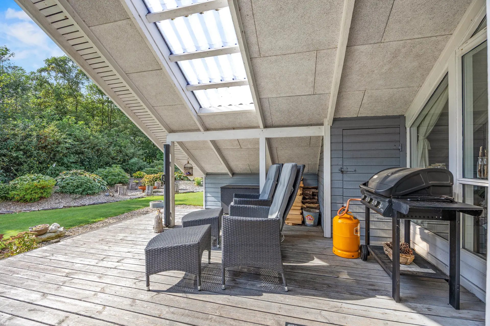 Das gepflegte Ferienhaus ist von einem großzügigen, 704 qm großen Gartengrundstück umgeben, das zahlreiche Möglichkeiten zur Freizeitgestaltung bietet. Hier findet Ihr einen Gasgrill für gemütliche Grillabende sowie Gartenmöbel und Sonnenliegen, die auf der teils überdachten Terrasse zum Verweilen einladen.