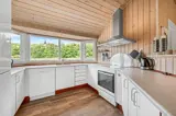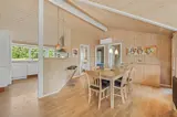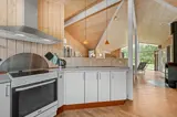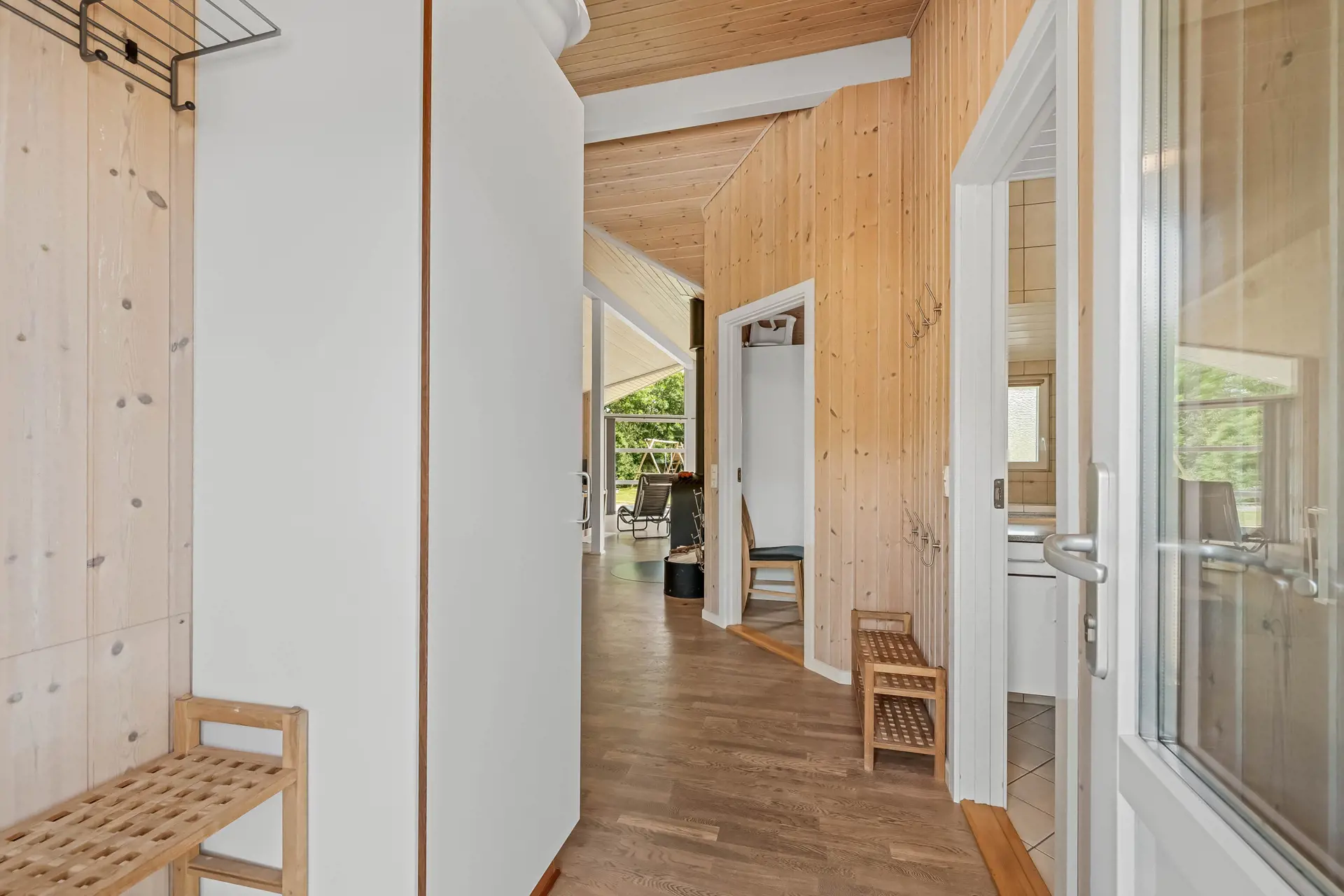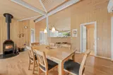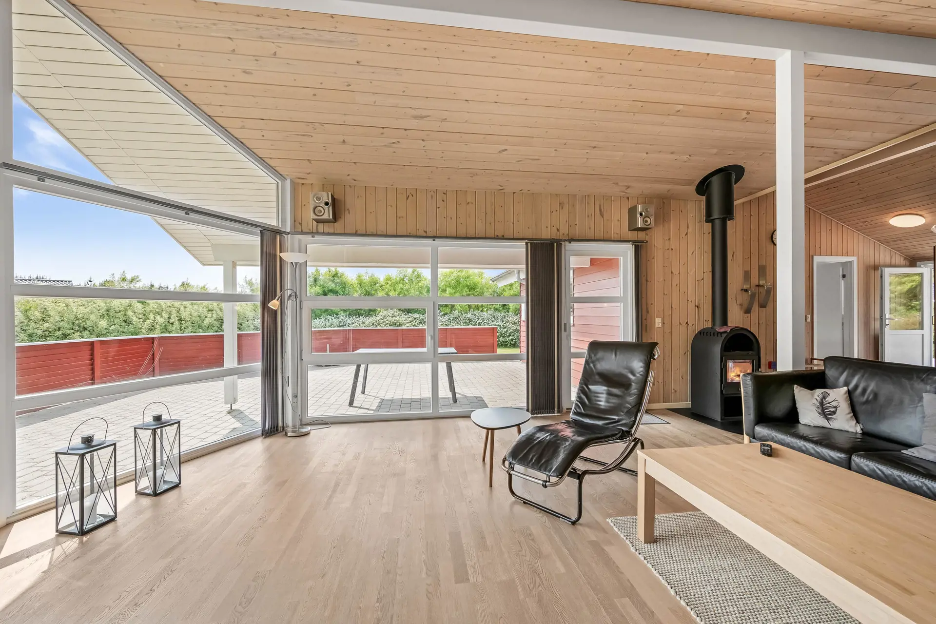 Das Zentrum des Ferienhauses bildet der schöne offene Wohnbereich mit großer Fensterfront, der viel natürliches Licht hereinlässt. Helle Holzdecken und ein pflegeleichter Holzfußboden verleihen dem Raum eine freundliche, einladende Atmosphäre.