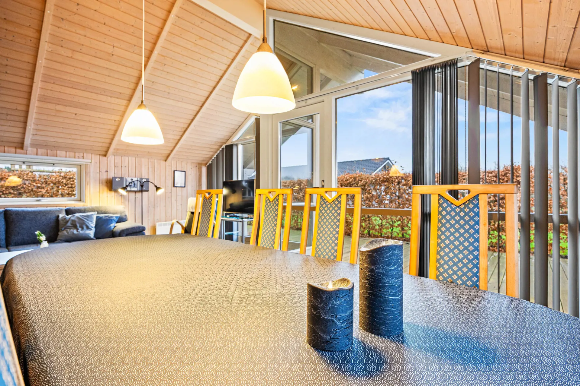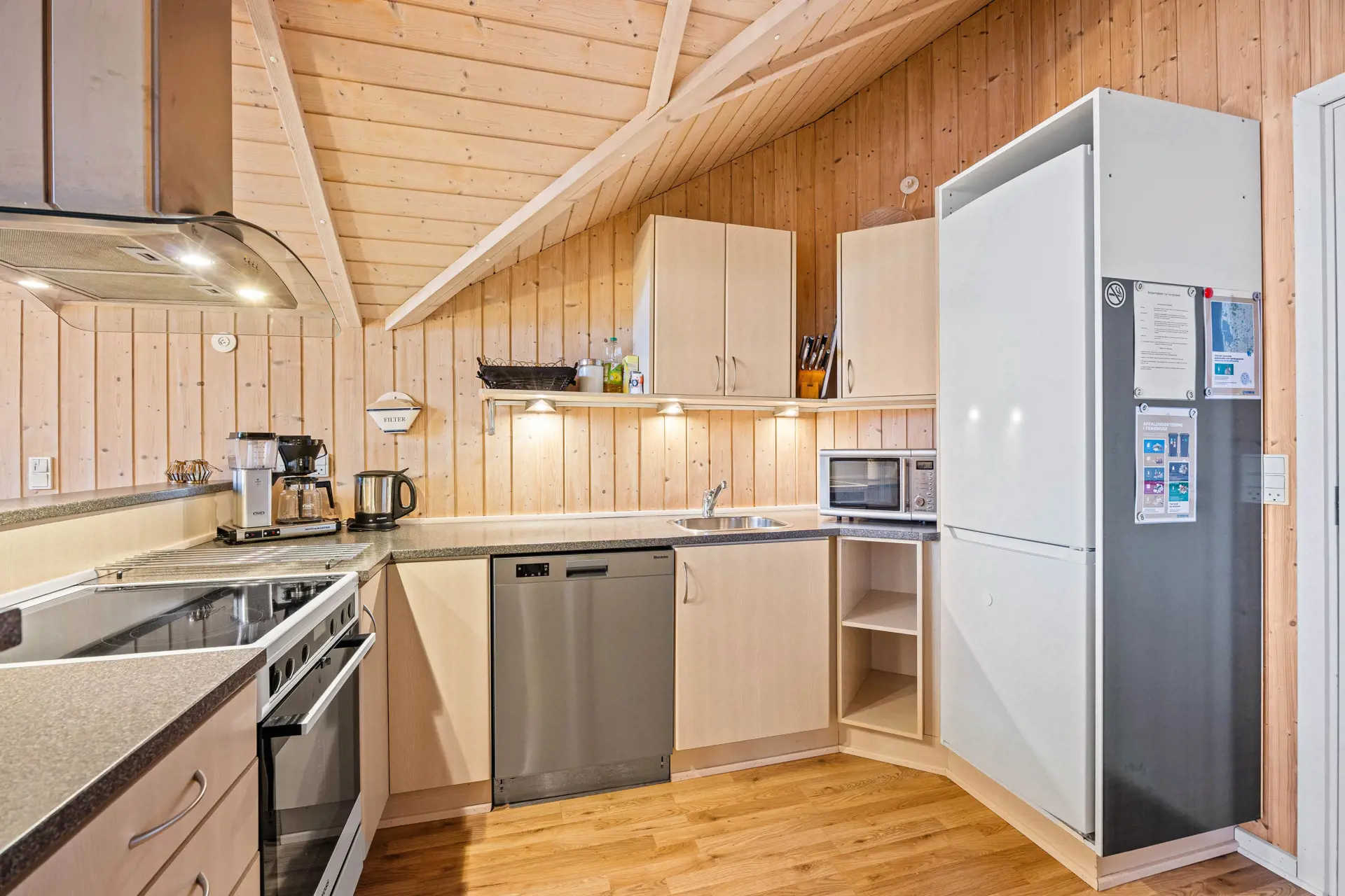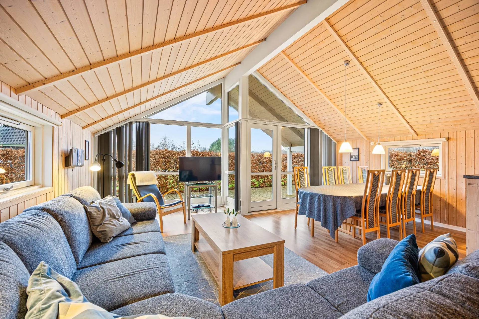 Im Ferienhaus steht der helle, freundliche Wohnraum im Mittelpunkt, der Wohnzimmer, Küche und Esszimmer miteinander verbindet. Der großzügige Wohnraum besticht durch seine helle Holzoptik, die hohen Decken und die Einrichtung in schönen Naturtönen. Eine große Fensterfront lässt viel natürliches Licht herein und öffnet den Blick ins Grüne.