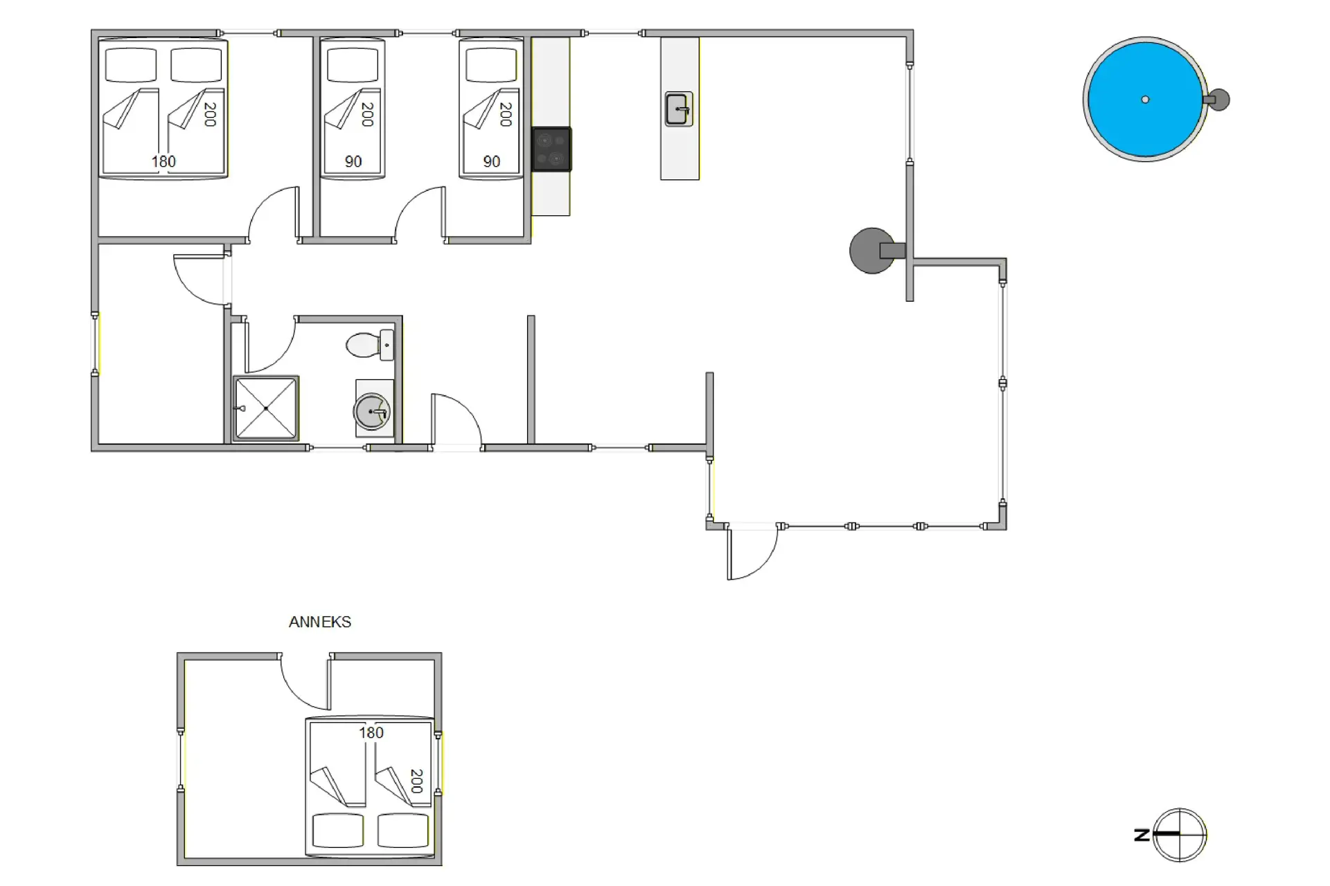 Außerdem verfügt das Ferienhaus über ein kleines Badezimmer mit Fußbodenheizung, das sicherstellt, dass ihr alle Einrichtungen habt, die ihr benötigt. Mit 6 Schlafplätzen, verteilt auf 2 Schlafzimmer im Haus sowie eines im Anbau, haben alle Familienmitglieder die Möglichkeit, sich zurückzuziehen und eine erholsame Nacht in ruhiger Umgebung zu genießen.